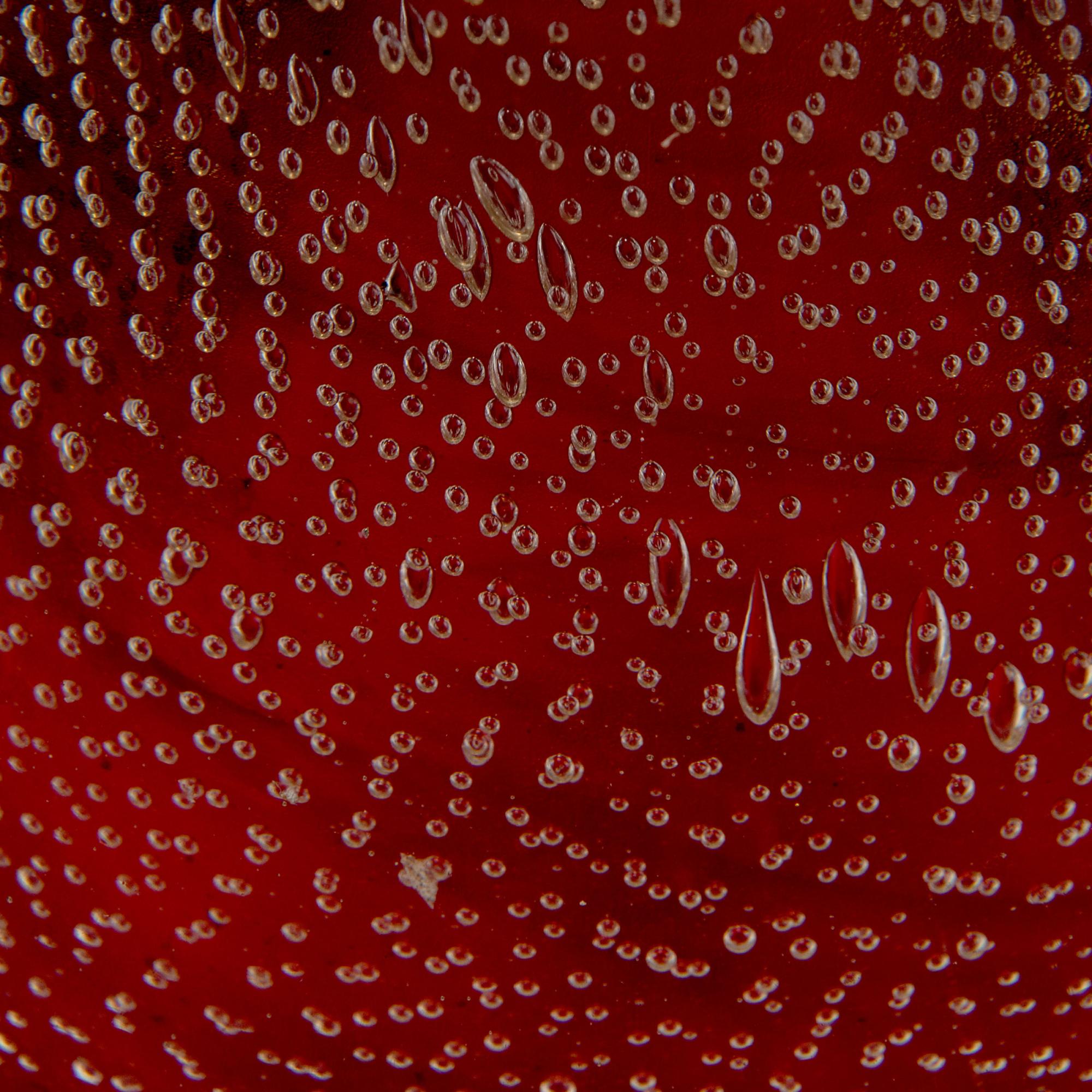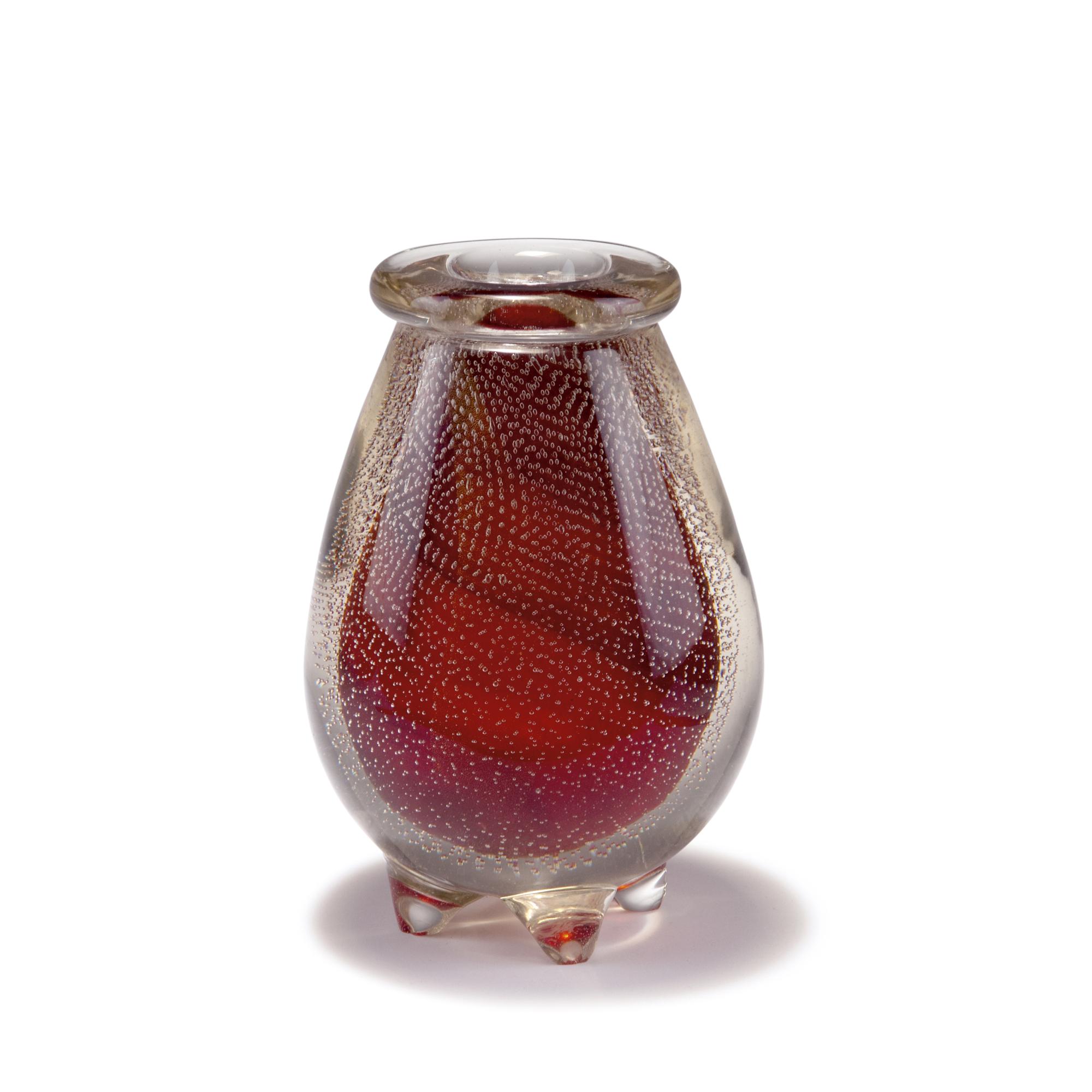 Flavio Poli. 'Bullicante' vase, c1939. H. 25 cm. Made by Seguso Vetri d'Arte. Cased glass, clear and red with burst gold foil and pricked air bubbles.