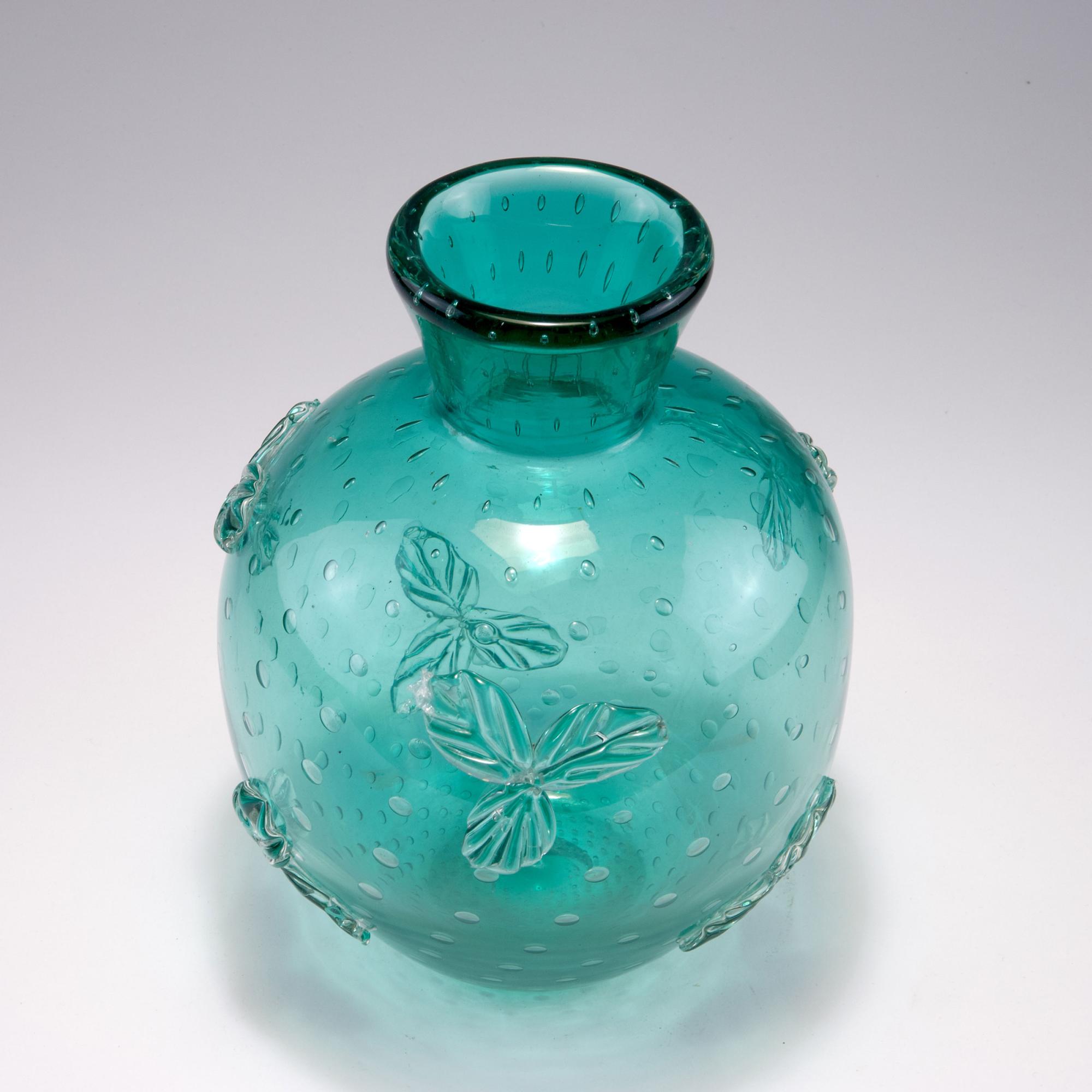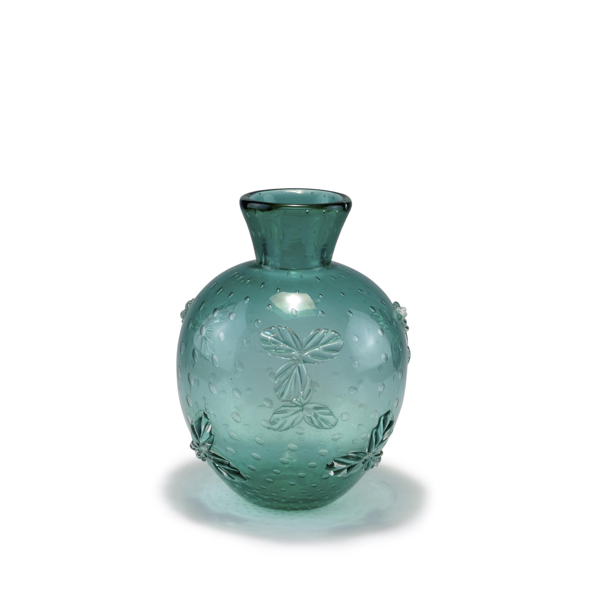 Flavio Poli. Vase, c1939. H. 30.5 cm. Made by Seguso Vetri d'Arte. Cased glass, clear and green, pricked air bubbles. Six applied leaves.