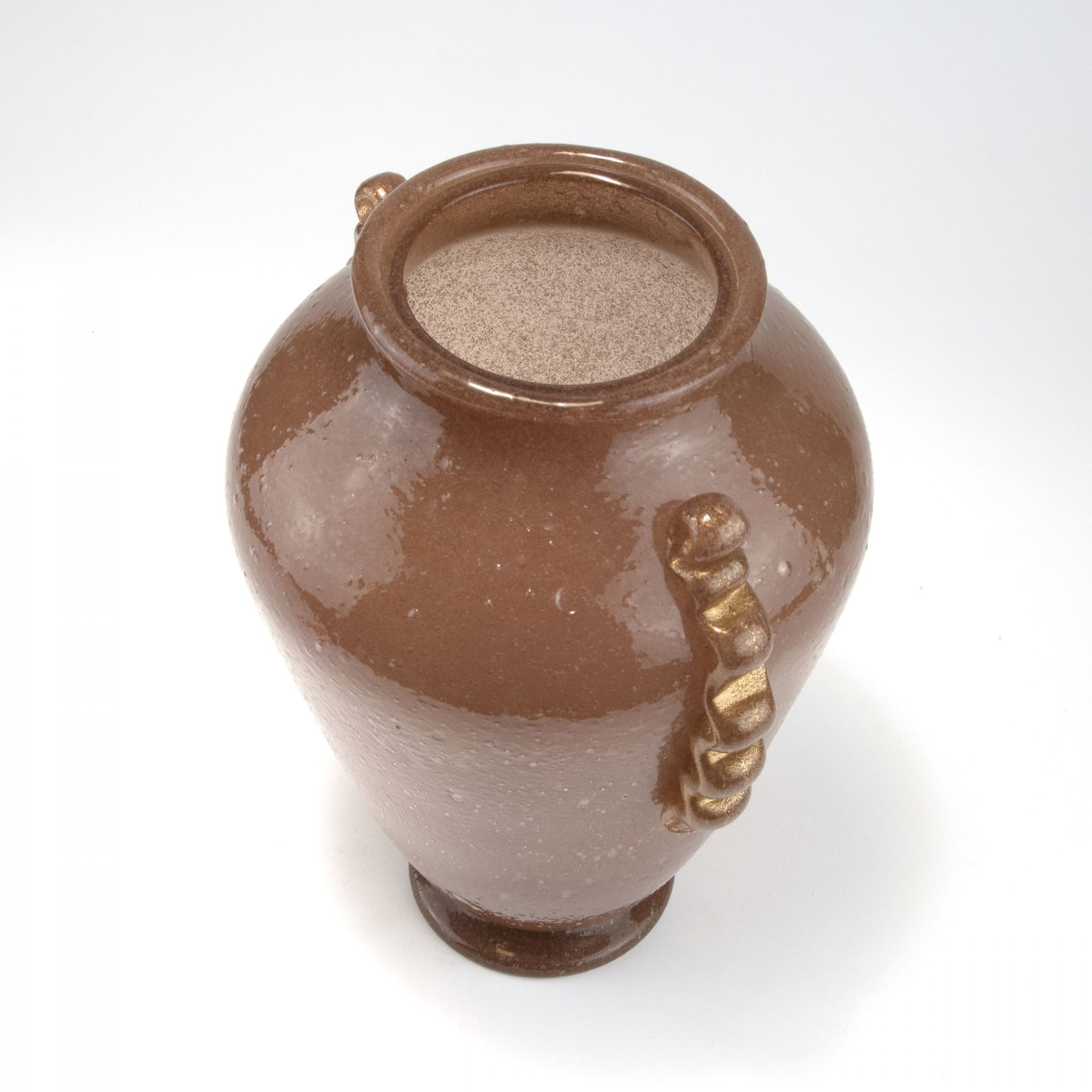 Napoleone Martinuzzi. 'Pulegoso' vase, c1932. H. 32 cm. Made by Zecchin-Martinuzzi. Pale brown, bubbly glass. Handles with fused gold foil.