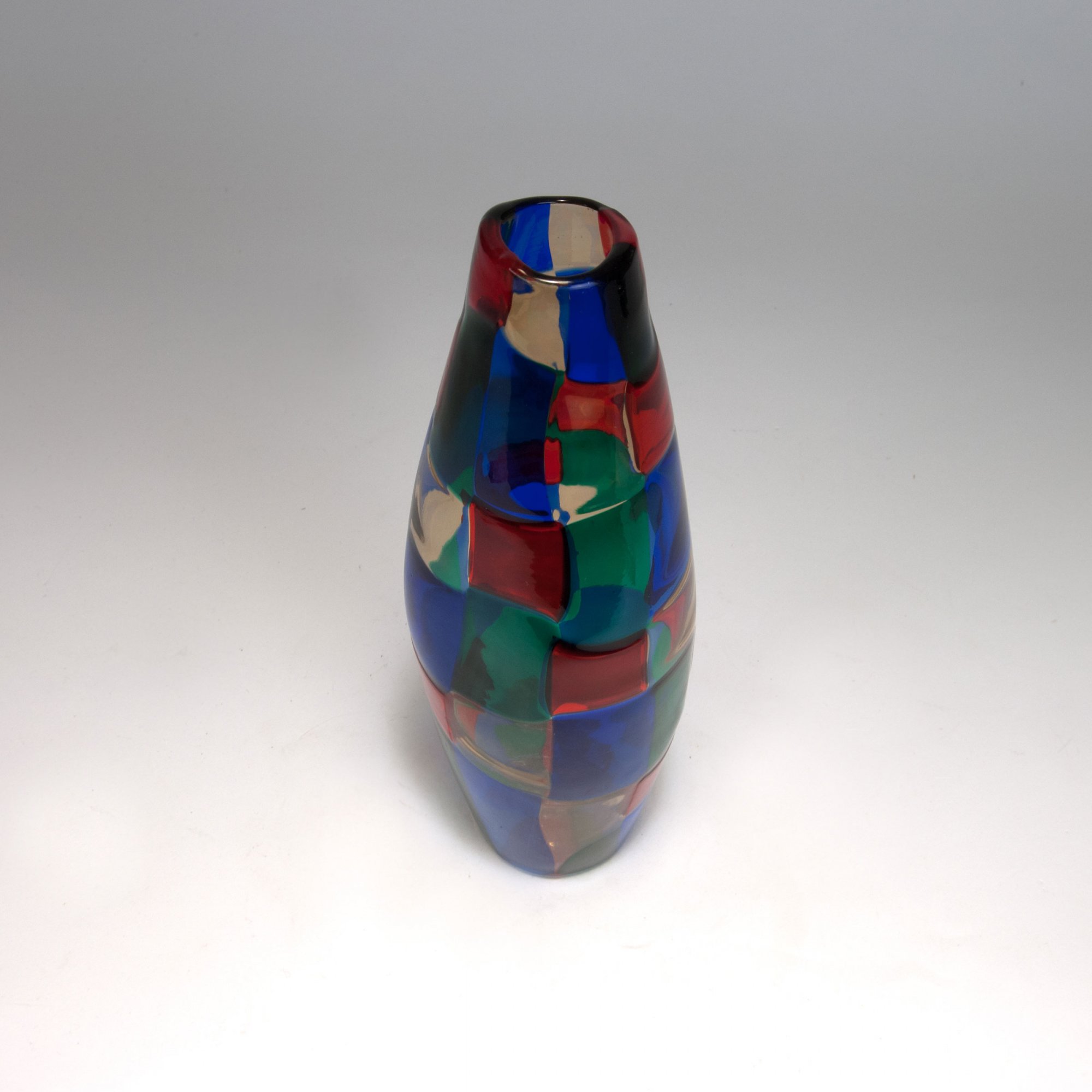 Fulvio Bianconi. 'Pezzato' vase, c1951. H. 28.3 cm. Made by Venini & C. Fused platelets, red, blue, green and clear. Marked: venini murano ITALIA (acid stamp).