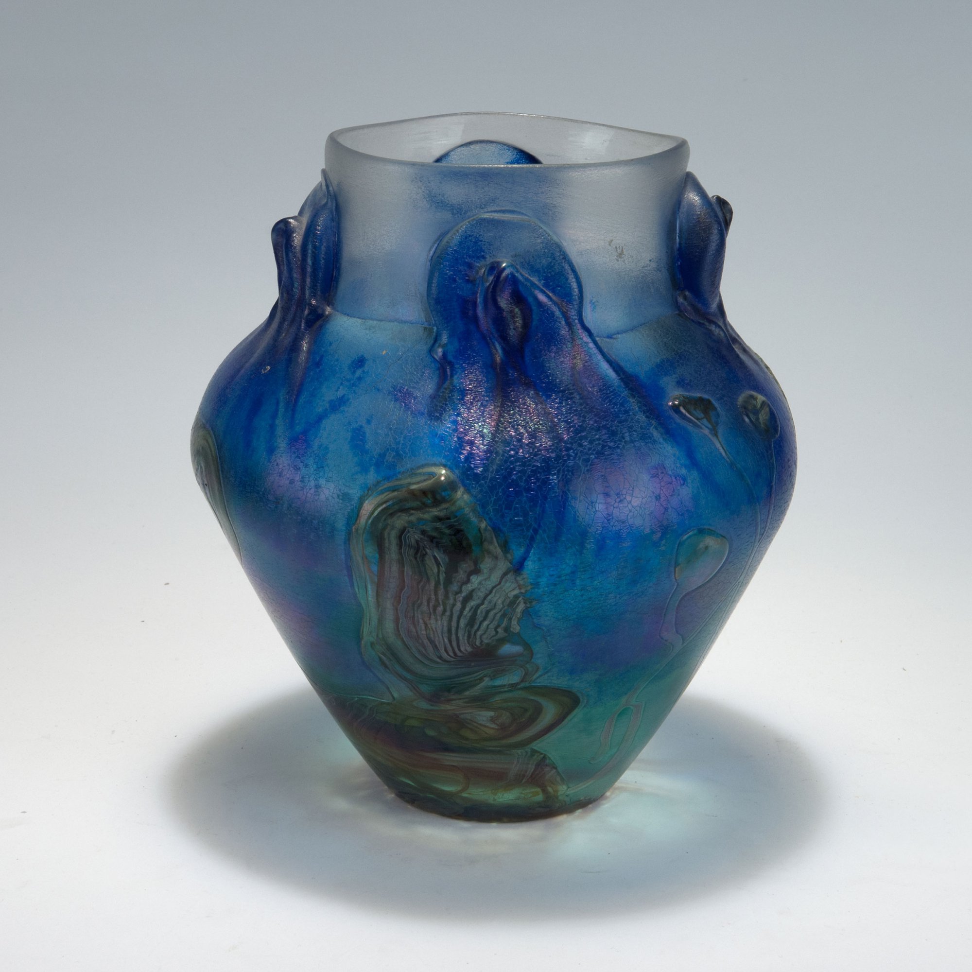 Jean-Claude Novaro. Vase, 1985. H. 24.7 cm. Cased glass, clear, blue powder inclusions, reliefed applications, fused pattern with buds and leaves, combed threads of opaque greenish oxides, surface with strong matt petrol lustre. Signed: Novaro, sc NOVARO 1985.