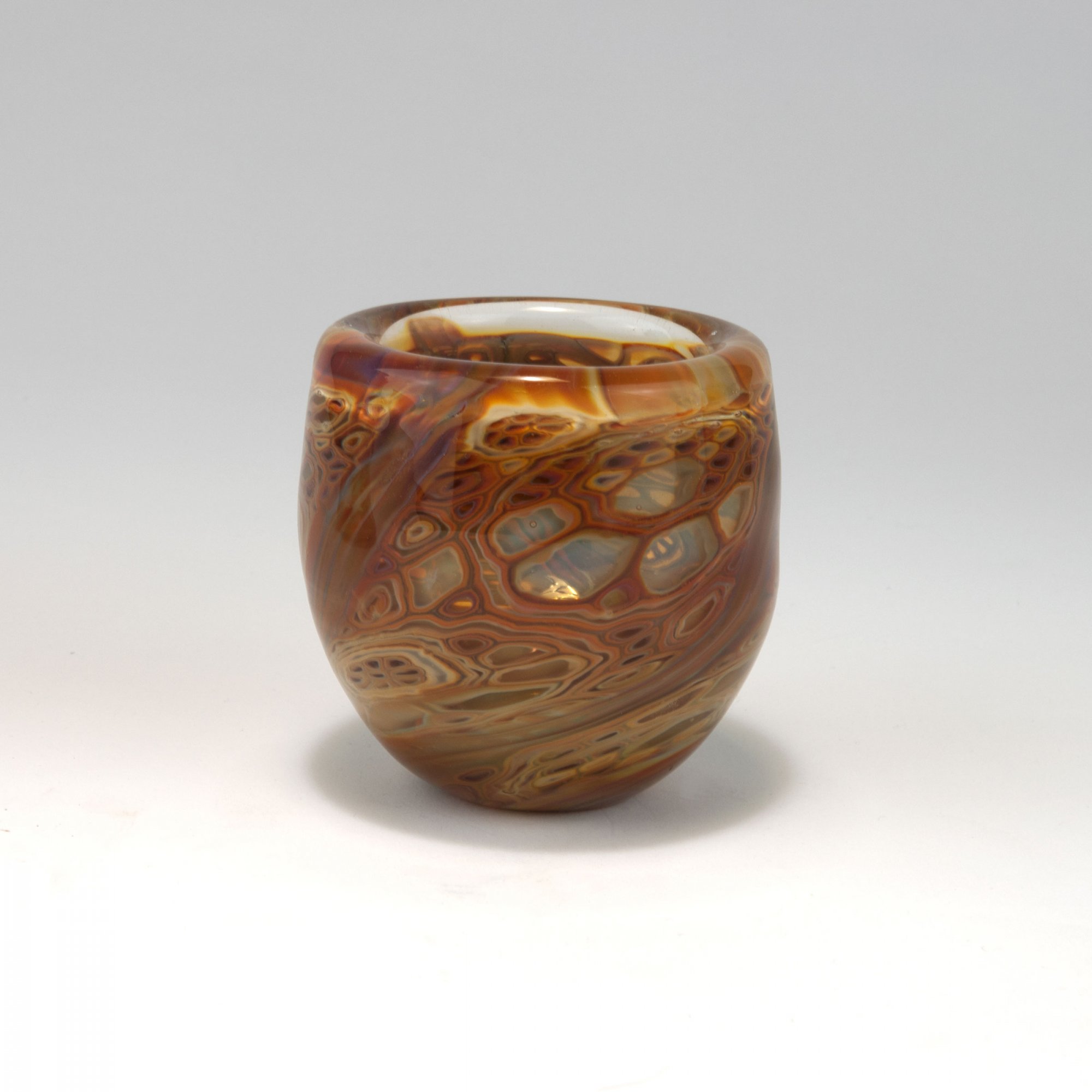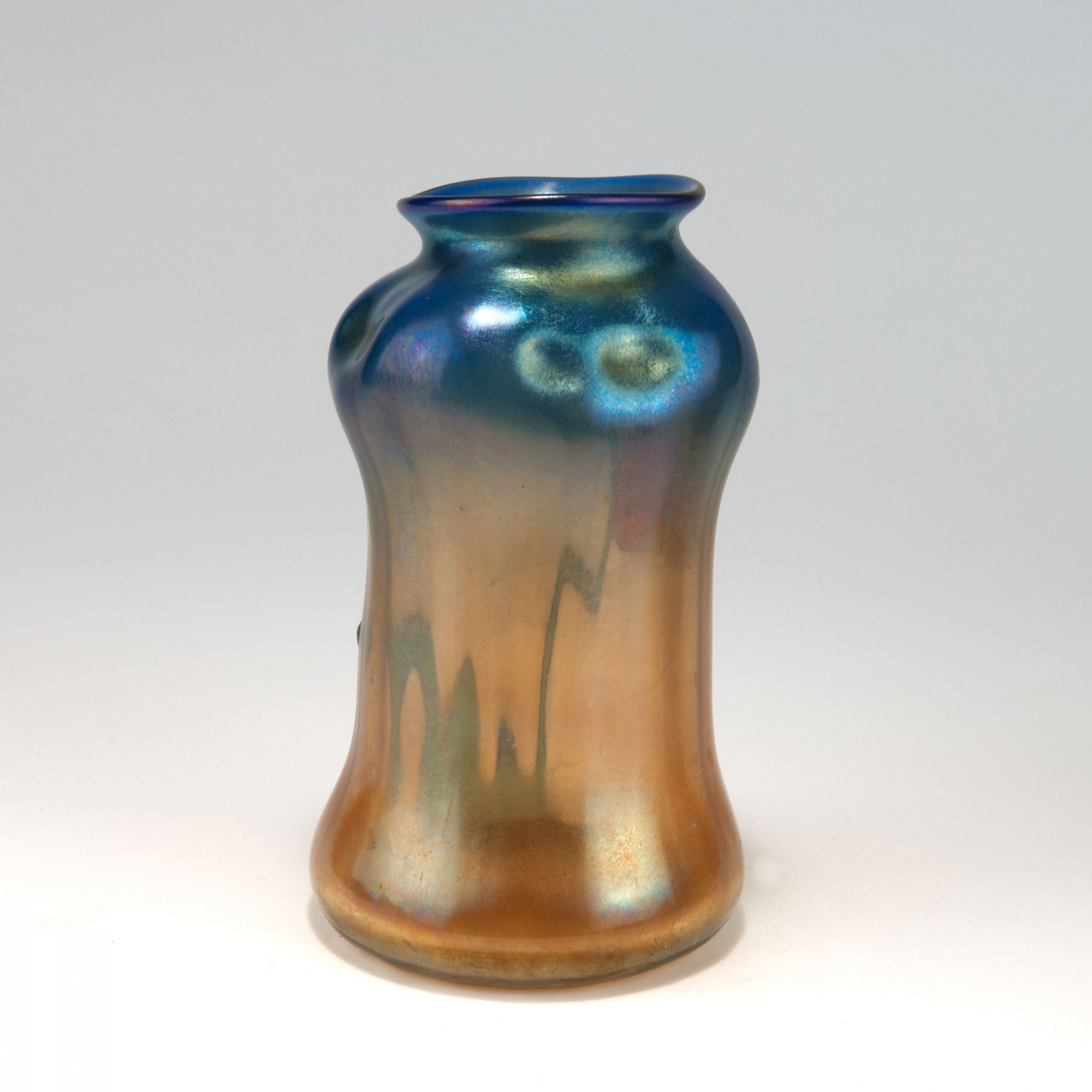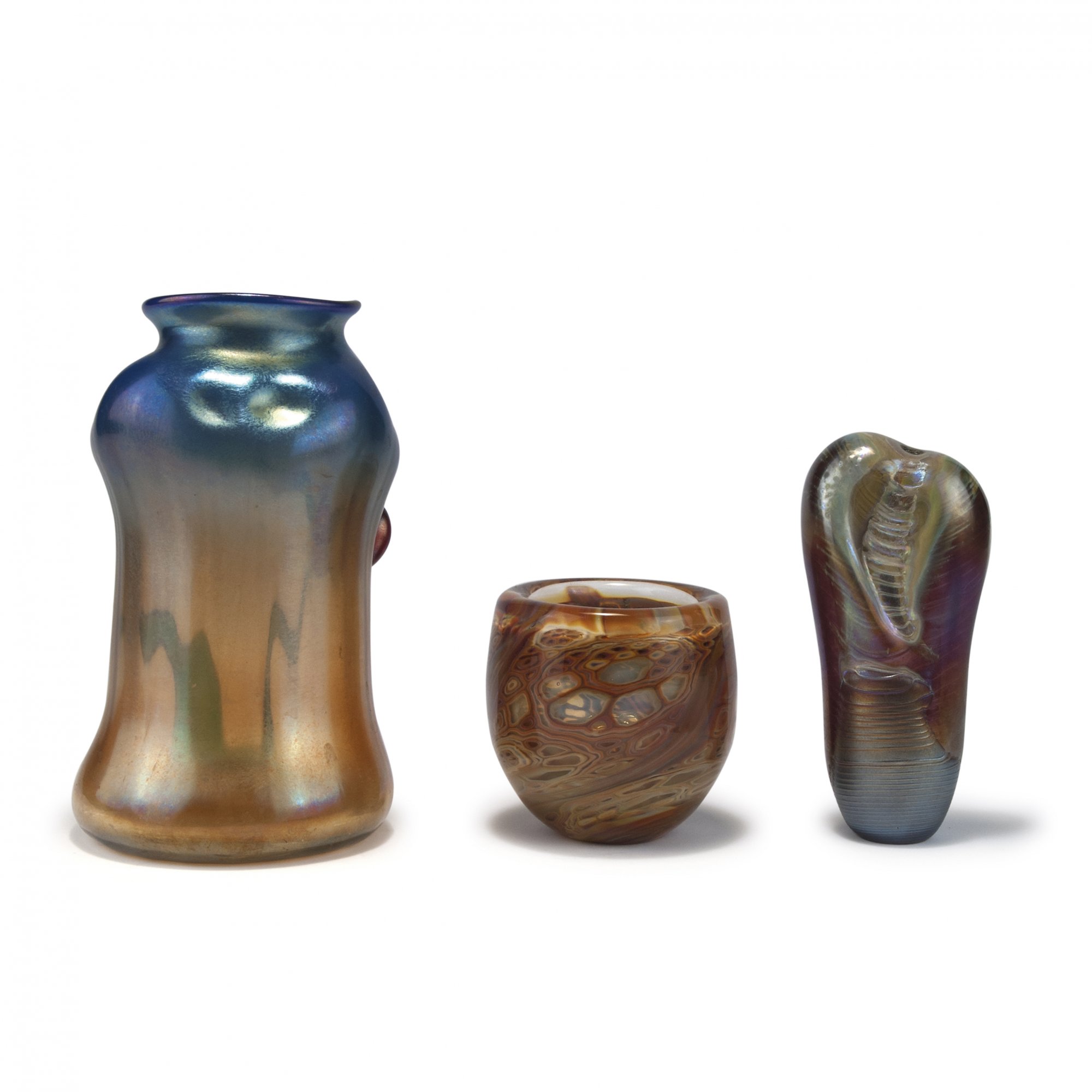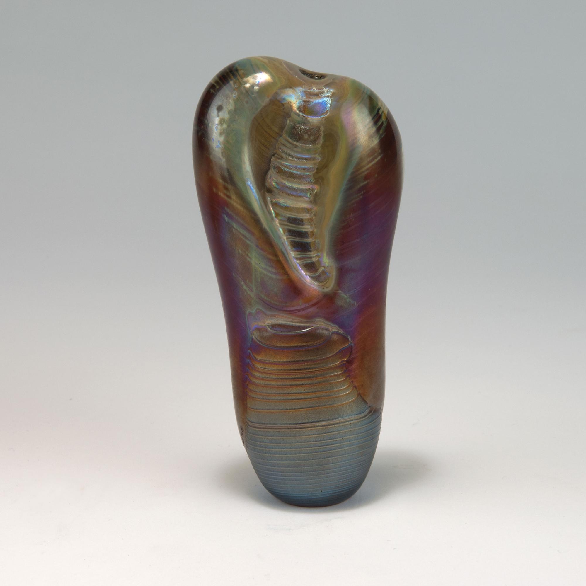 Robert Coleman, Mount Vernon, Ohio. Vase, 1984. H. 15.5 cm. Cased glass, salmon pink and clear, iridescent. Marked: Coleman 1984 USA (engraved). With two vases: Glass with fused ribbon, lustre, H. 19.5 cm; Glass, clear with amber murrhines, H. 9.5 cm. Marked: Kehr 84 (engraved).