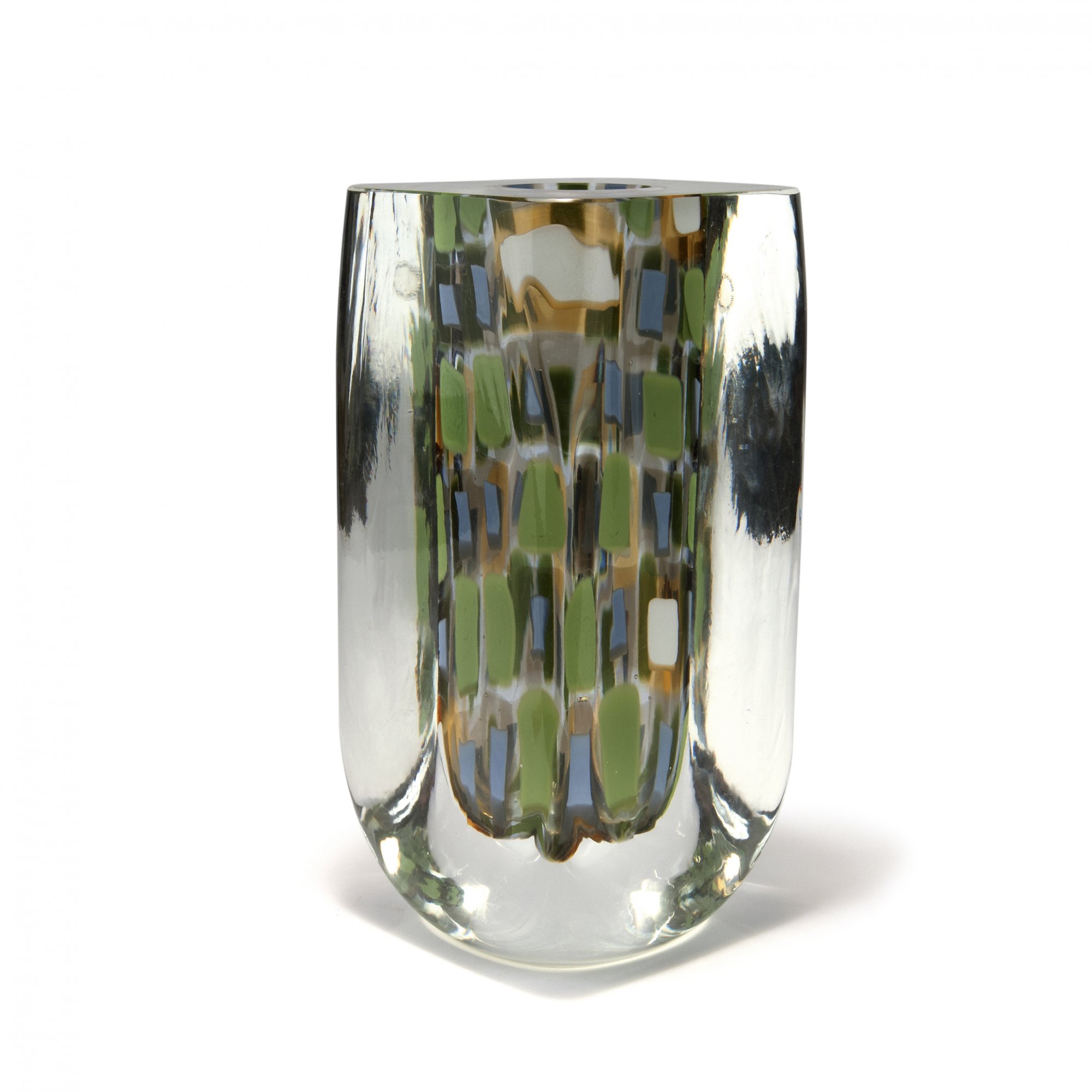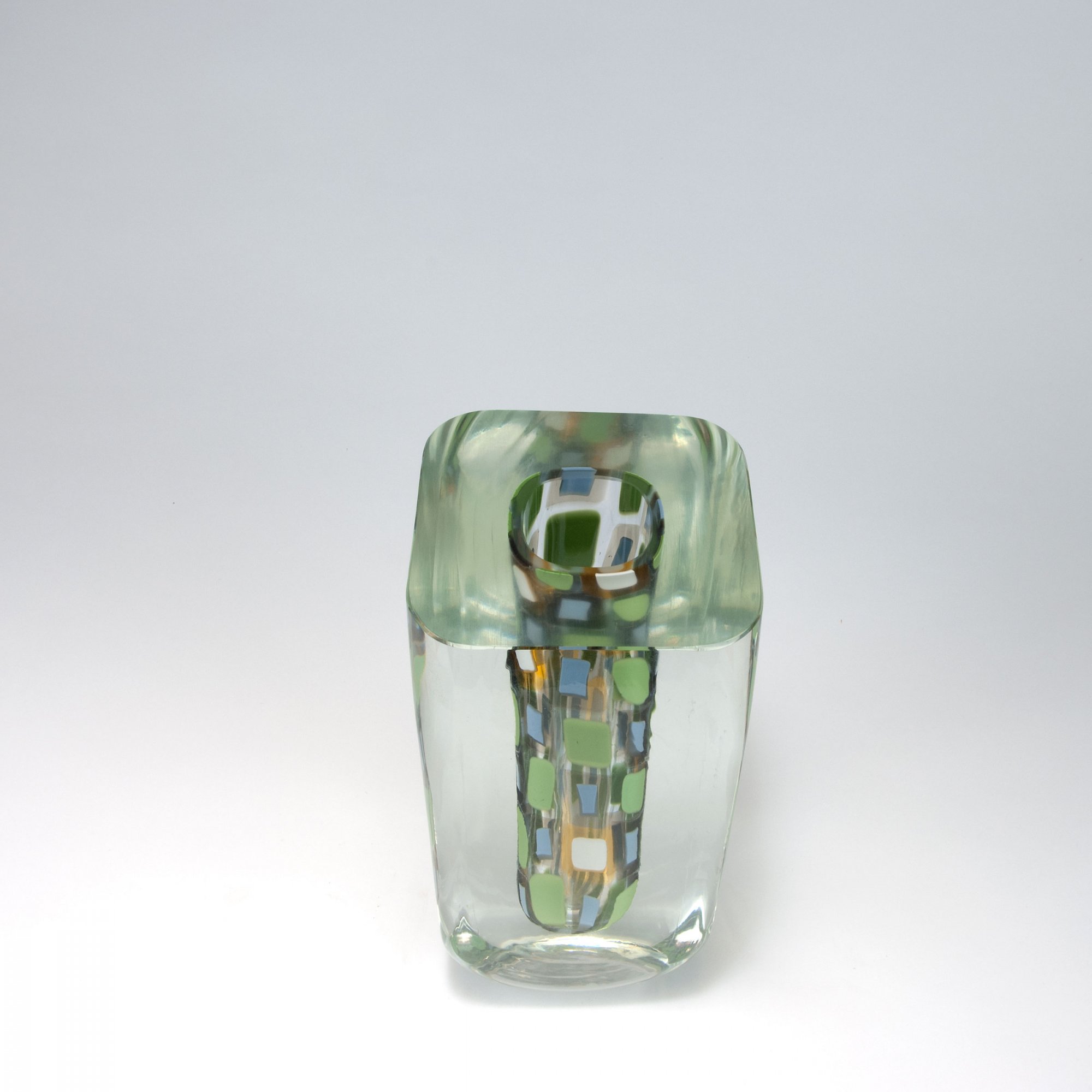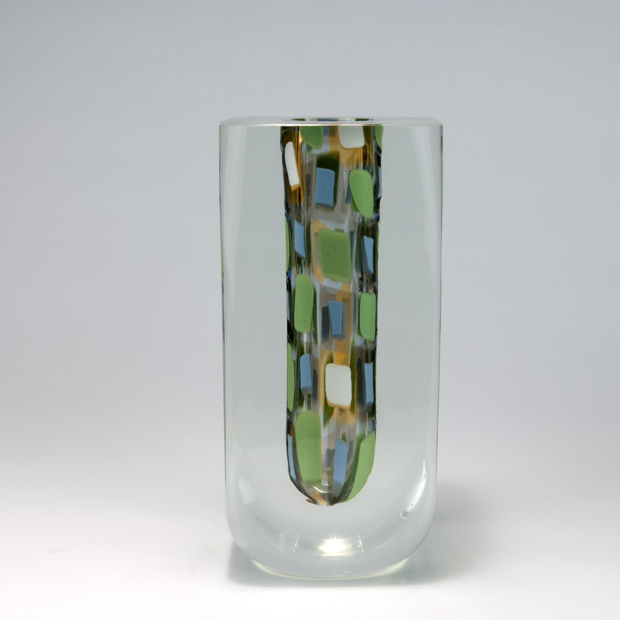 Rodolfo Dordoni. 'Mosaici' vase, 2003. H. 28.2 cm. Made by Venini & C. Cased glass, clear, included murrhines, green, blue and white, partial pale grey resp. pale amber layers. Marked: venini 2003 (engraved), maker's label.