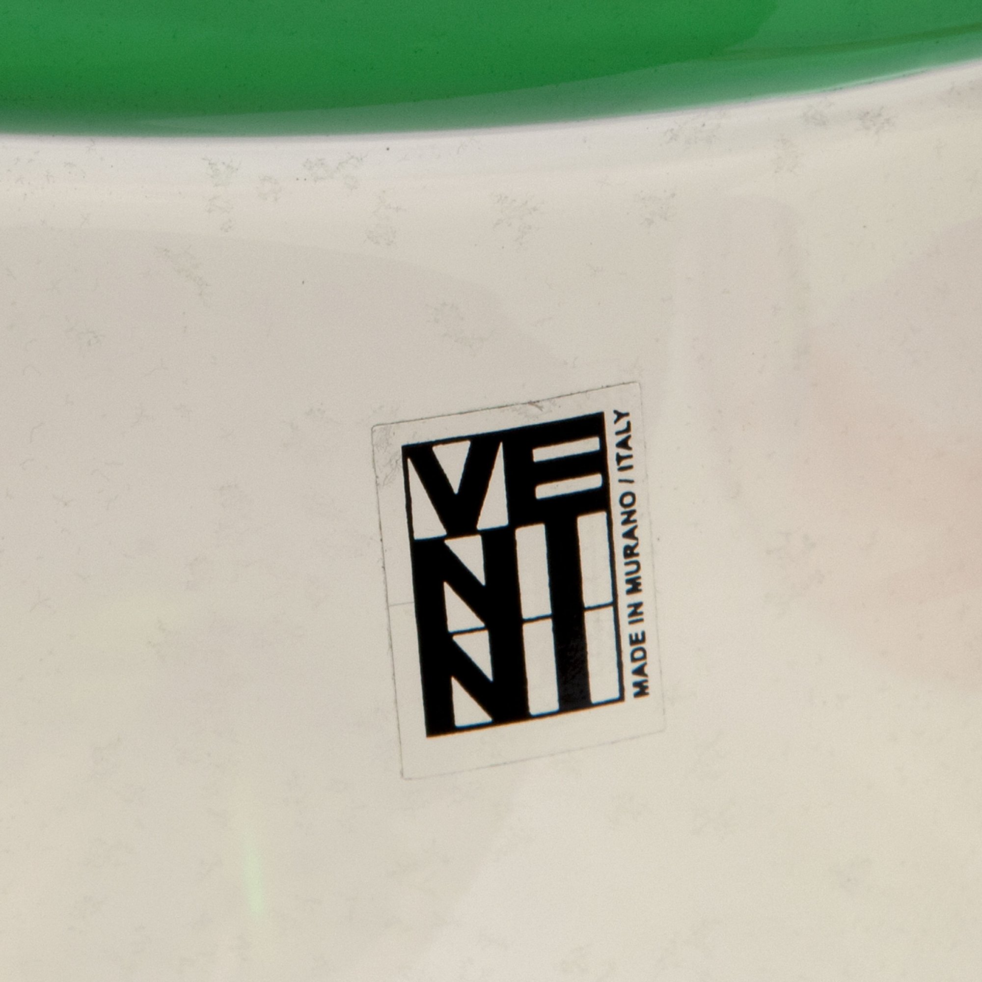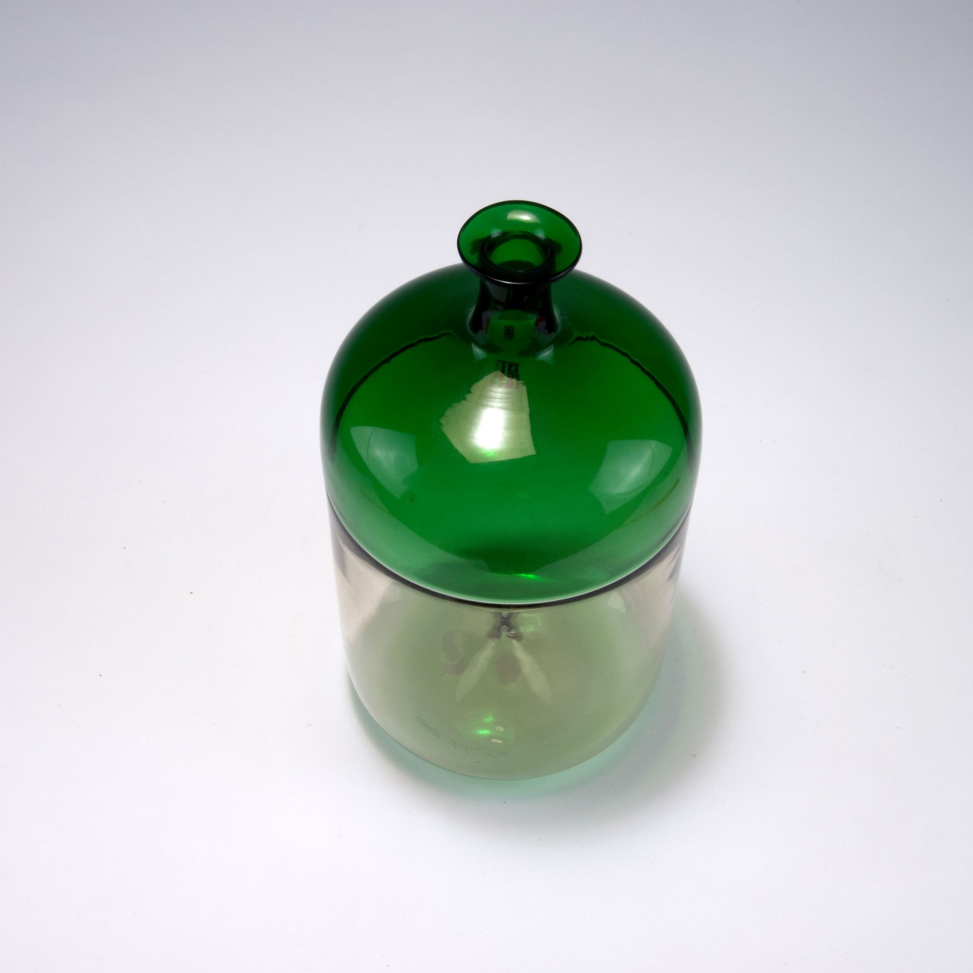 Tapio Wirkkala. 'Bolle' bottle, 1966-68. H. 24 cm. Made by Venini & C. 'Incalmo' technique, glass, green and pale amber. Marked: venini italia t.w. (engraved), rectangular plastic maker's decal.