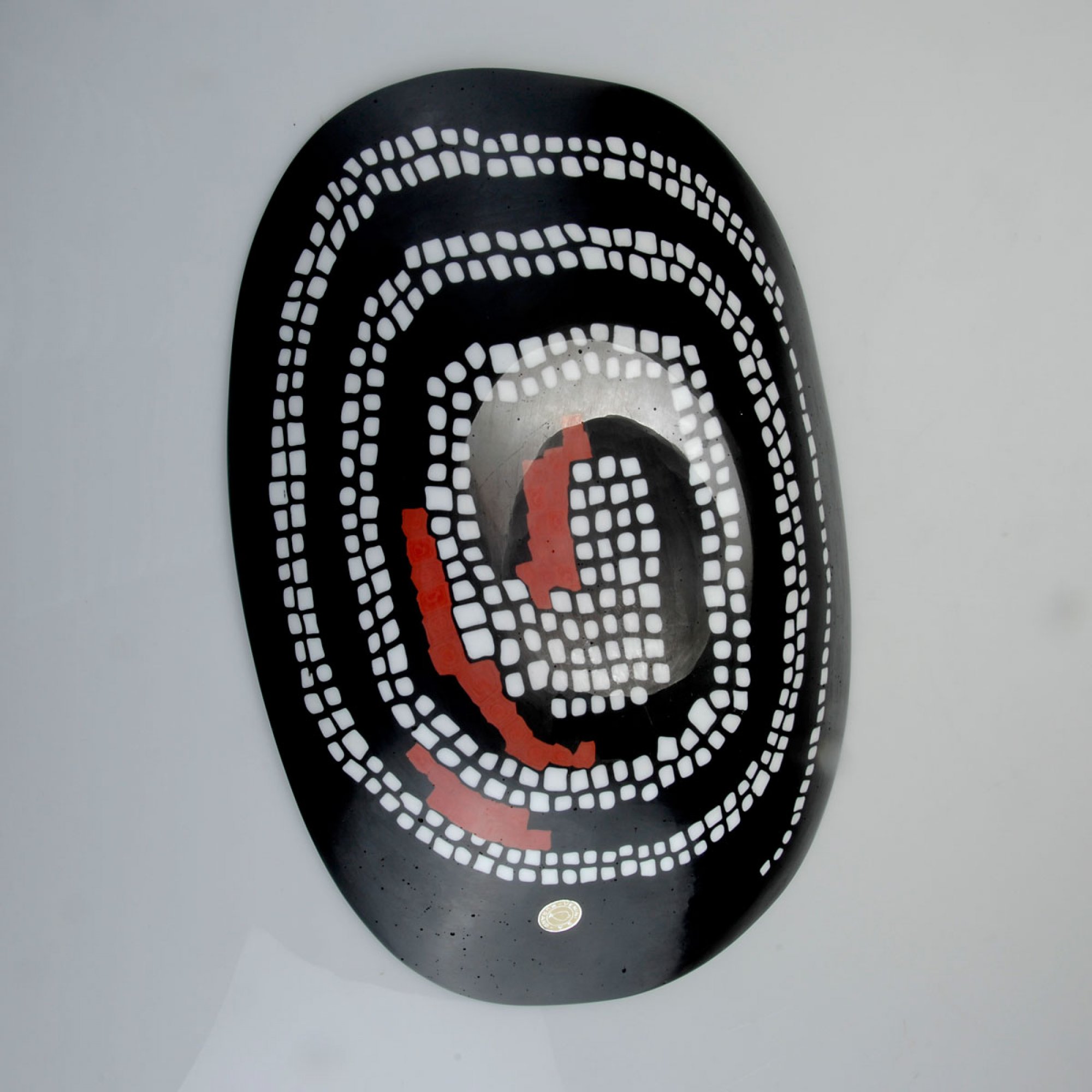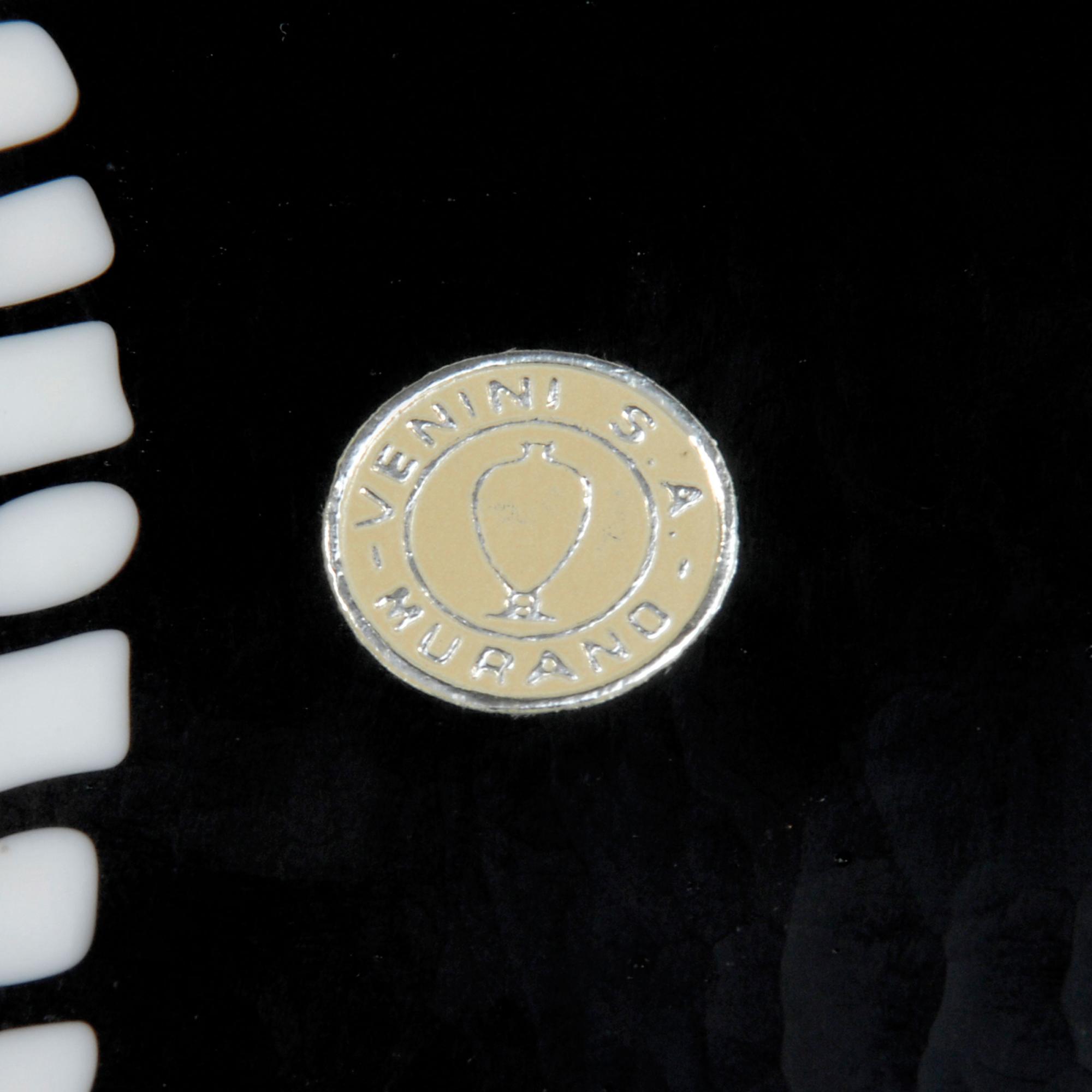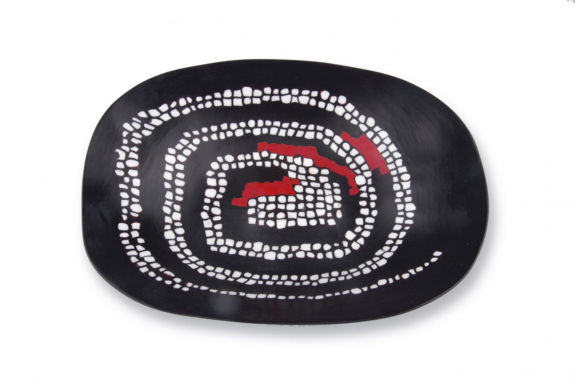 H. 5.8 cm; 33 x 23 cm. Made by Venini & C., prior to 1965. Opaque platelets, black, white and red, stylised serpent, cut surface. Marked: Round maker's decal: VENINI S.A. MURANO.