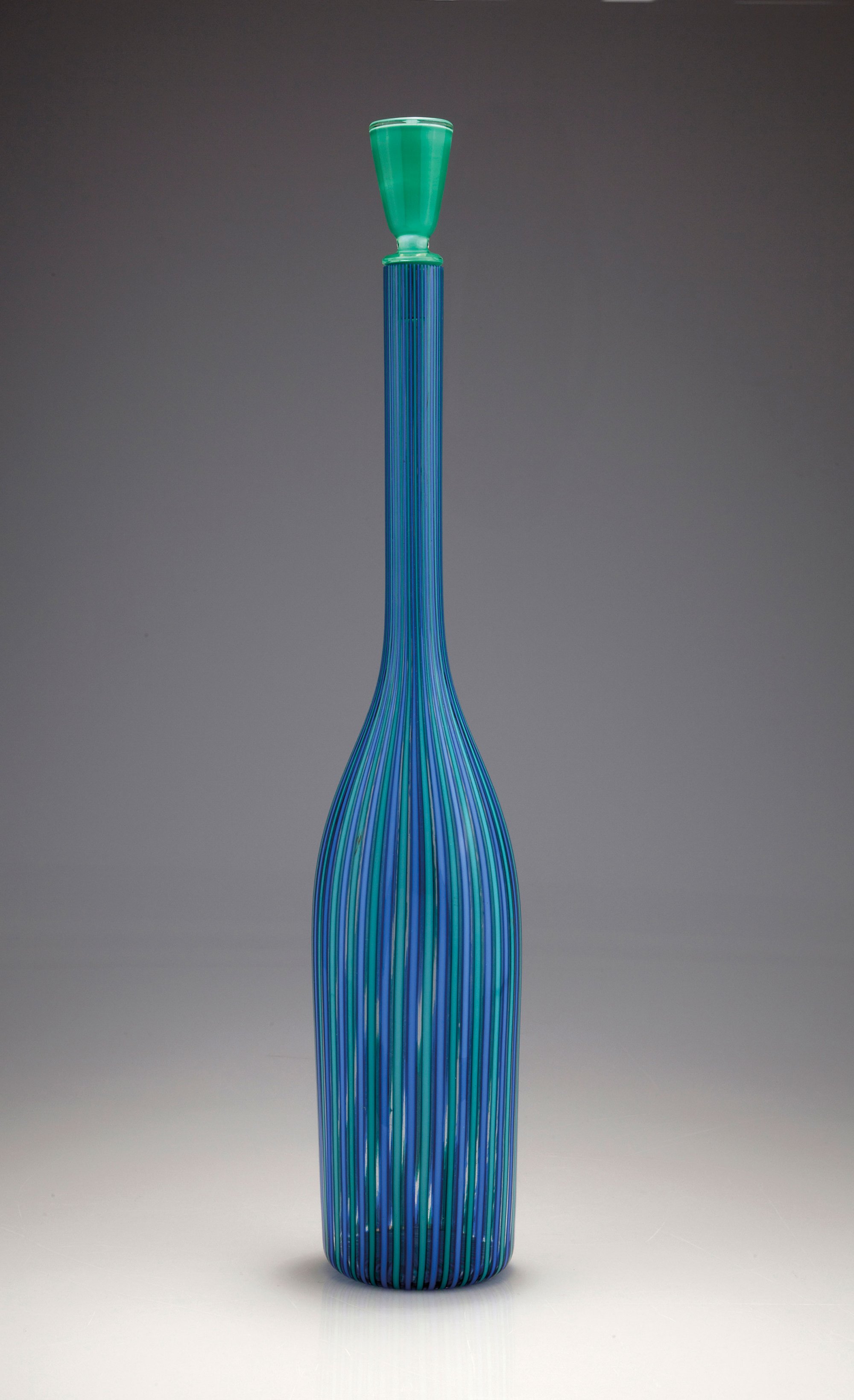 H. 49 cm. Made by Aureliano Toso. Cased glass, clear with stripes in green and blue, white layers. Stopper clear, white and green.