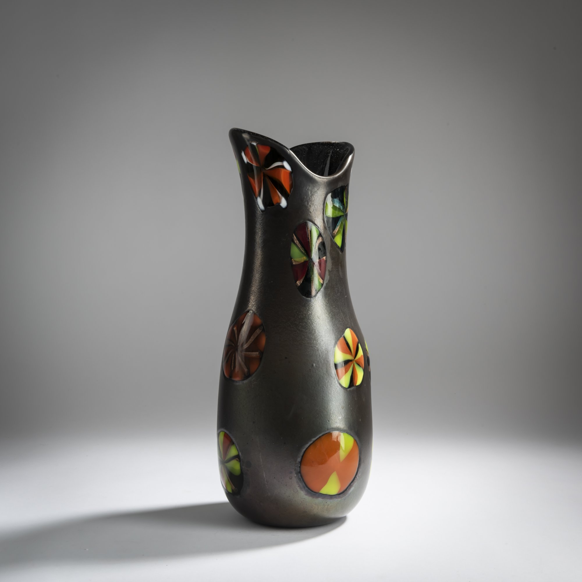 Slightly amorphous shape with irregularly beveled lip. H. 41.5 cm. Execution: Fratelli Toso. Colorless glass, deep gray iridescent powder fusions and fused star murrine in yellow, red, orange and aventurine. Marked: manufacturer's label.