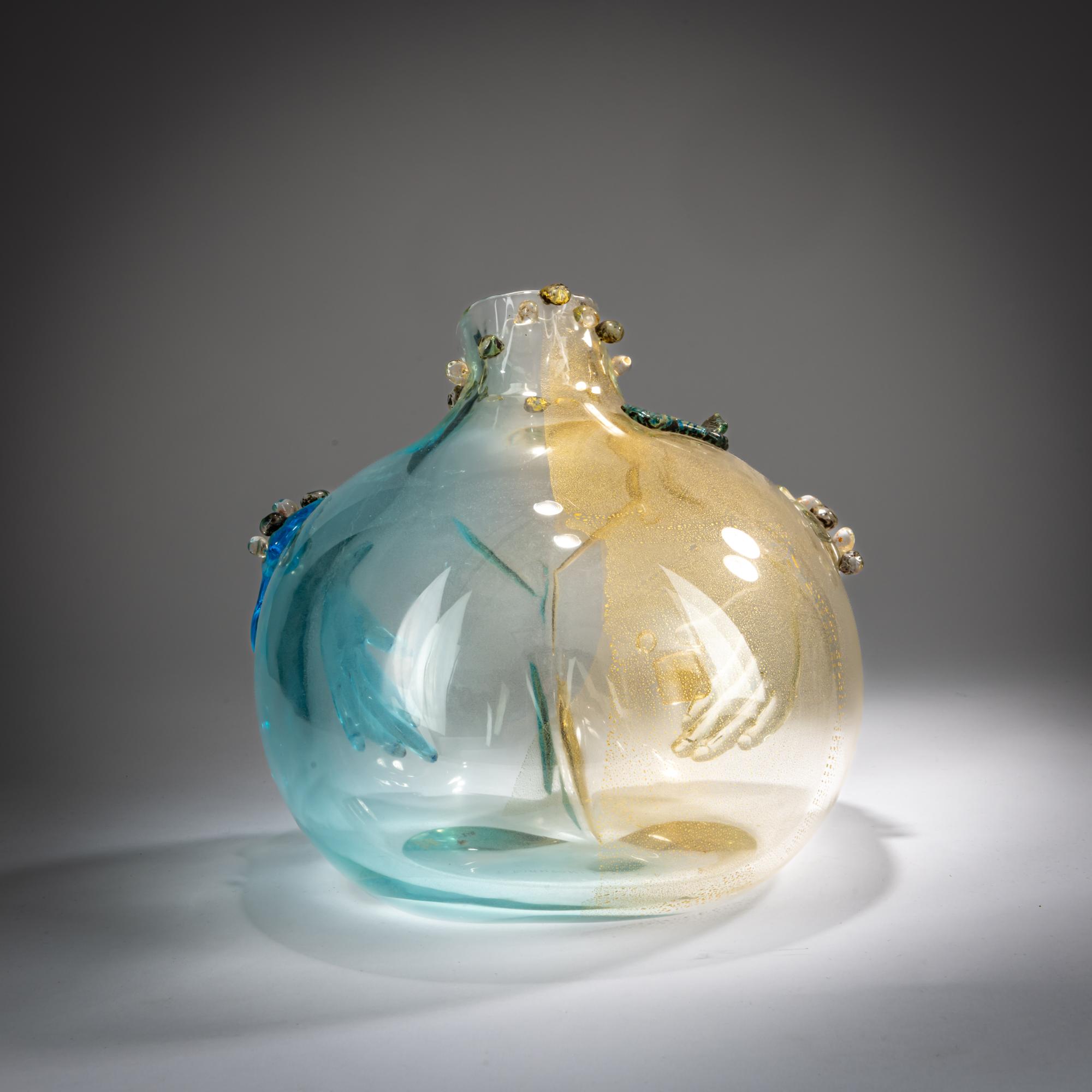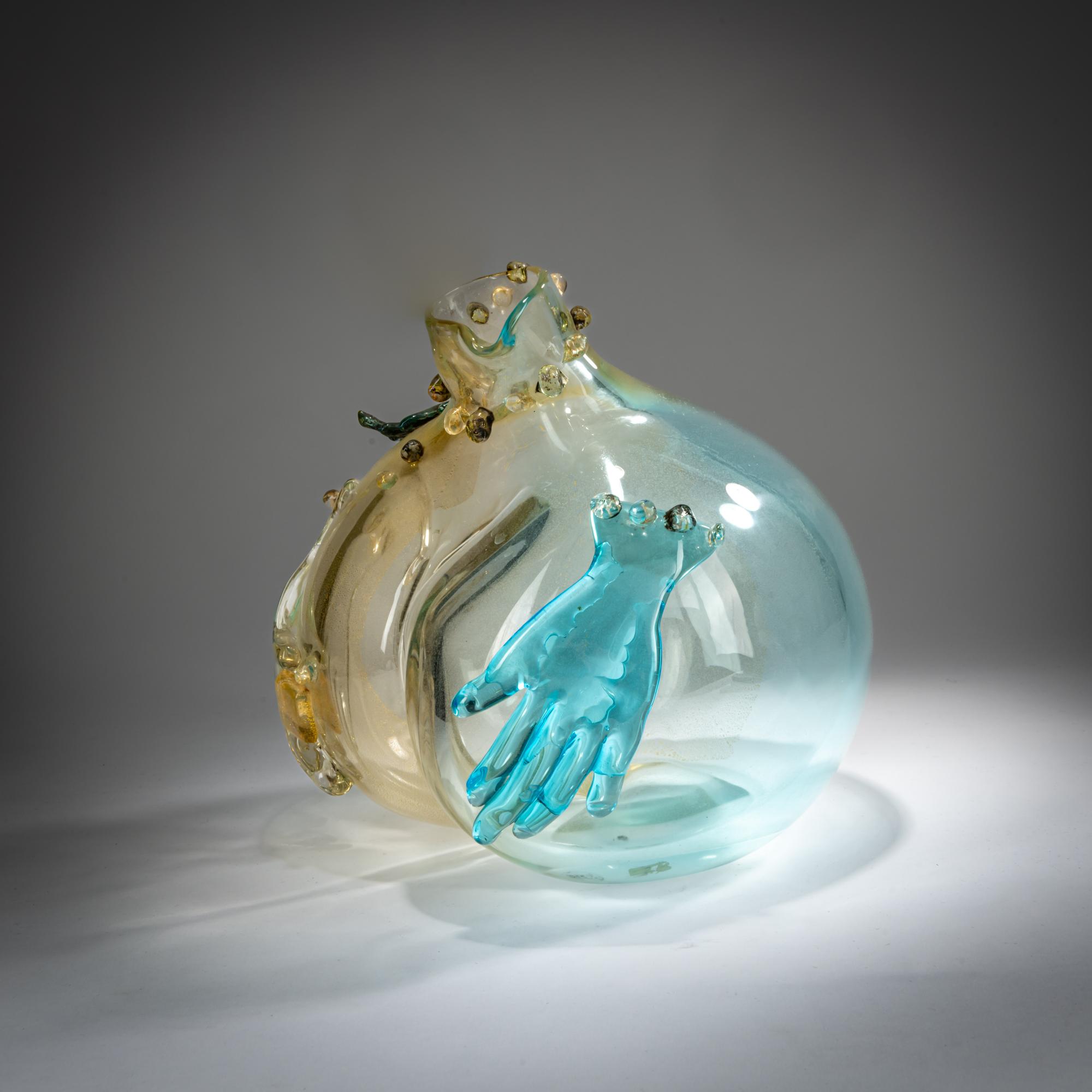 In the shape of a buttock with two hands. H. 24.5 cm. Execution: Seguso Vetri d'Arte. Cased glass, colorless, partially blue, and with gold foil, featuring two fused hands, a leaf, and numerous beads. Inscribed on the base: F. BIANCONI 1978 PA (engraved).