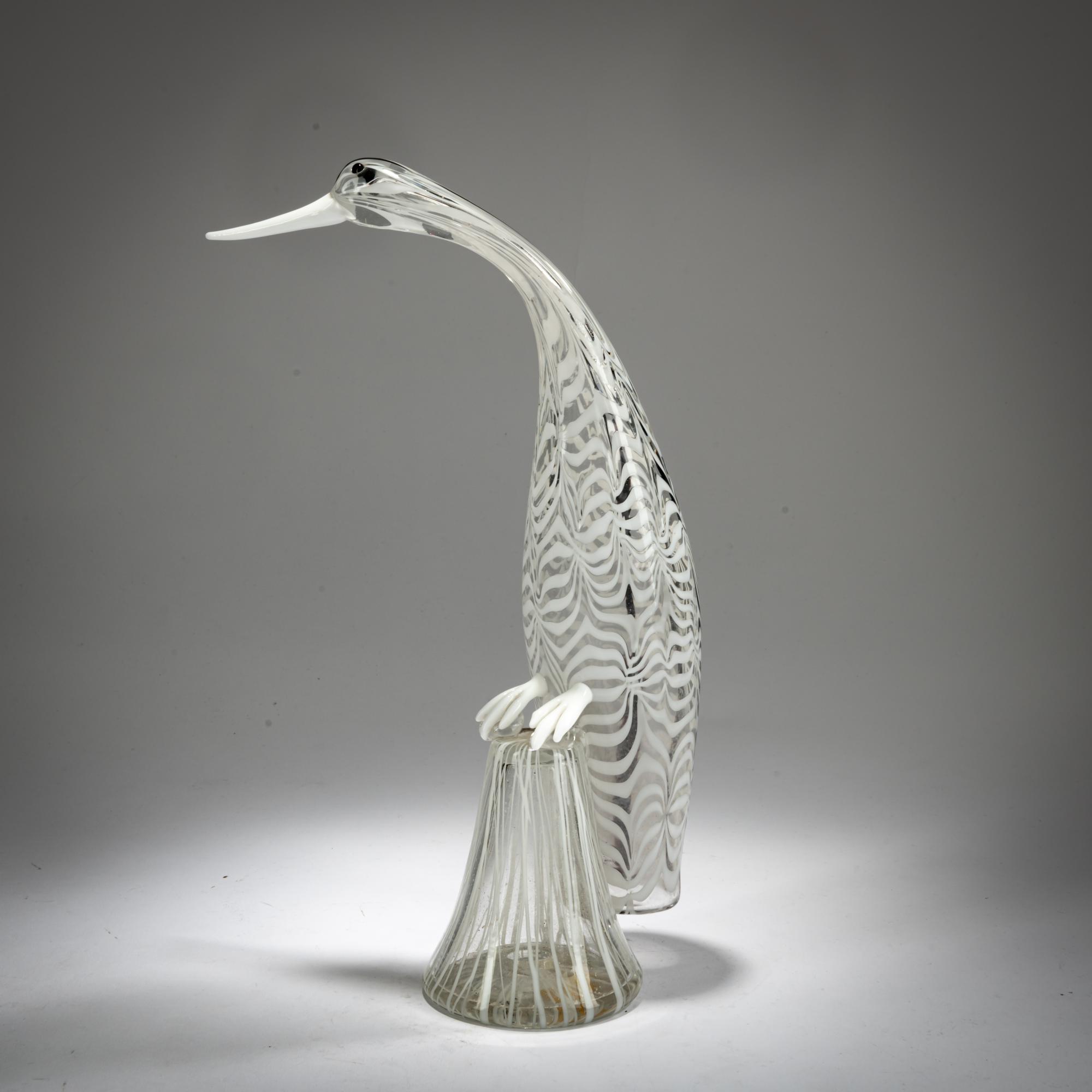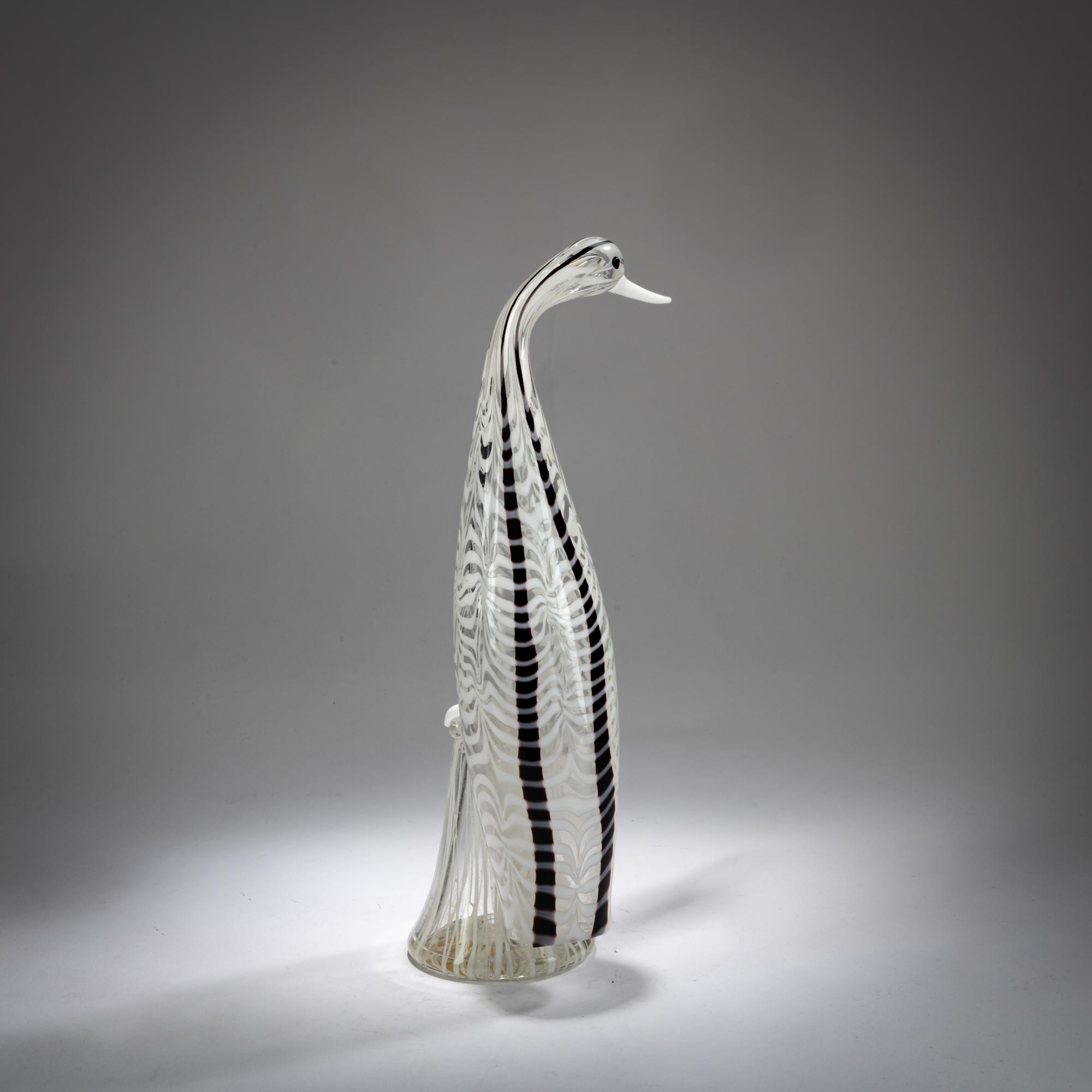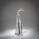 Model no. 2779. H. 30 cm. Execution: Venini. Colorless glass with applied white and dark violet bands, beak and claws in white glass, and dark violet eyes. Marked: Venini Murano Italy (acid stamp); manufacturer's label.