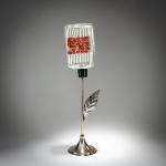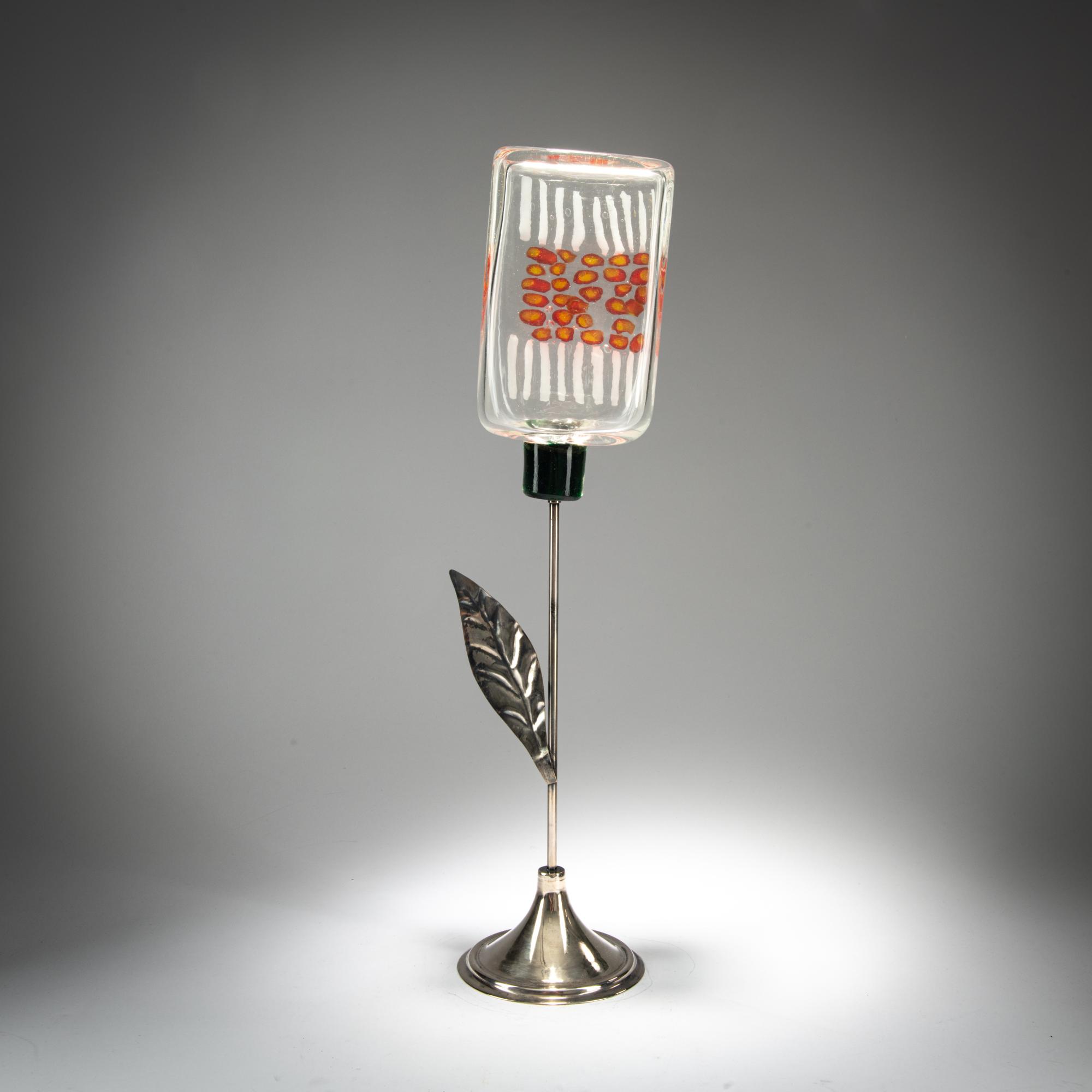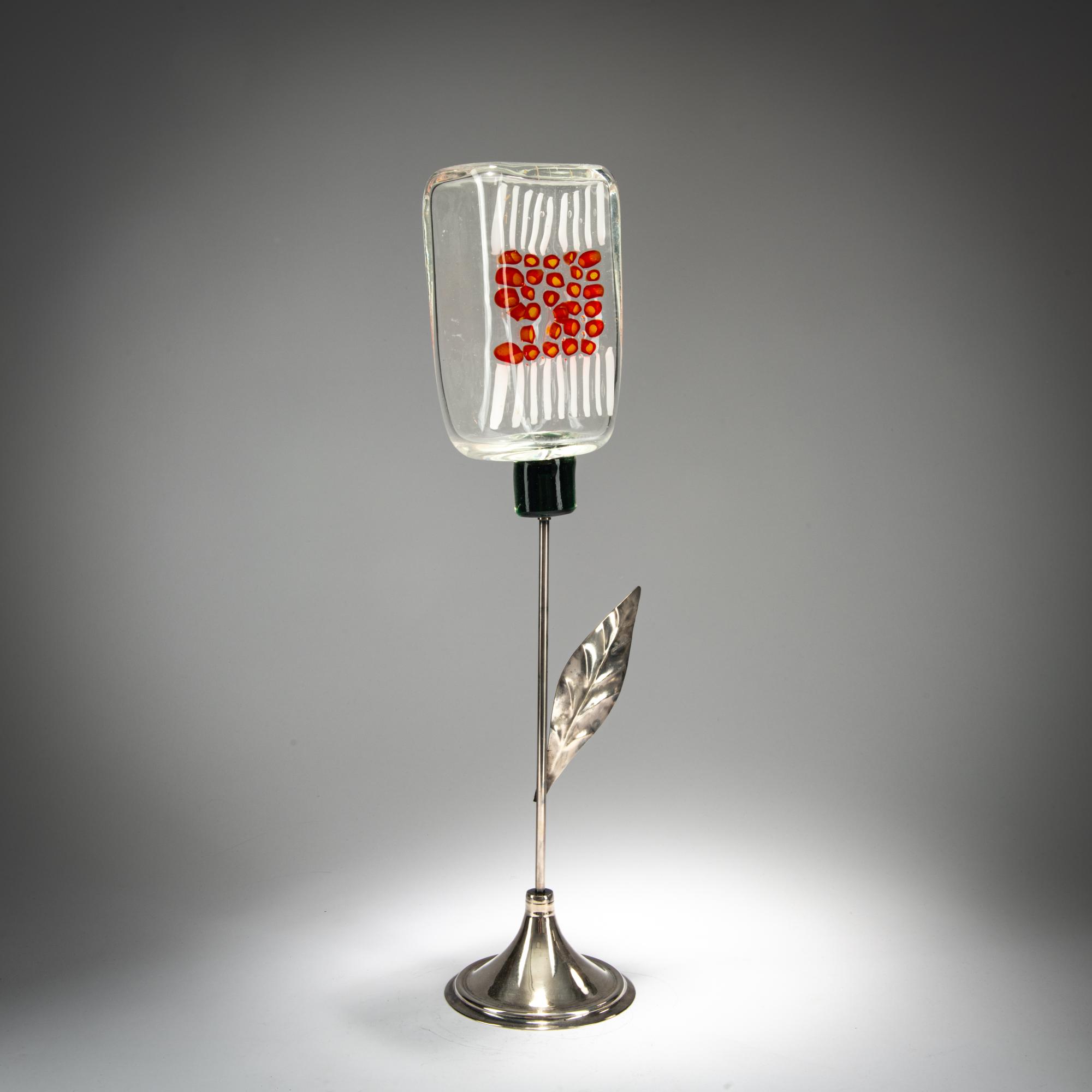 Model No. 10186. H. 49.5 cm. Execution: Aureliano Toso for Lumenform. Cased glass, colorless and green with white bands and yellow and red murrine. Silver-plated metal base.