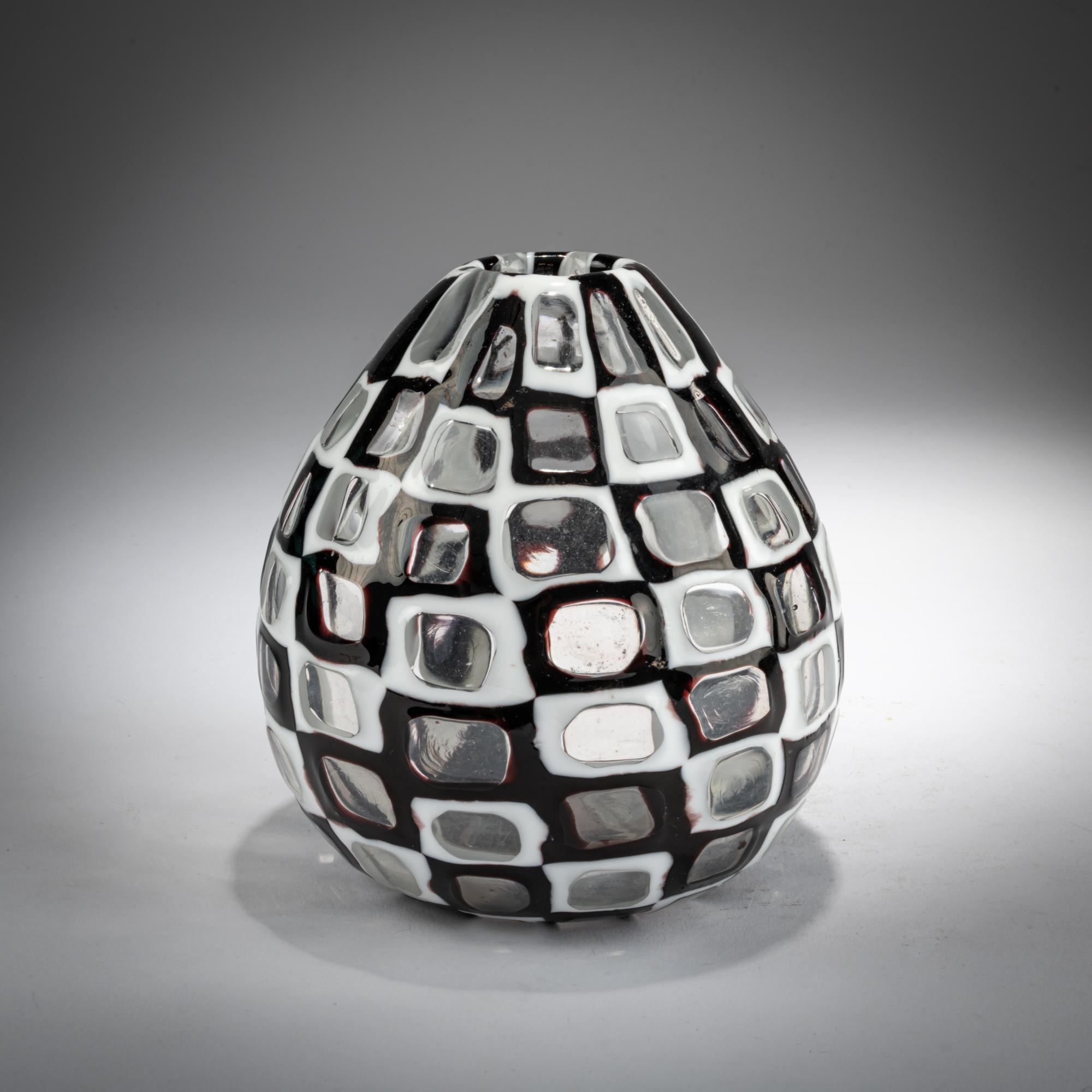 H. 12 cm. Execution: Venini. Colorless glass with fused black and white murrine. Marked: Venini Murano Italy (acid stamp).