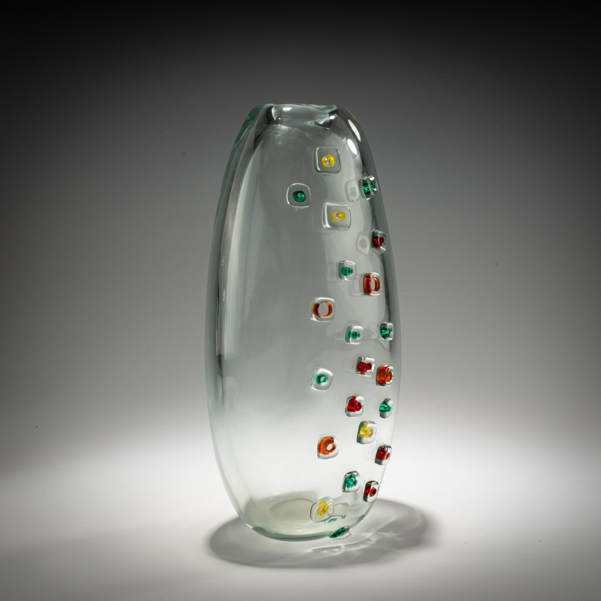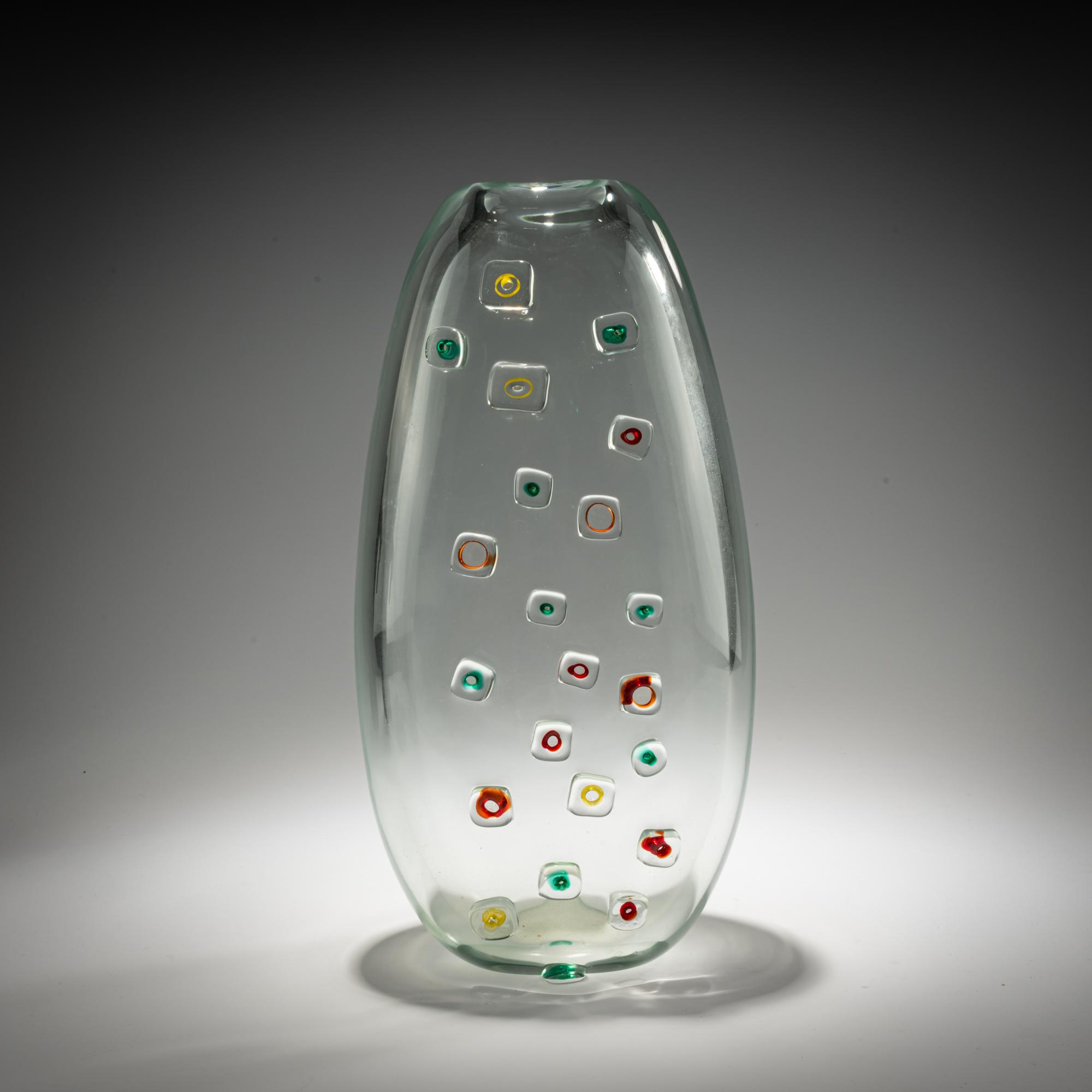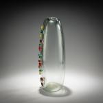 H. 37 cm. Execution: Vetreria Alfredo Barbini. Colorless glass with fused rings featuring red, green, and yellow cores. Marked: A. Barbini (engraved).
