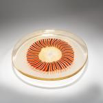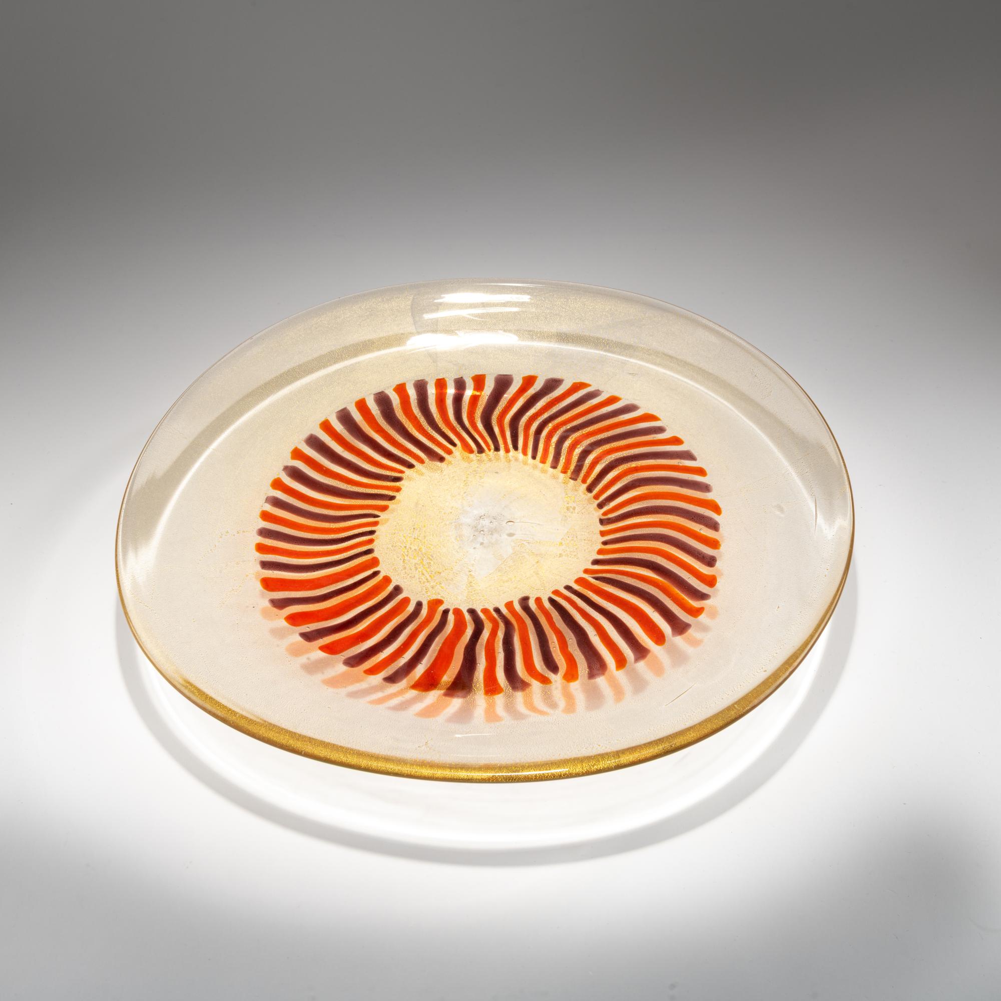 Model No. 13479. 39.5 x 42 cm. Execution: A.Ve.M. Overlaid glass, colorless, with embedded shattered gold foil. Fused rods in orange and violet.