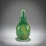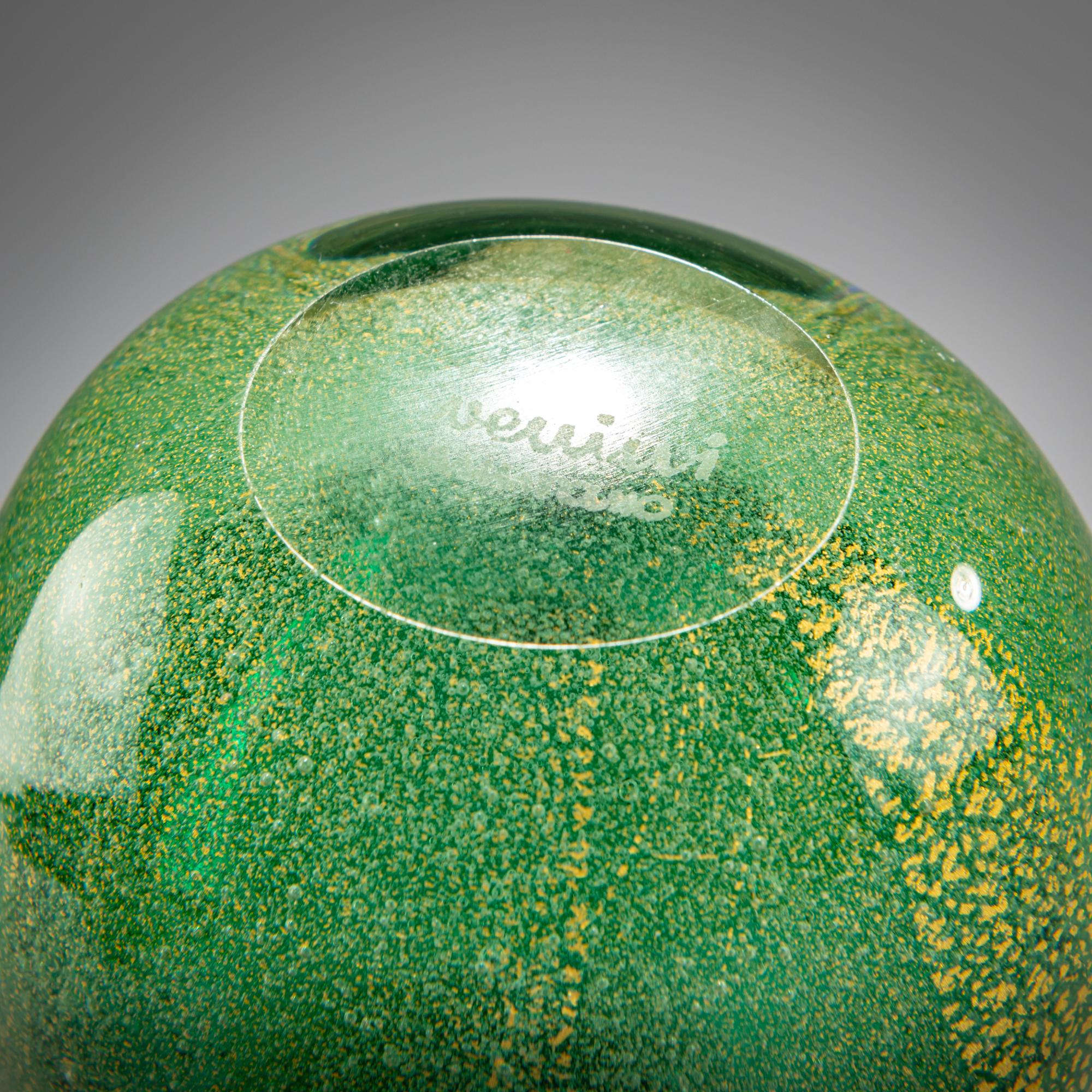 Model No. 655. H. 13.5 cm. Execution: Venini. Overlaid glass, colorless and green with air bubbles and finely shattered gold foil. Marked: venini murano (two-line acid stamp).