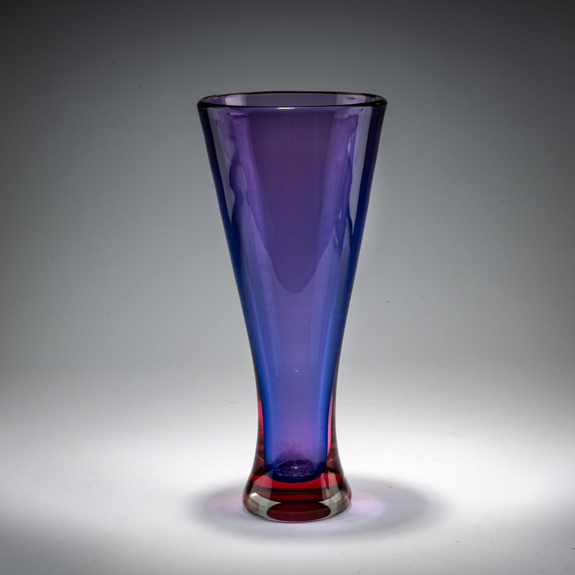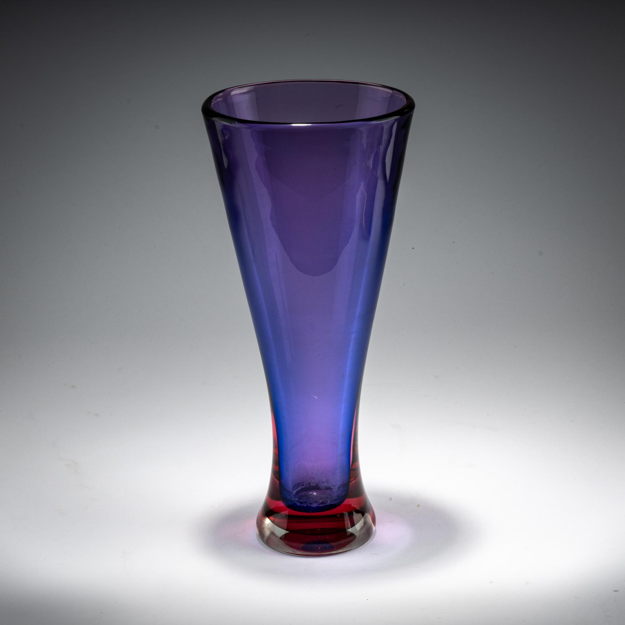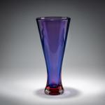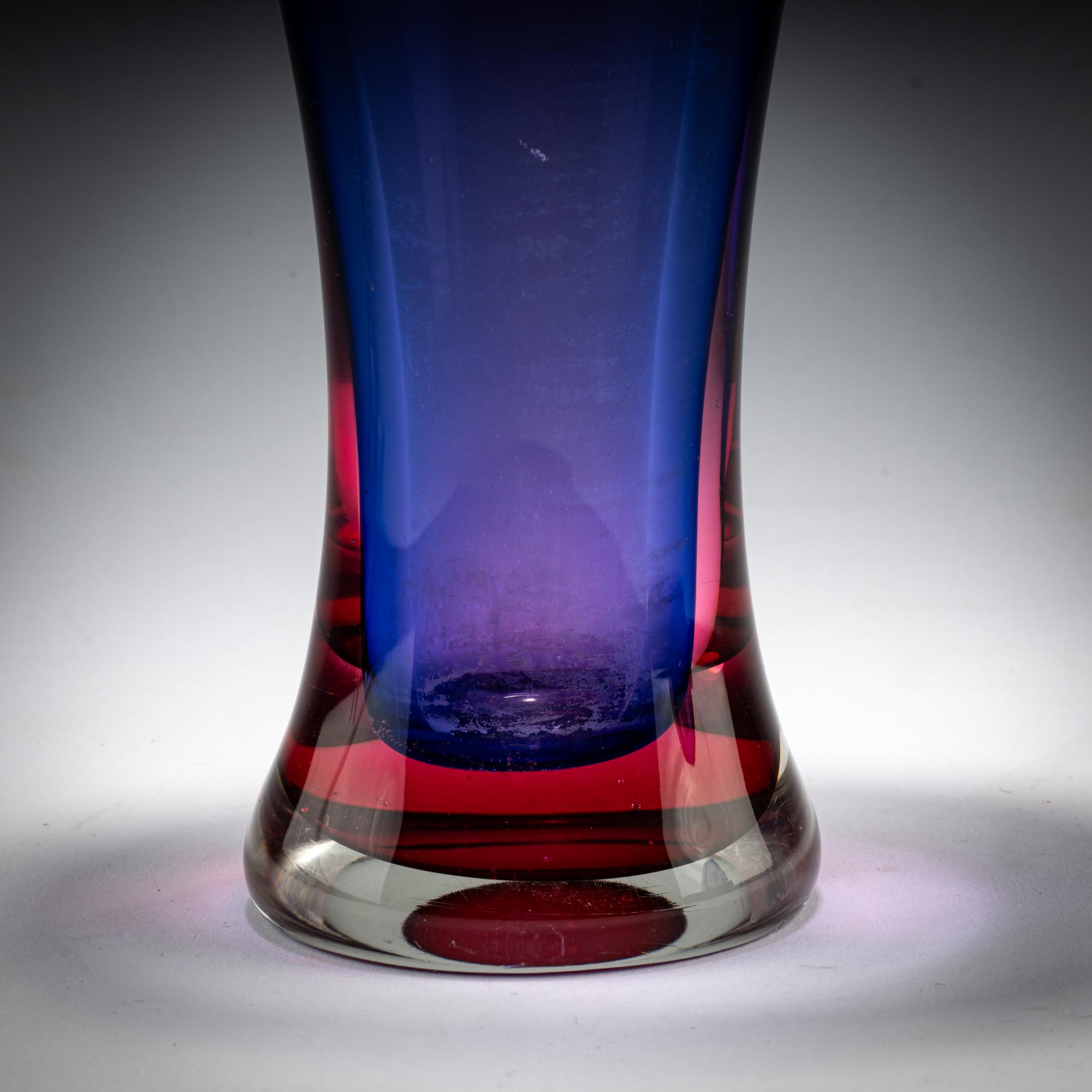 Model No. 9825 for the Milan Triennale. H. 35.5 cm. Execution: Seguso srl. Overlaid glass, colorless, blue and red.