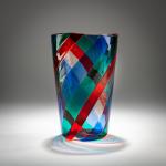 Model No. 4410. H. 20.7 cm. Execution: Venini. Fused glass bands, colorless, blue, green, and red. Bottom marked: venini murano ITALIA (three-line acid stamp).