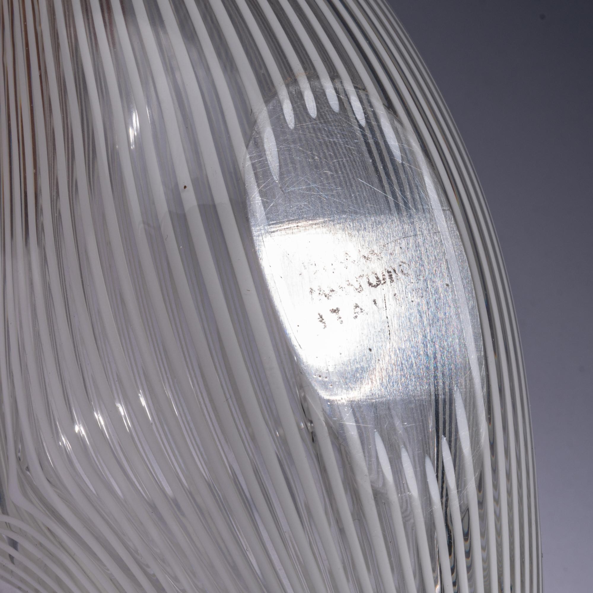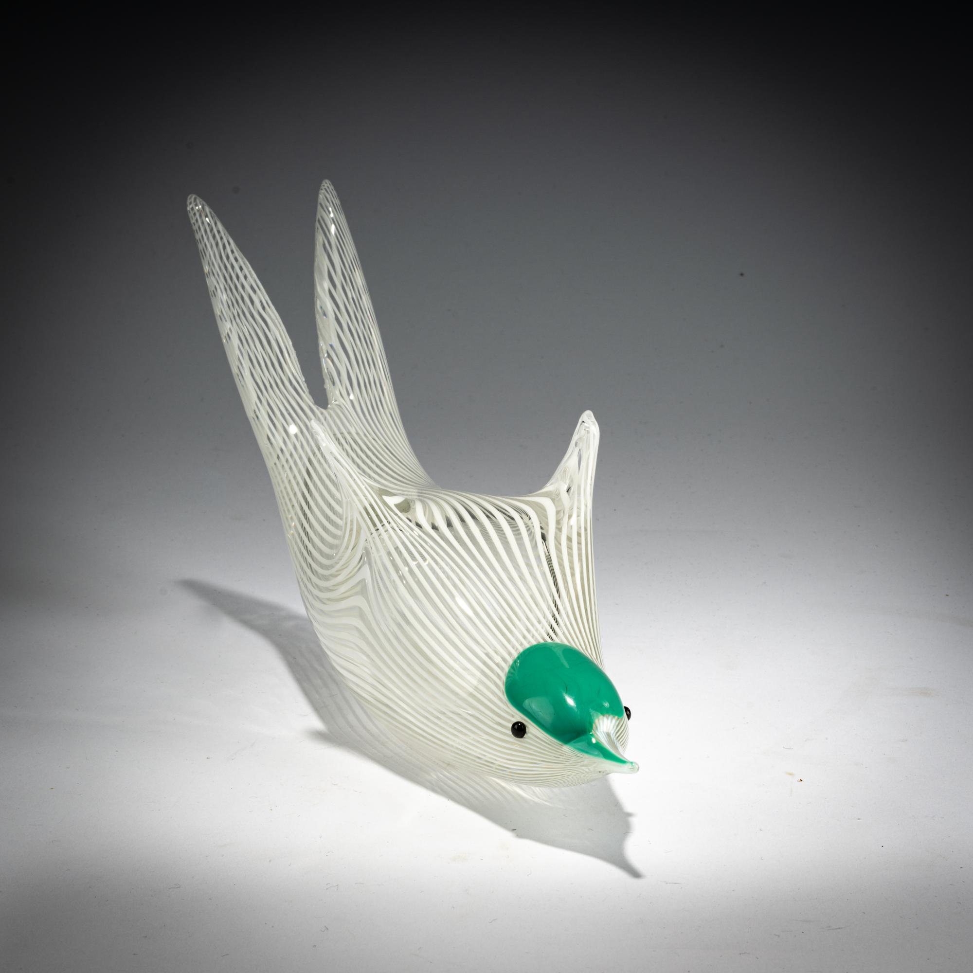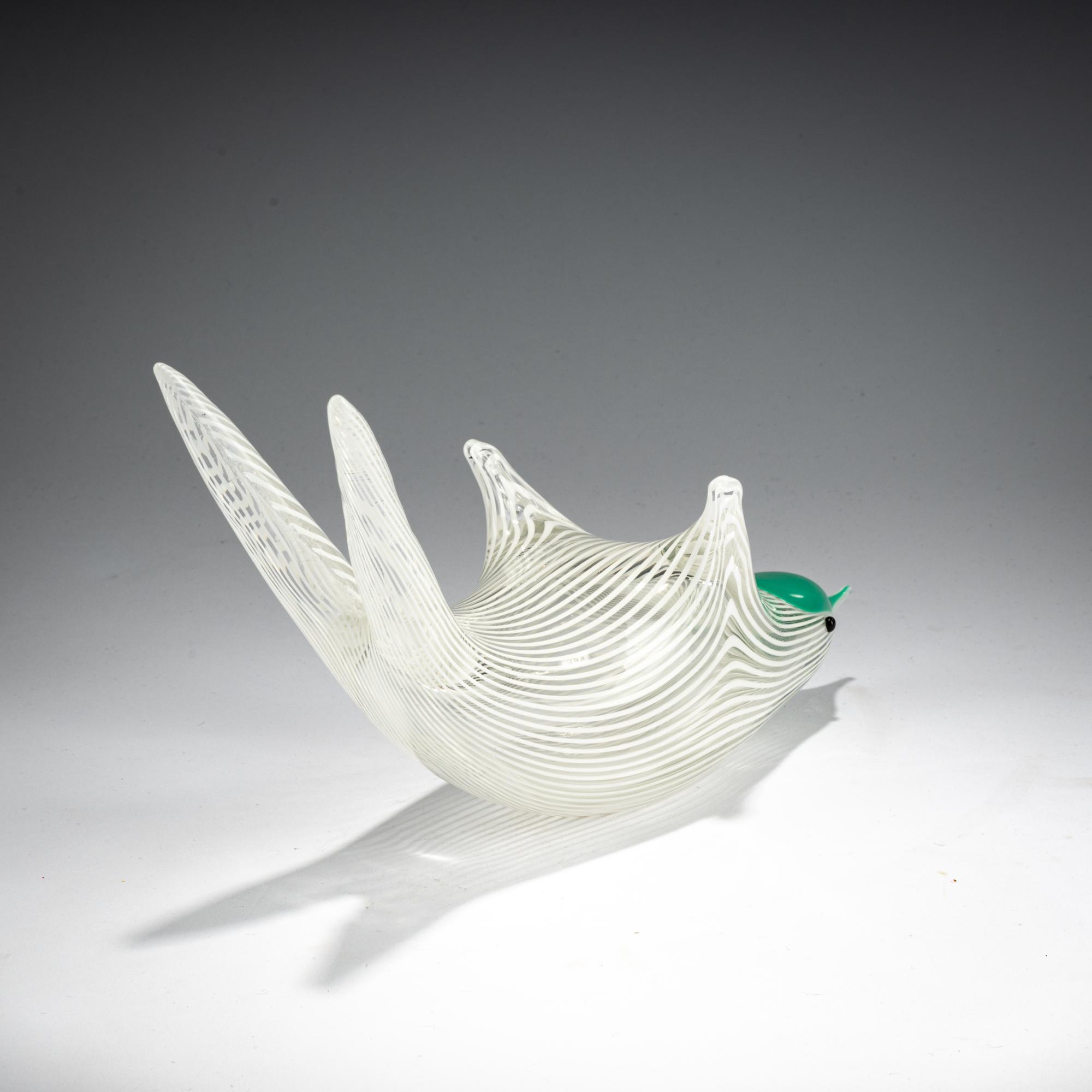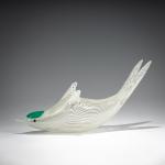Model No. 2772. H. 14 cm, L. 27 cm. Execution: Venini. Colorless glass with white thread inclusions and green overlay. Marked: venini murano ITALIA (three-line acid stamp).