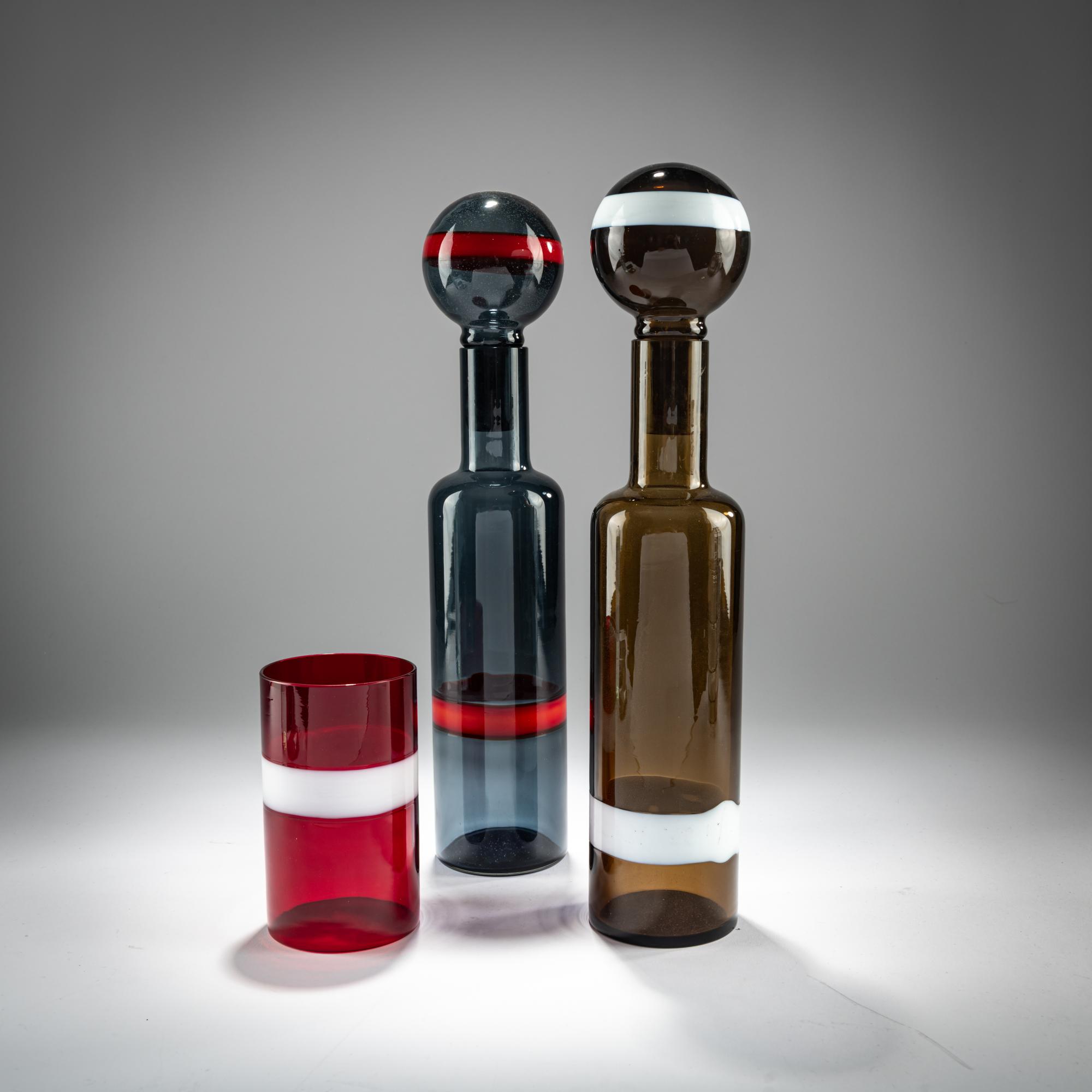 H. 13.5 - 38.5 cm. Execution: Vetreria Vistosi. Glass, red with opal white band, brown with opal white band or dark green with red on opal white band.