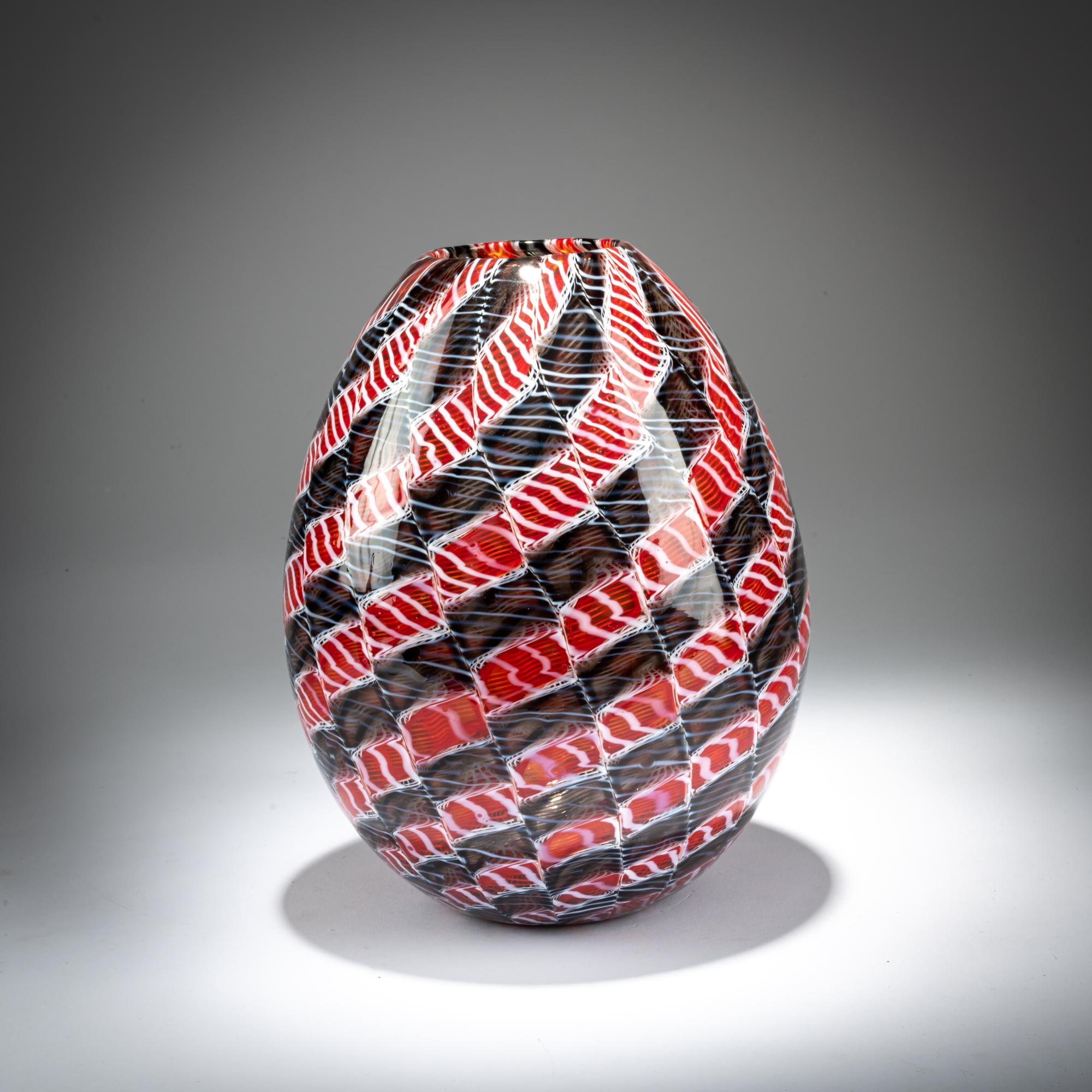 H. 21 cm. Execution: Archimede Seguso. Cased glass, colorless, fused bands of violet and red glass in the 'merletto' technique, encased in white spiral threads.
