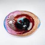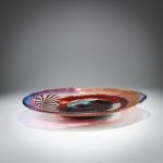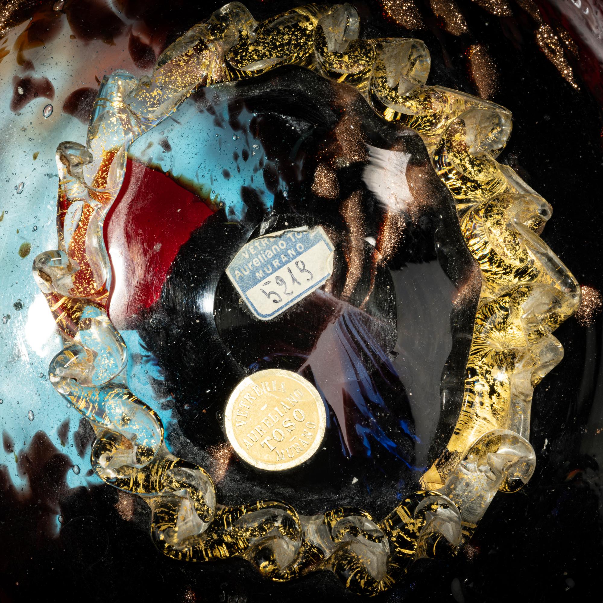 Model No. 5219. 45.5 x 33.5 cm. Execution: Aureliano Toso. Cased glass, colorless with powder inclusions in deep violet, cobalt blue, azure blue, light violet, red, and aventurine; fused platelets in red, blue, and colorless glass; and one platelet with a white thread net 'Filigrana'; large star murrine in white and deep violet glass. Bottom marked: Manufacturer's label.