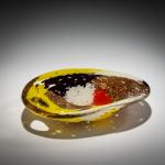 H. 4 cm, 20 x 16 cm. Execution: Aureliano Toso. Overlaid glass, colorless with multicolored powder inclusions, oval perforation at one side.