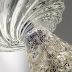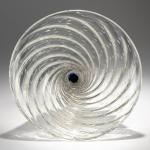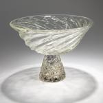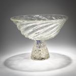 H. 17 cm, Ø 23 cm. Execution: Barovier & Toso. Colorless glass, bowl with vertical ribs and bubble inclusions, dark blue base with included precious metal foil, fused round platelets, slightly iridescent.
