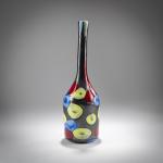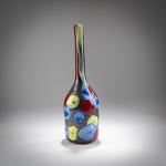 H. 36 cm. Execution: Fratelli Toso. Colorless glass with black iridescent overlay and light blue-white, red, and yellow speckled inclusions. Unsigned.