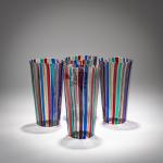 H. 14.5–15 cm. Execution: Venini, 1984. Fused vertical bands of multicolored glass. Bottom marked each: venini italia 84 (engraved); one glass additionally with two plastic labels.