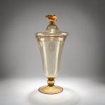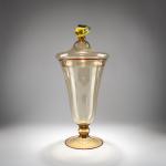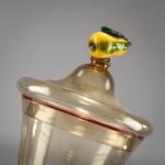 H. 54 cm. Honey-yellow glass, rims fused with red; lid with applied polychrome pear.