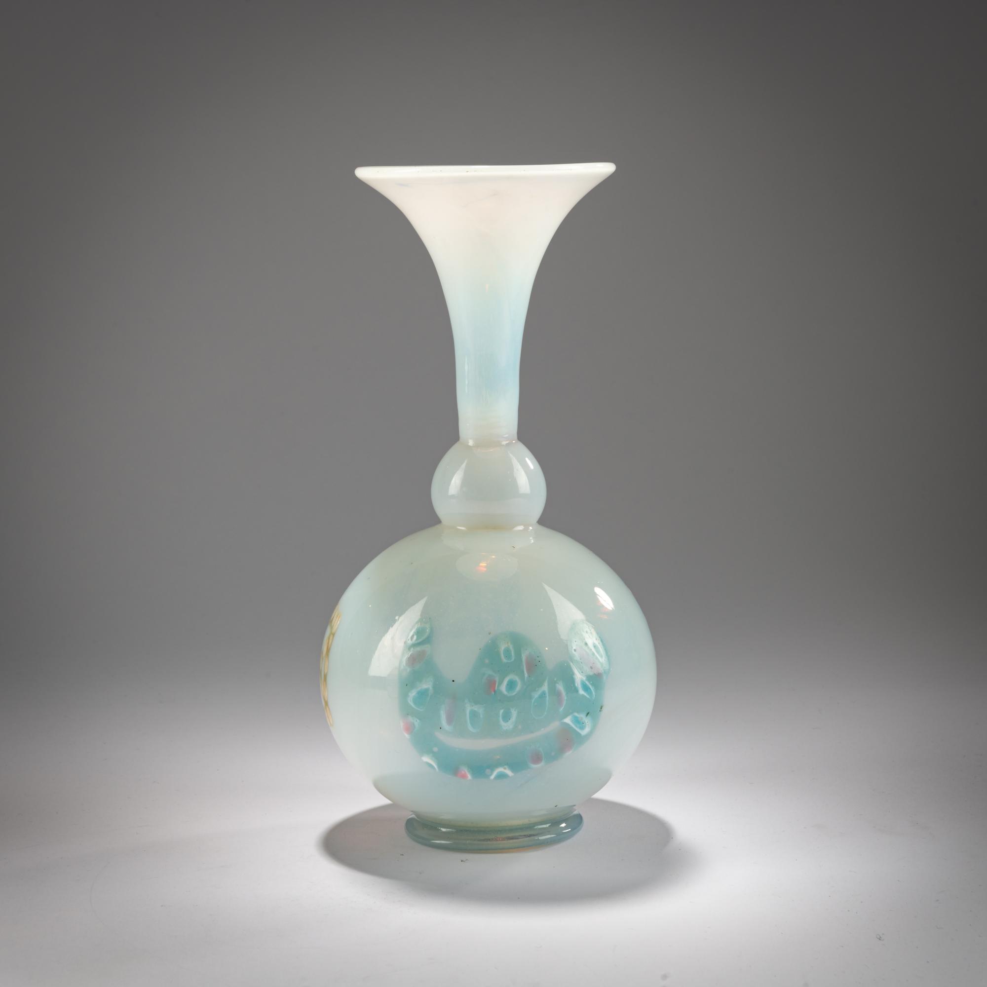 H. 25 cm. Milky opalescent glass with fused polychrome murrine bands.