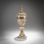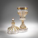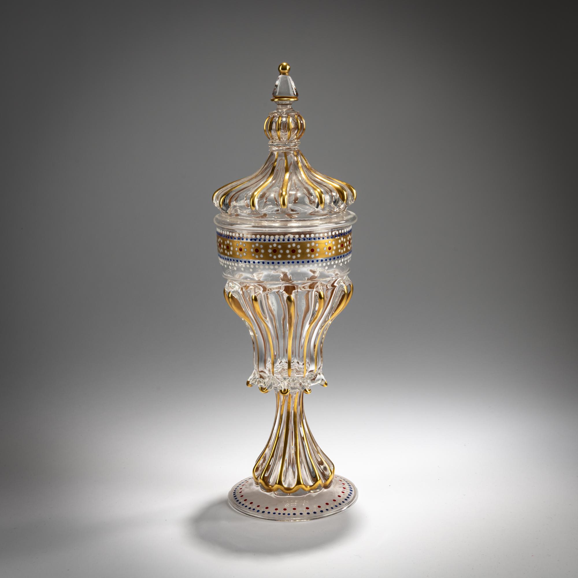 H. 30.5 cm. Colorless glass, polychrome enamel drops and gold bands.