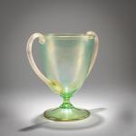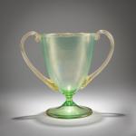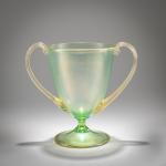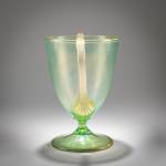 Model No. 4030. H. 22 cm. Delicate green and colorless glass, partially with finely shattered gold foil, iridescent.