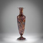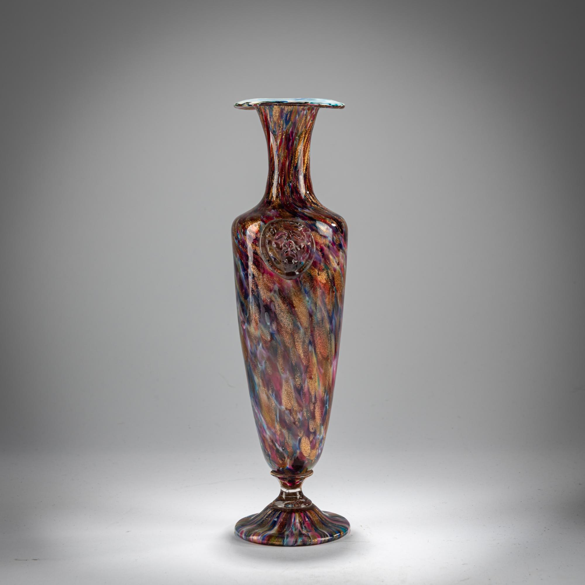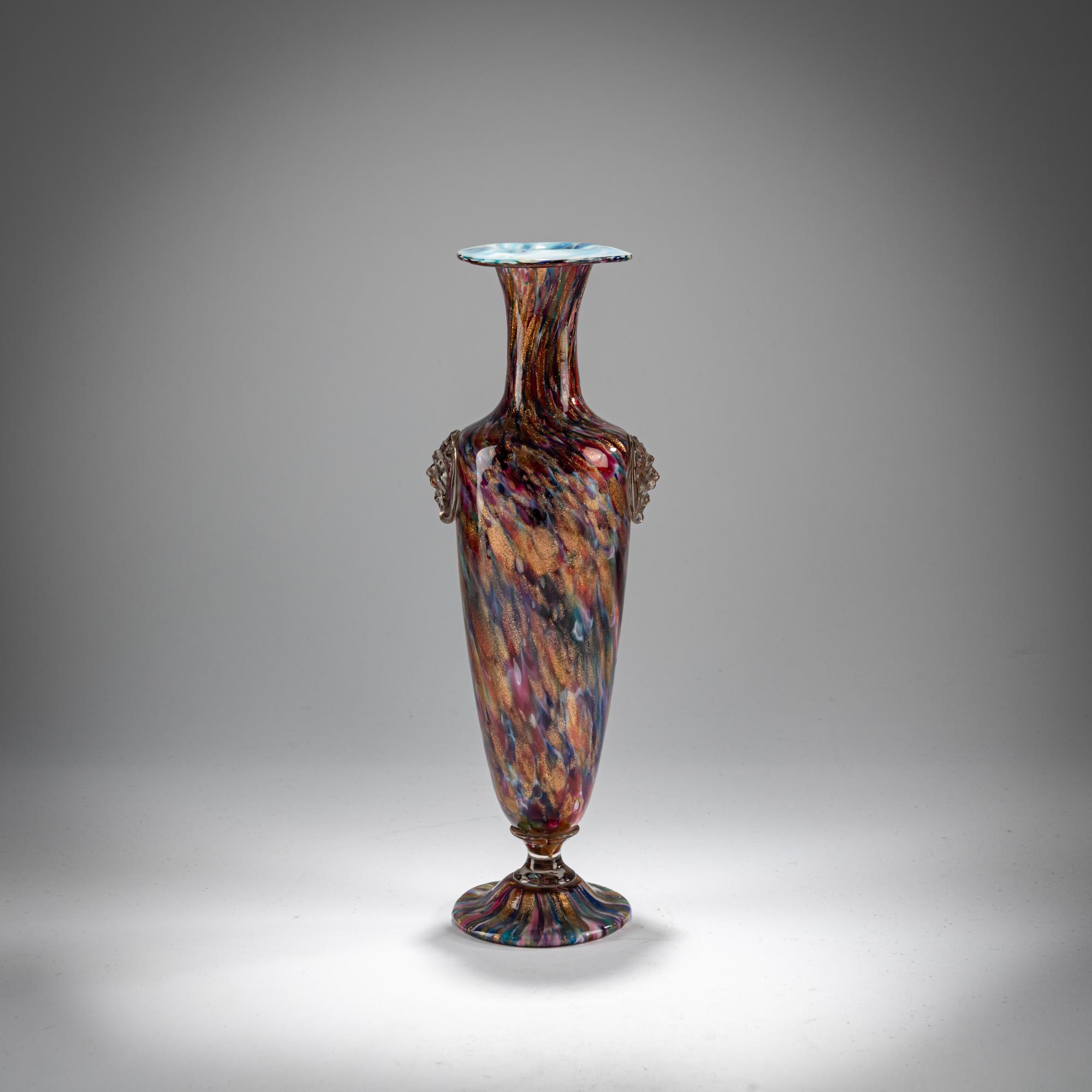 H. 25.6 cm. Overlaid glass, colorless and milk white, with polychrome powder inclusions and aventurine inclusions. Lion masks of colorless glass applied to two sides.