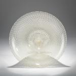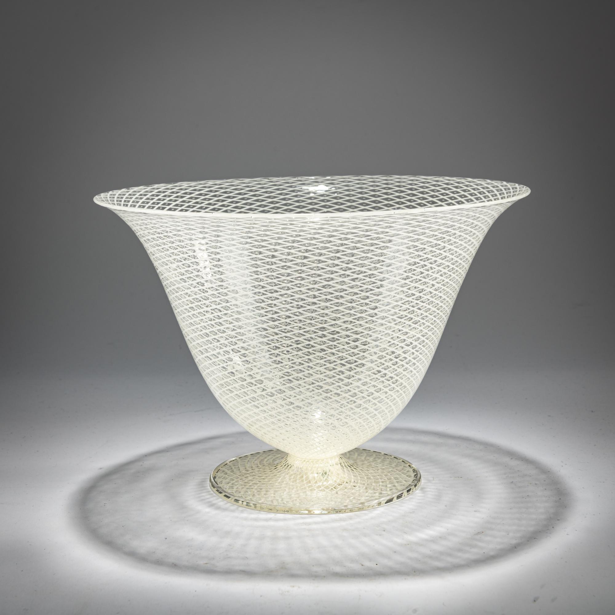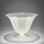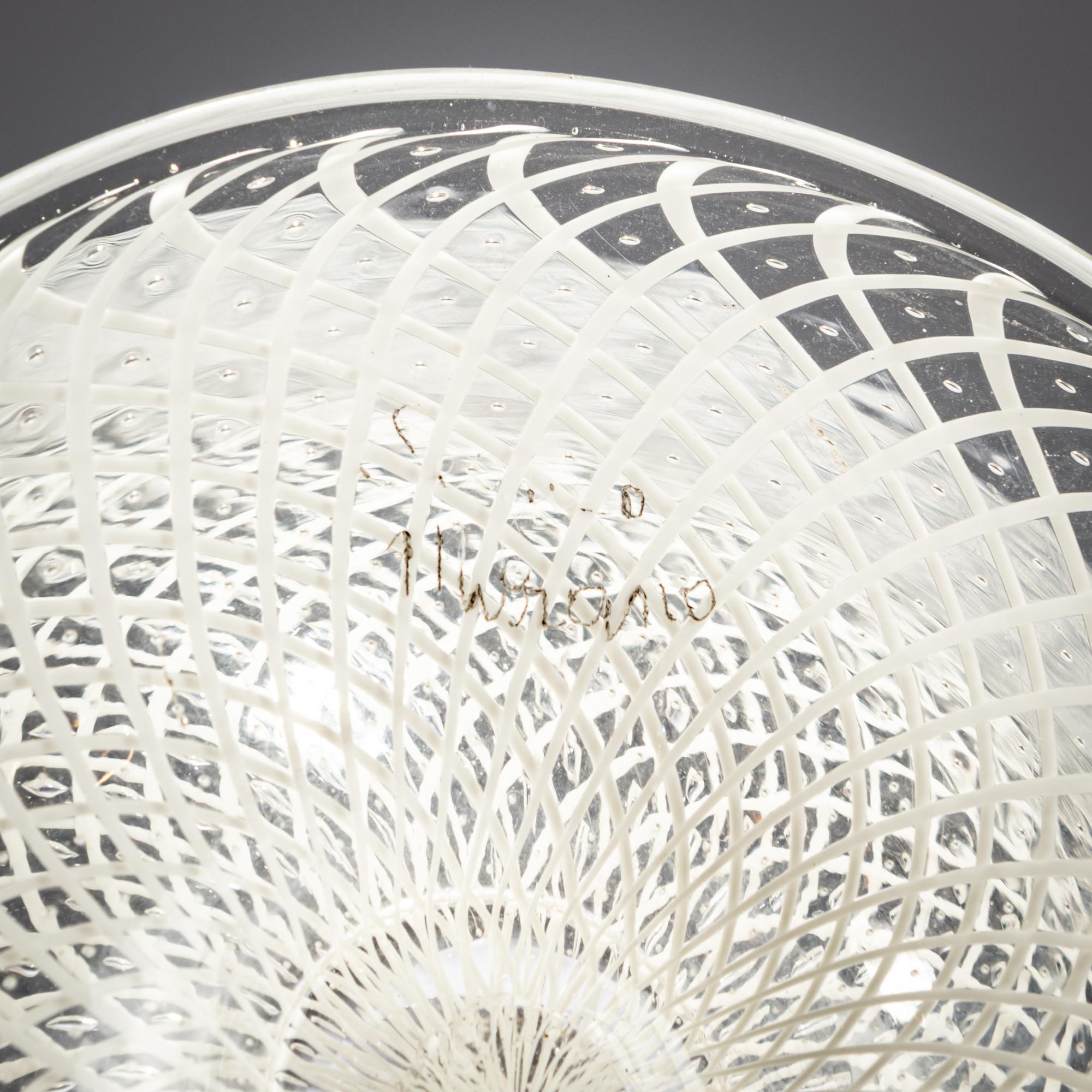 Model No. 7783. H. 15.3 cm, Ø 22 cm. Colorless glass with opal white thread inclusions. Bottom marked: Seguso Murano (engraved and darkened).