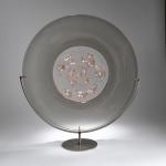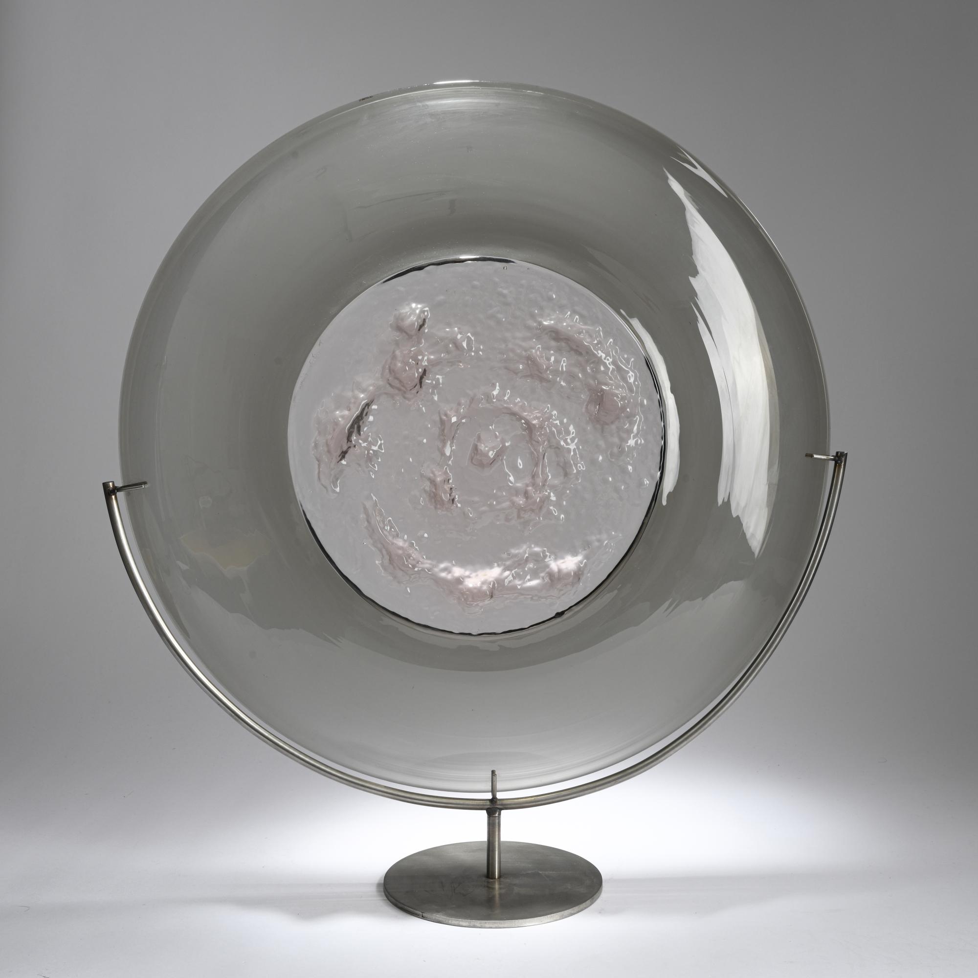 Ø 49 cm. Execution: Venini. Cased glass, colorless and pale gray and pink, irregularly shaped towards the bottom. Marked: venini italia tw (engraved). Metal stand.