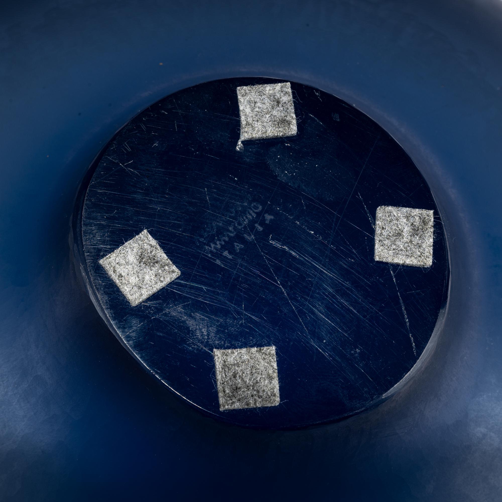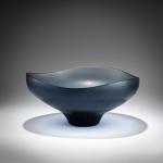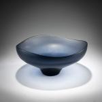 Model No. 8505. H. 13 cm, Ø 28.5 cm. Execution: Venini. Overlaid glass, colorless and blue. Matt-ground, textured surface. Marked: venini murano ITALIA (three-line acid stamp).