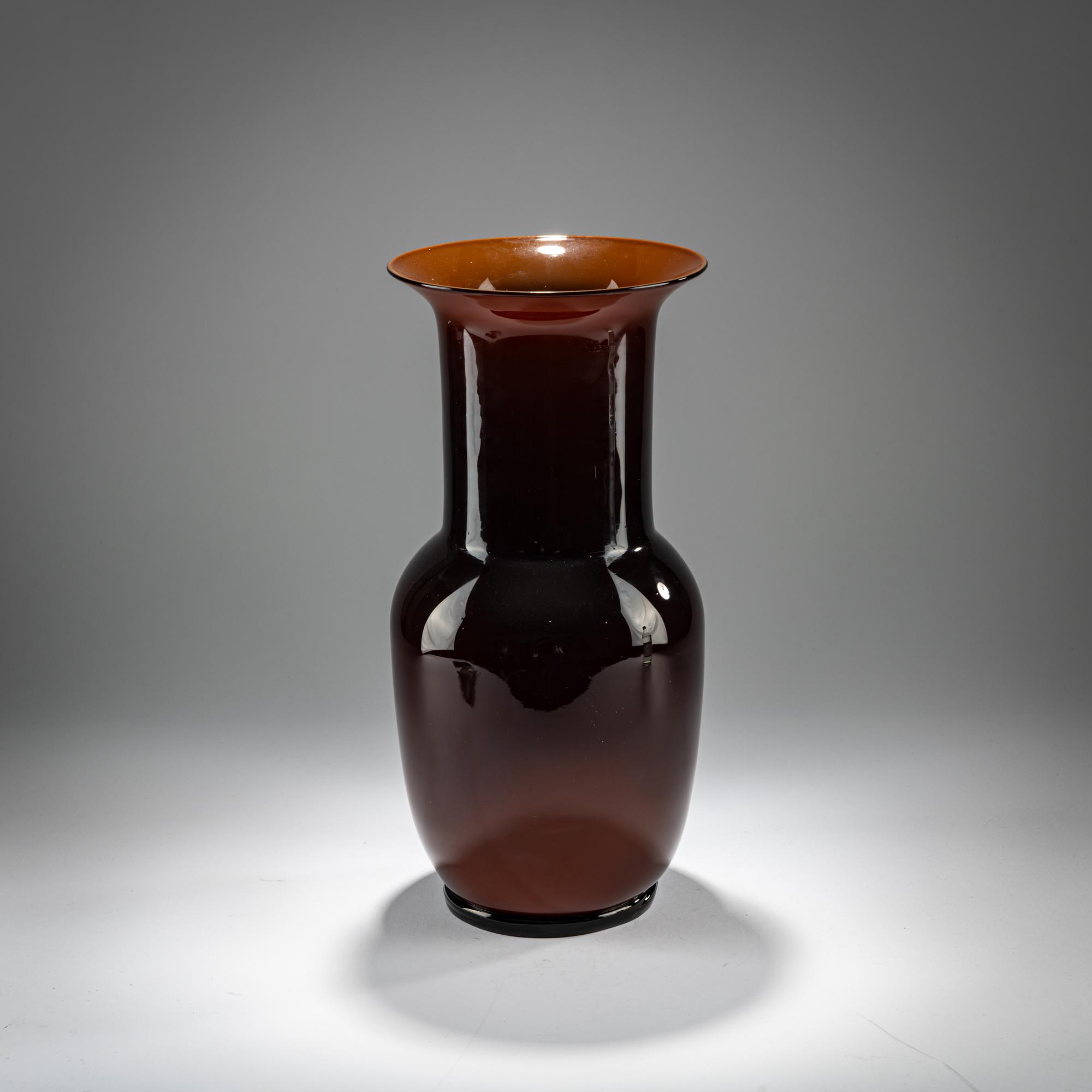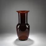 H. 37 cm. Overlaid glass, brownish-red and opalescent white. Base adorned with violet glass. Marked: Remnant of a manufacturer's label.