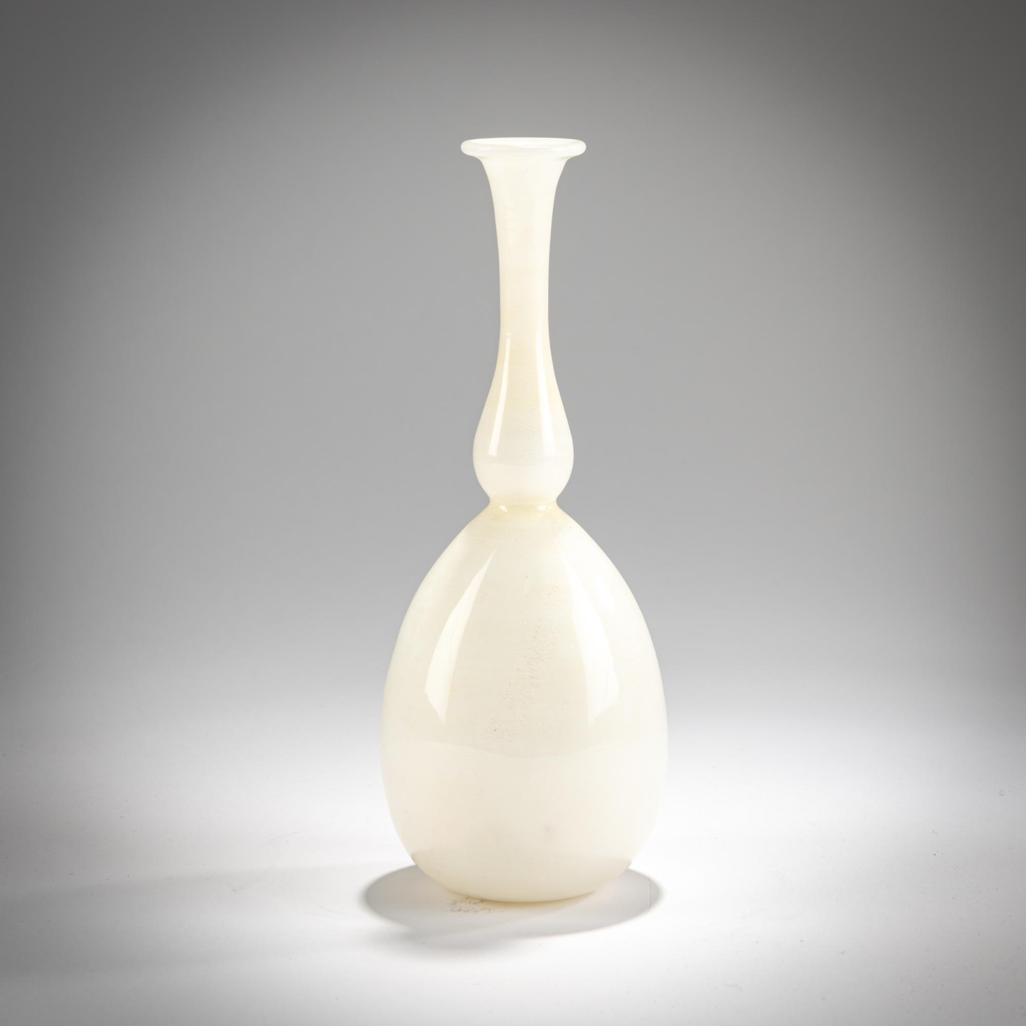 Model No. 1787. H. 20 cm. Execution: Venini. Overlaid glass, opal white and colorless. Marked: venini murano (two-line acid stamp).