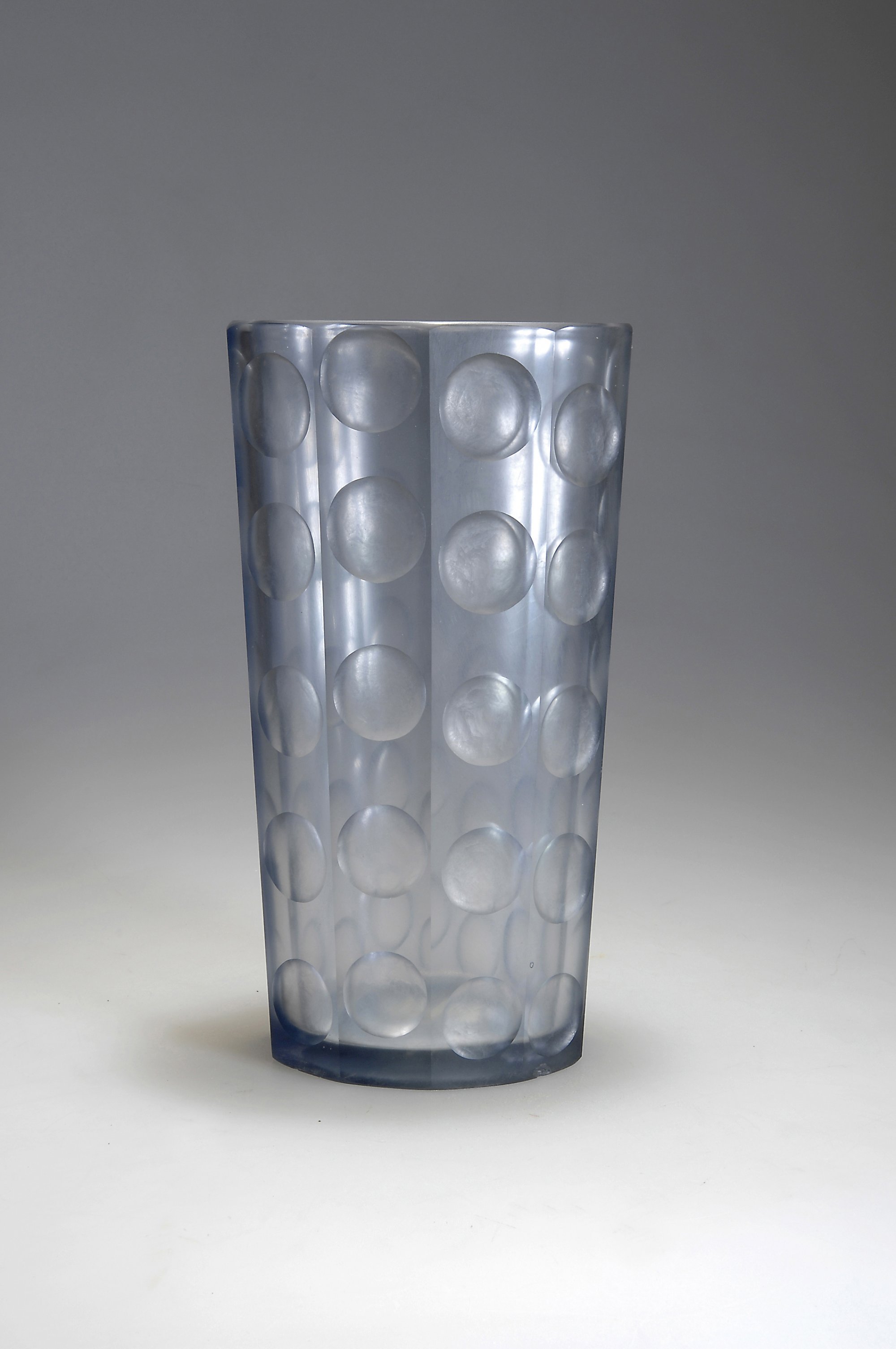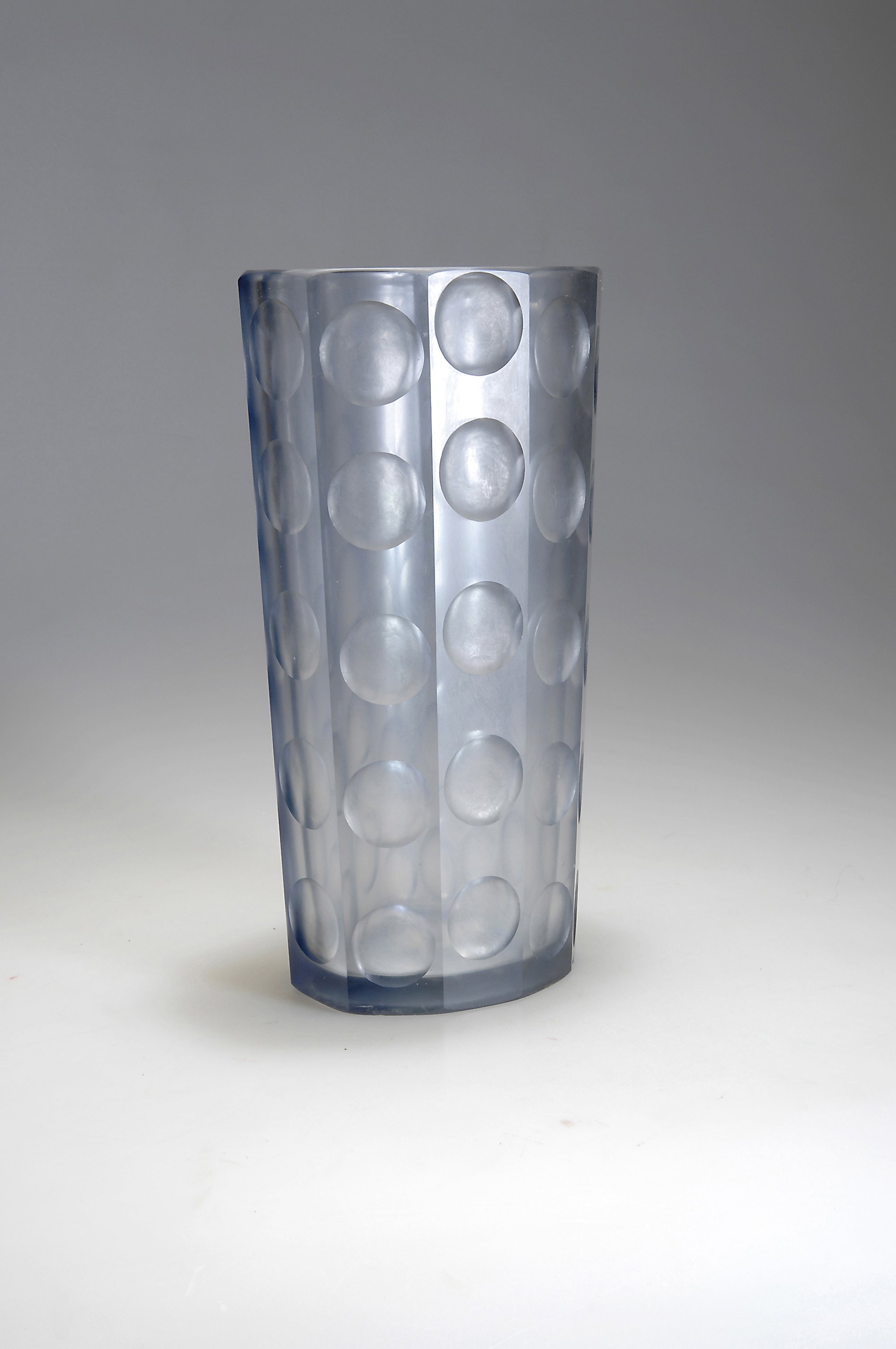 H. 28.7 cm. Made by Venini & C.; engraving: Franz Pelzel. Grey coloured glass, worked with the wheel, with five ball-cuts on each of the ten sides. Marked: venini murano ITALIA (acid stamp).