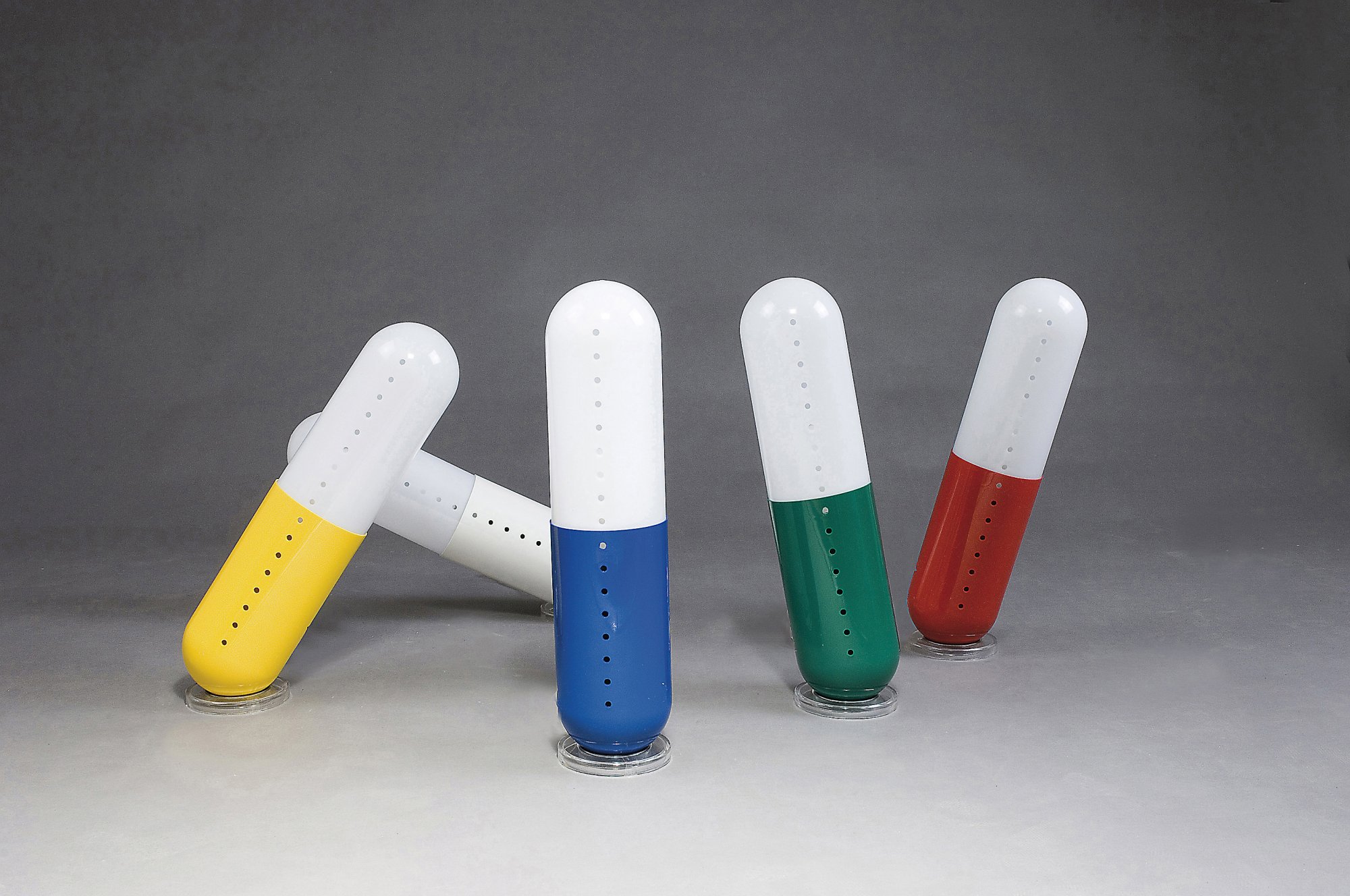 Cesare Casati, Emanuele Ponzio, Studio D. A. Five 'Pillola'-Lamps, 1968. H. 55 cm; D.13 cm. Made by Nai Ponteur, Bergamo. ABS-plastic material and acrylic, blue, red, yellow, white and green. Marked: Collezione nai design studio D.A.