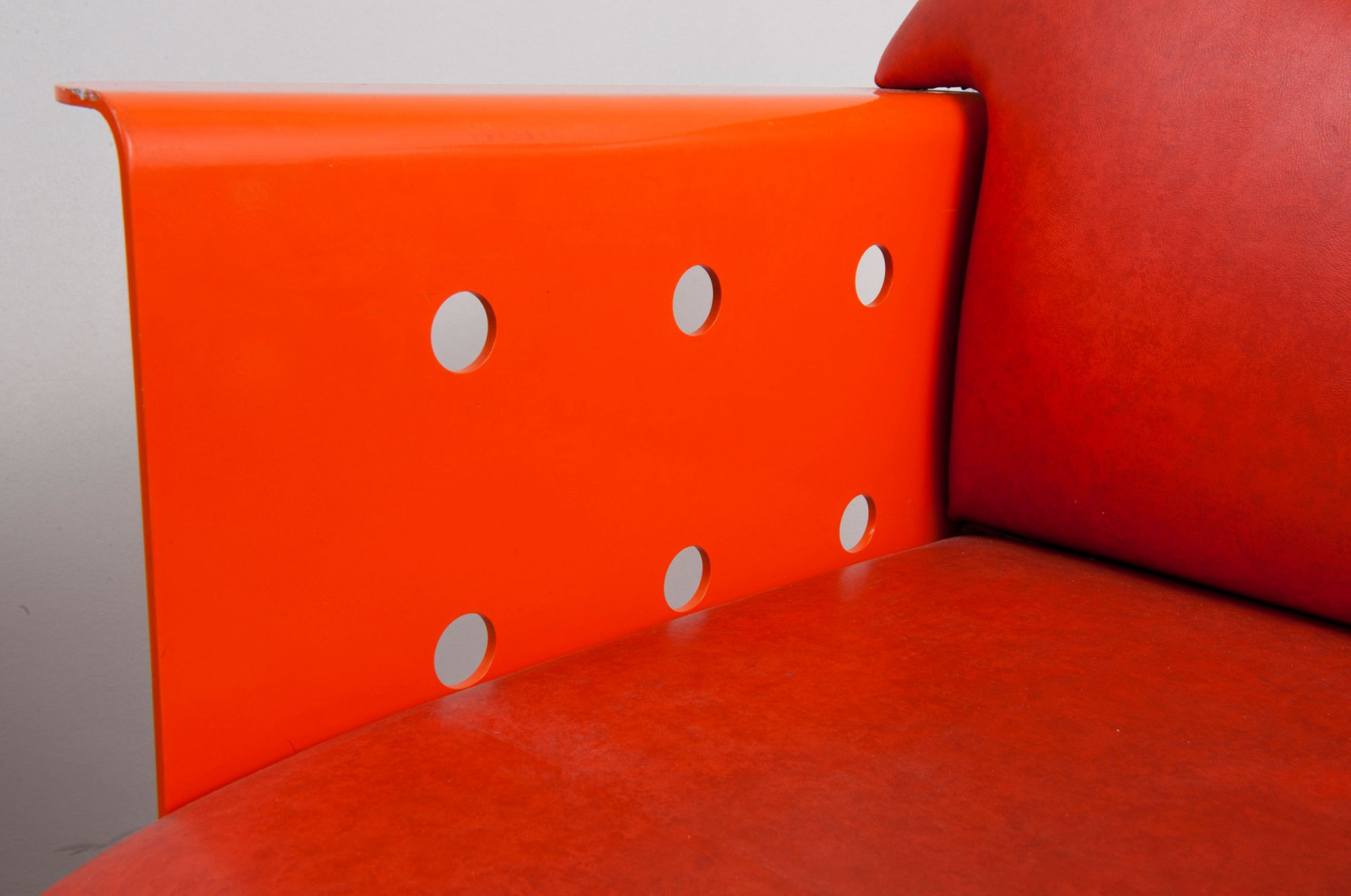 Christian de Portzamparc. 'Café Beaubourg' armchair, designed c1987. H. 82 x 71 x 58 cm. Made in France. Aluminium sheet, painted orange-red, orange-red leatherette.
