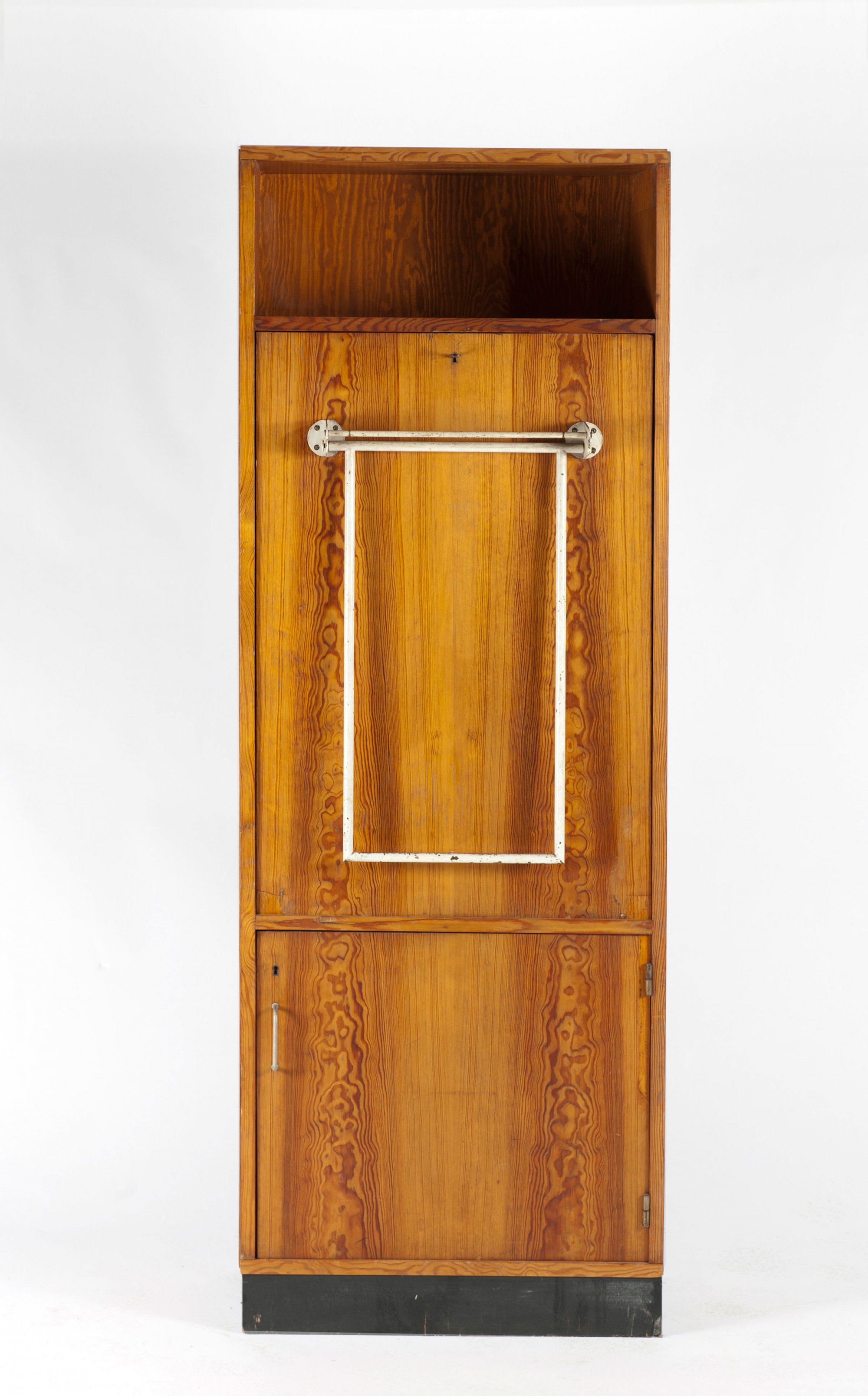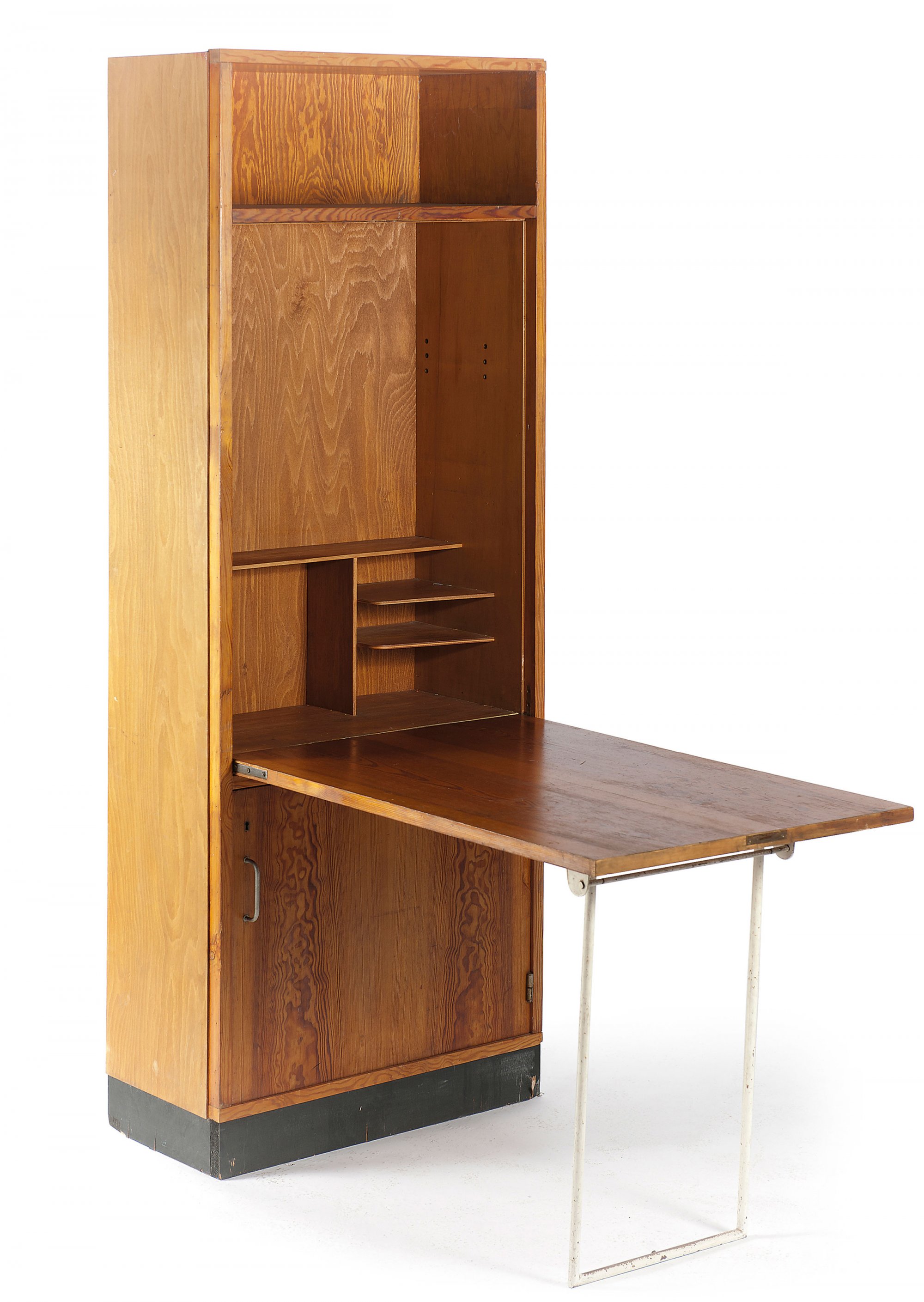 Egon Eiermann. Secretary from the Vollberg manor, designed in 1940/41. H. 203 x 73 x 36.5 cm. Blockboard with elm veneer, elm, tubular steel, painted white.
