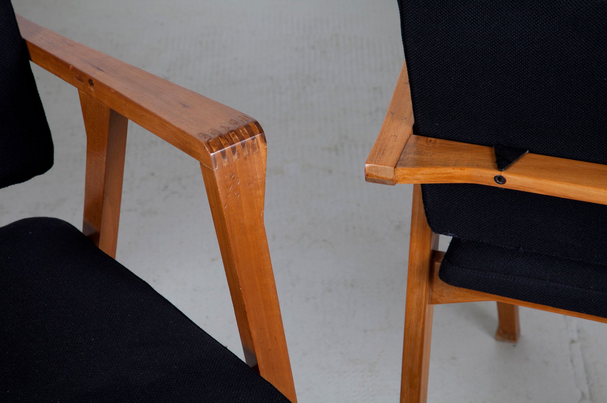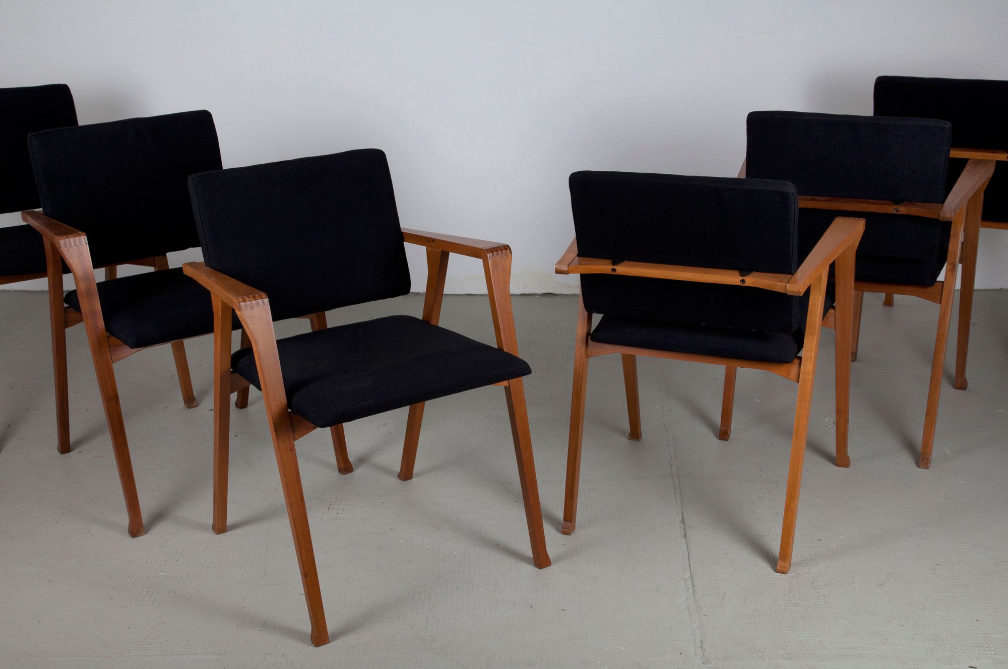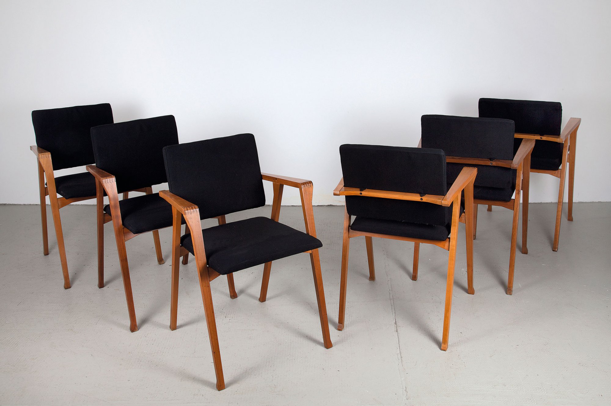 Franco Albini; Franca Helg. Six 'Luisa' chairs, designed circa 1950. H. 77 x 55.5 x 53 cm. Made by Poggi, Pavia. Nutwood, black fabric upholstery.