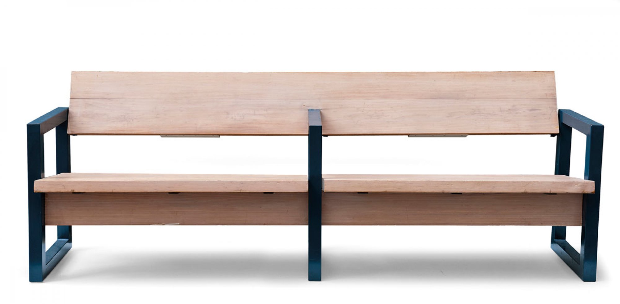 Gerrit Th. Rietveld. 'De Hoeksteen' church bench, designed in 1963. H. 78 x 218 x 63 cm. Made in the Netherlands, c1963. Rectangular metal, painted grey-blue, seat and back of 'Parana' fir.