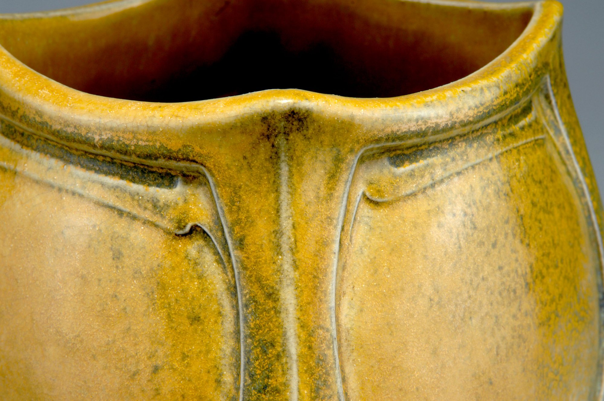 Henry van de Velde. Vase, circa 1903. H. 25.4 cm. Made by Reinhold Hanke, Höhr. Stoneware, reliefed. Yellowish glaze, slightly crystalline grey-blue. Marked: Designer's signet, model no. 2021.