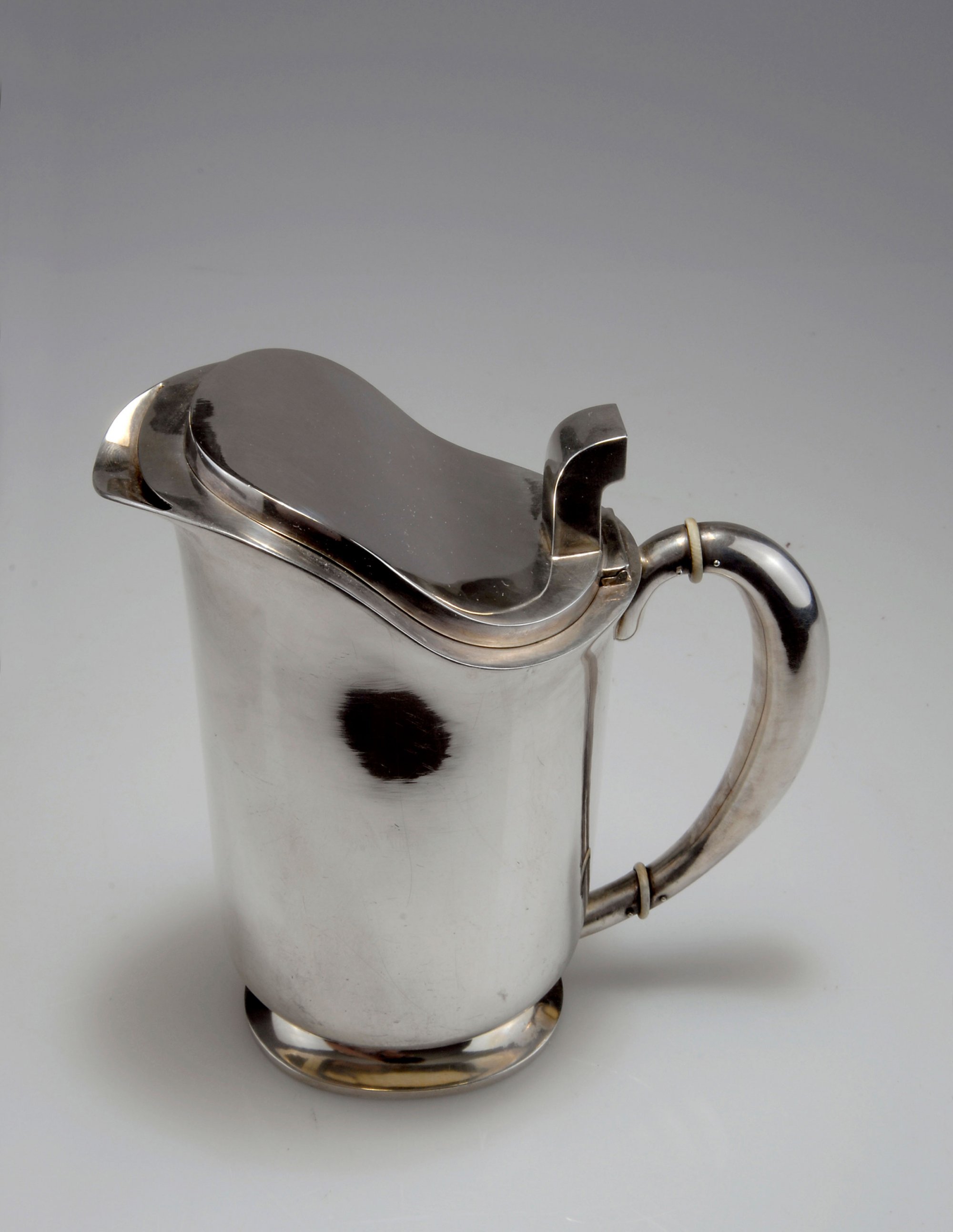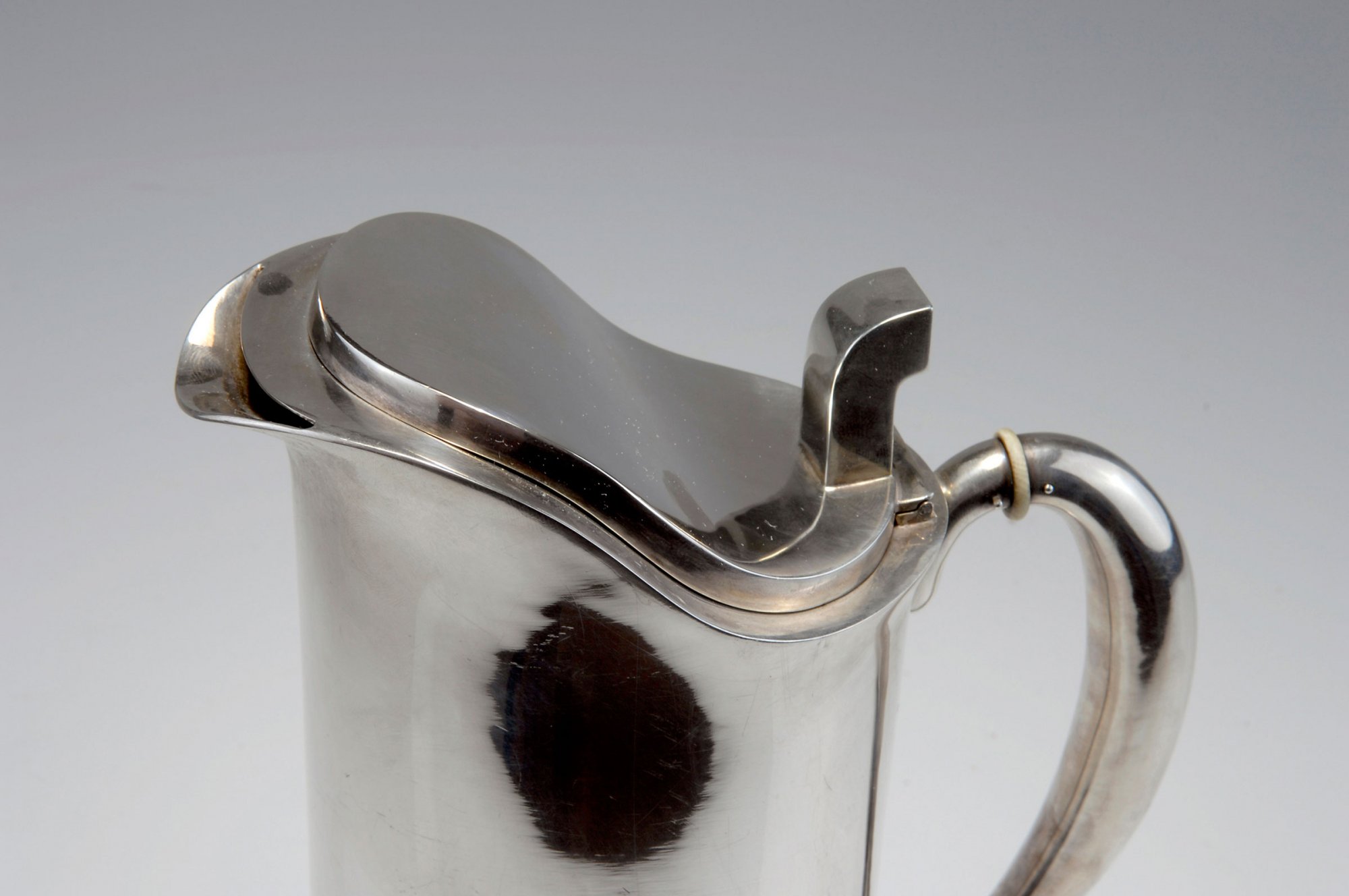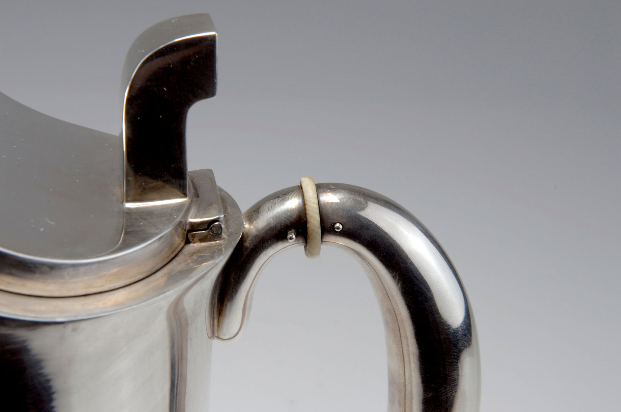 Hugo Leven. Coffeepot, circa 1929. H. 21.5 cm. Made by Kreuter & Co., Hanau. Silver, ivory isolators, inside gilt. Marked: 925, German hallmarks, maker's mark, HANDARBEIT.