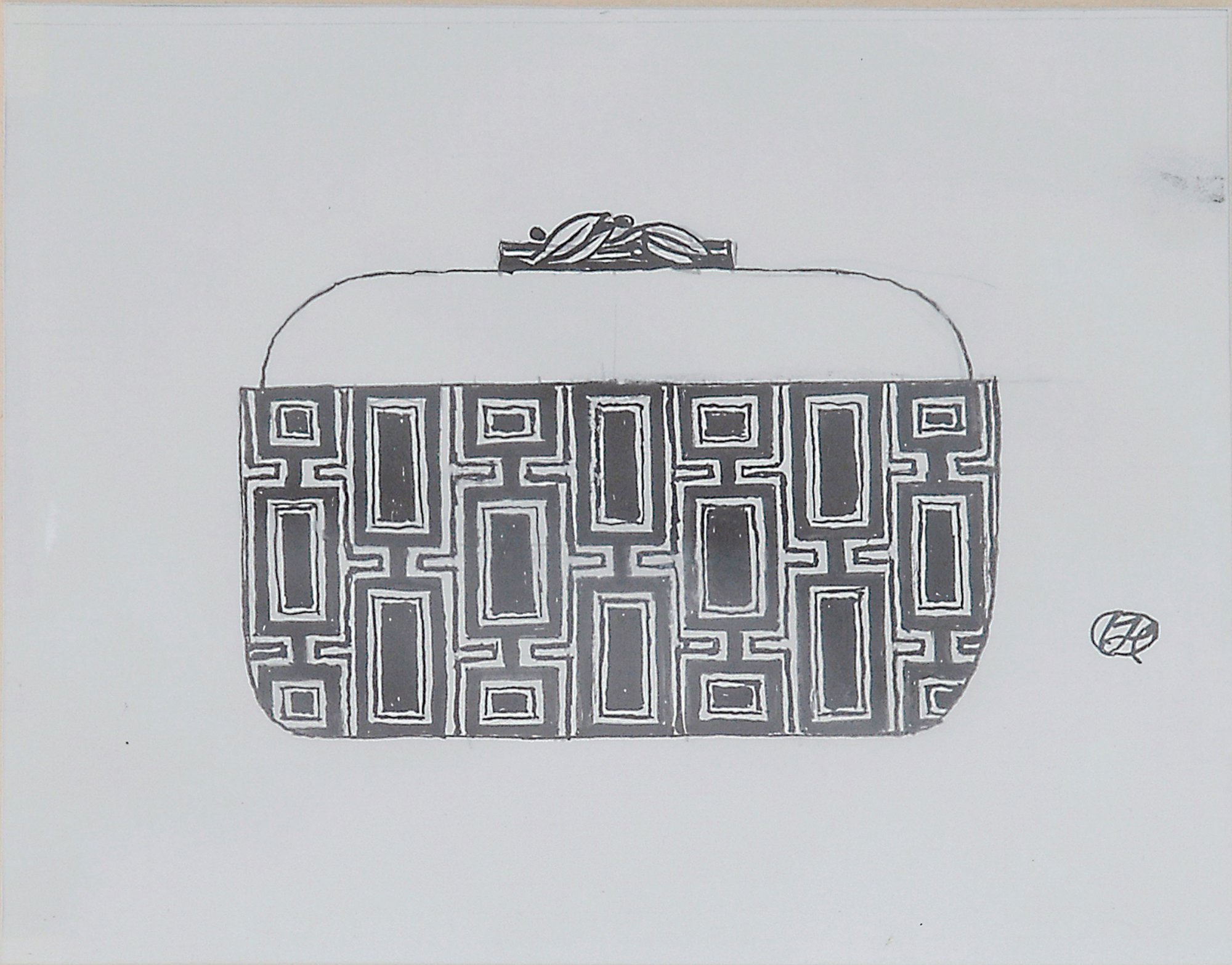 Josef Hoffmann. Sketch of a box, 1920s. 20.4 x 17 cm. Ink on pencil on squared paper. Signed: Designer's signet. Back with stamp: OBERBAURAT PROF. ARCH. FR. h.c. JOSEF HOFFMANN. Glass frame.