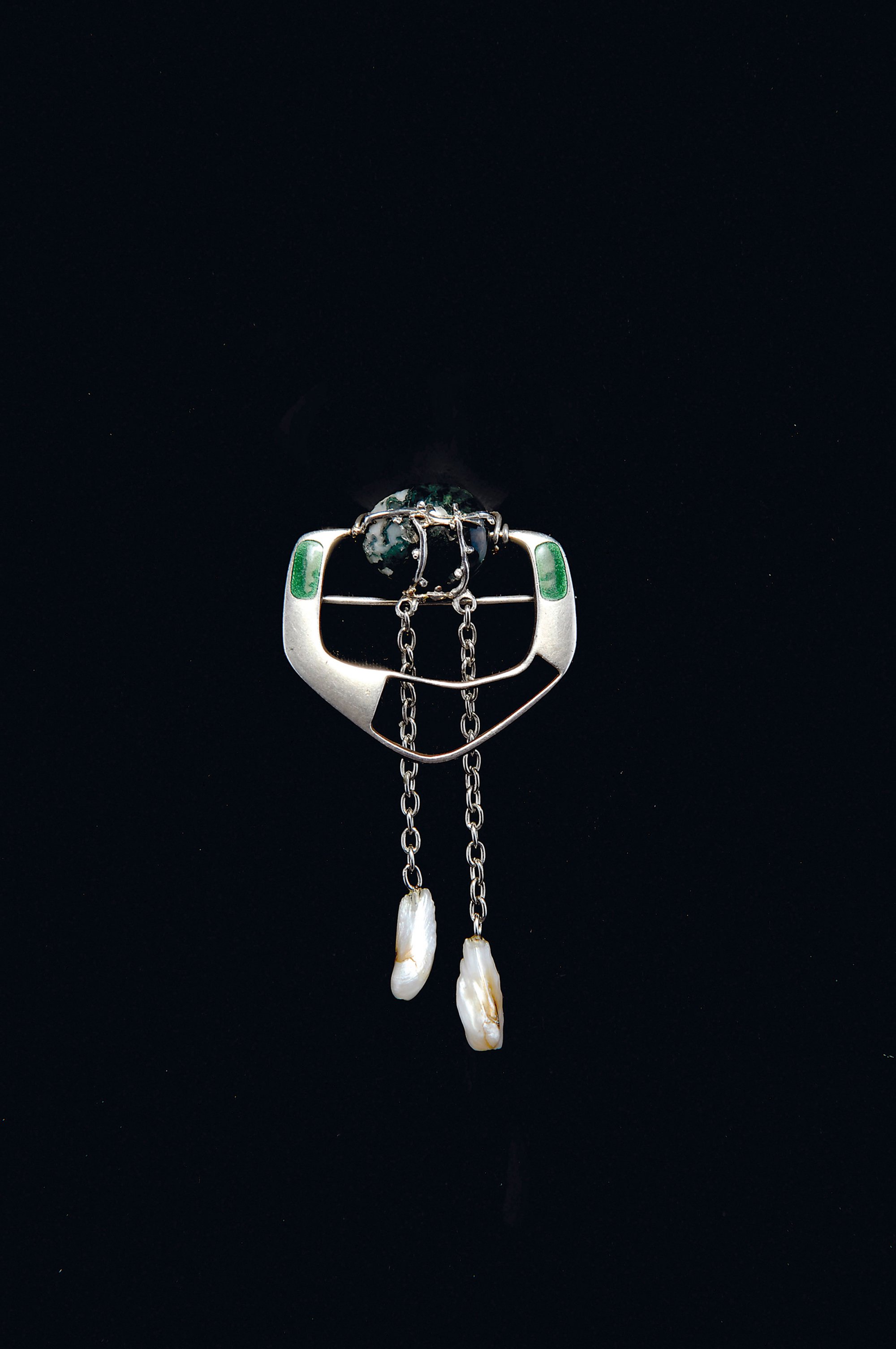 Joseph Maria Olbrich (surroundings). Needle, circa 1902. 5.8 x 3 cm. Made by Theodor Fahrner, Pforzheim. Silver, green enamel, two pearls, moss agate. Marked: TF 935 DEPOSE.