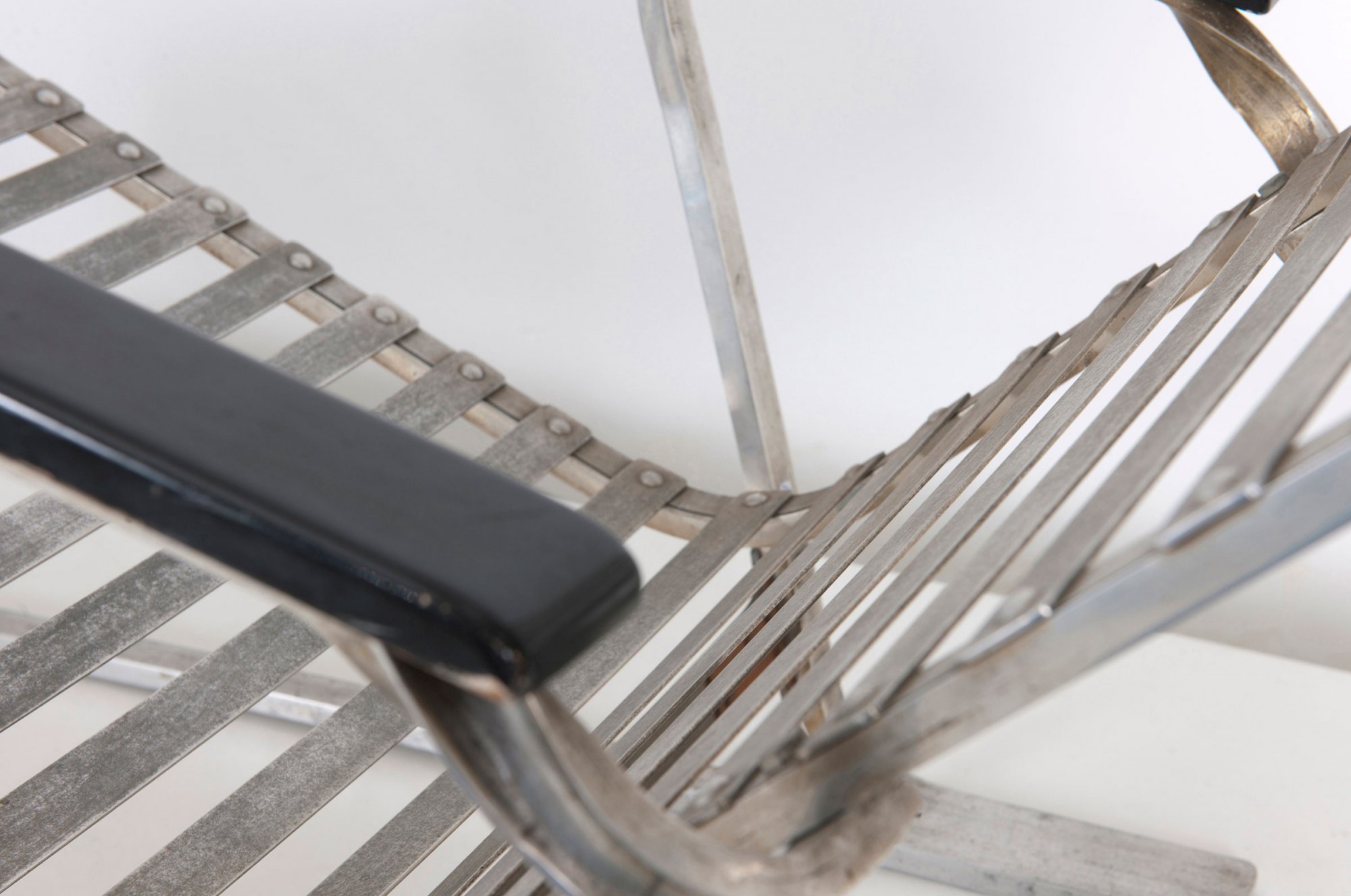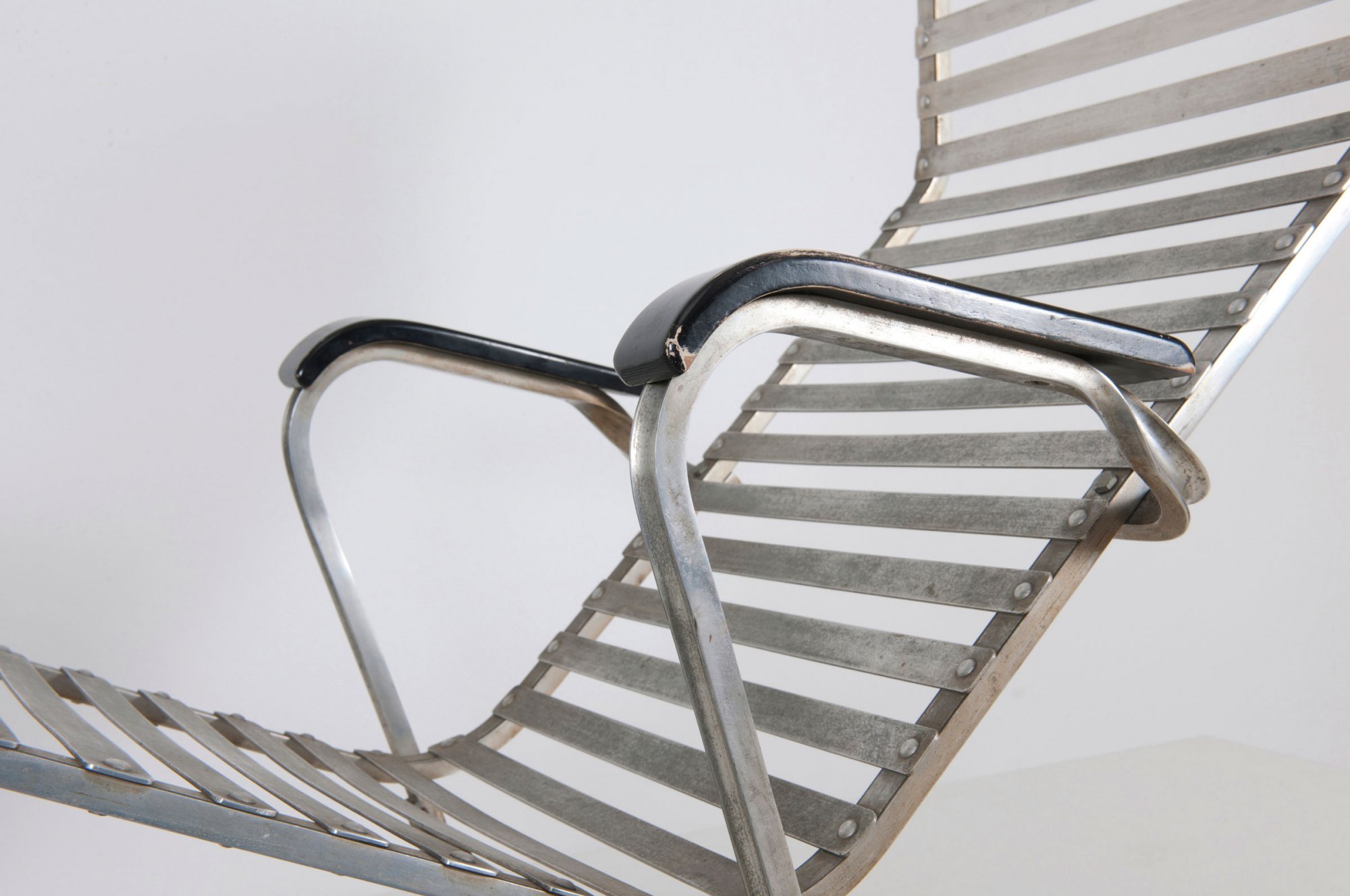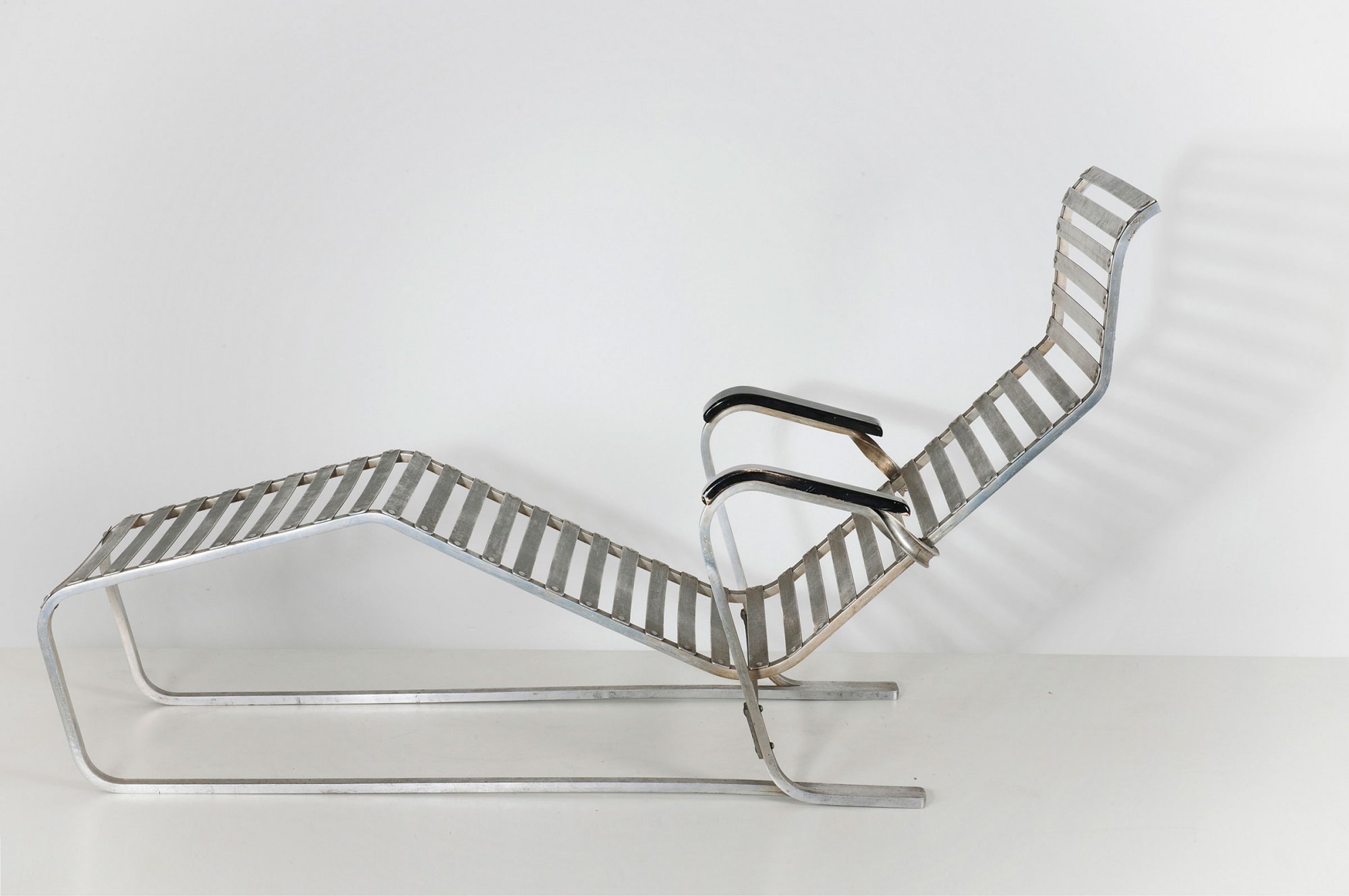 Marcel Breuer. '313' long chair, designed in 1932-34. H. 75 x 138 x 56 cm. Made by Embru-Werke, Rüti for Wohnbedarf AG, Zurich. Aluminium (Anticorodal), wooden armrests, painted black.