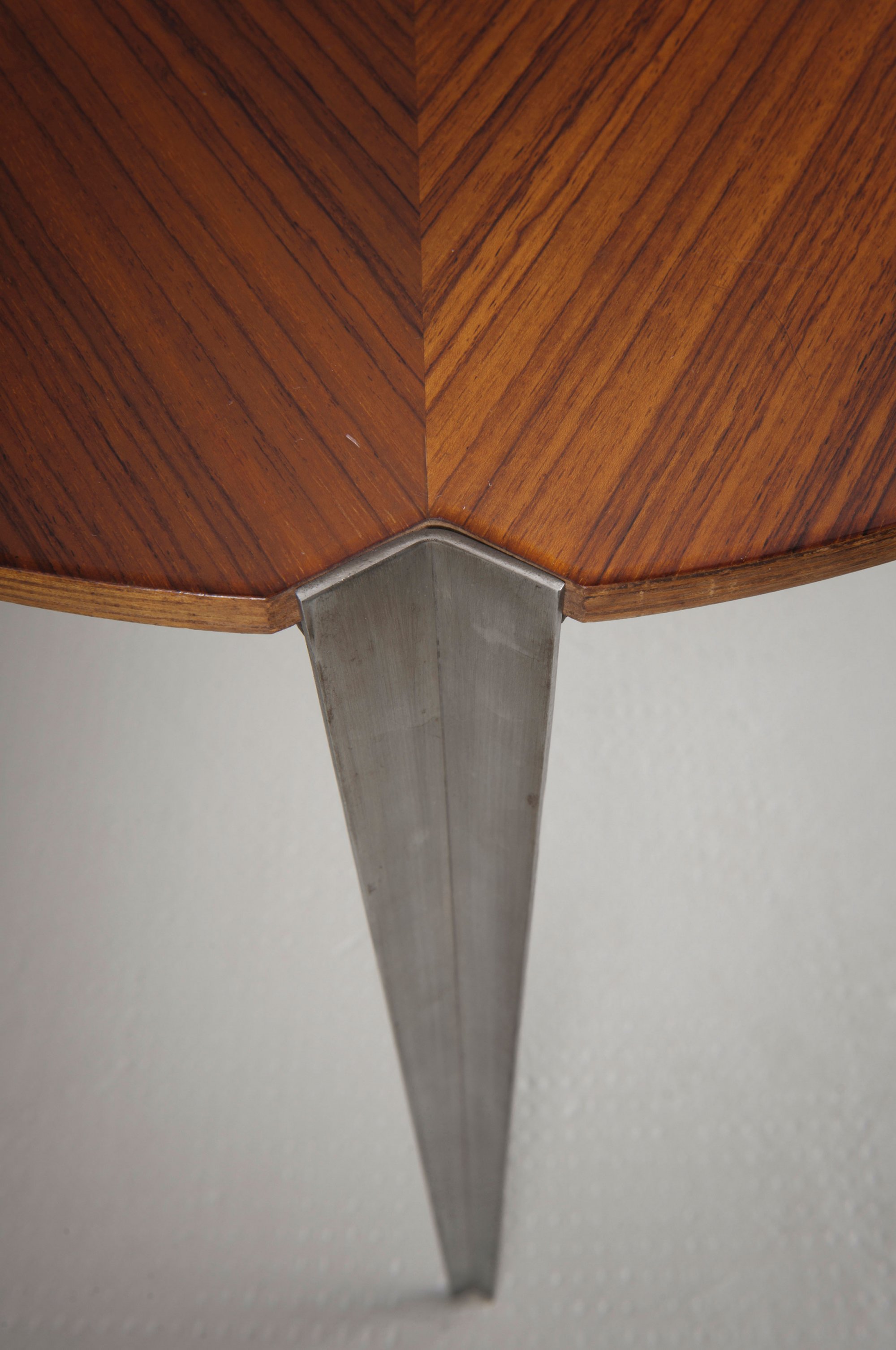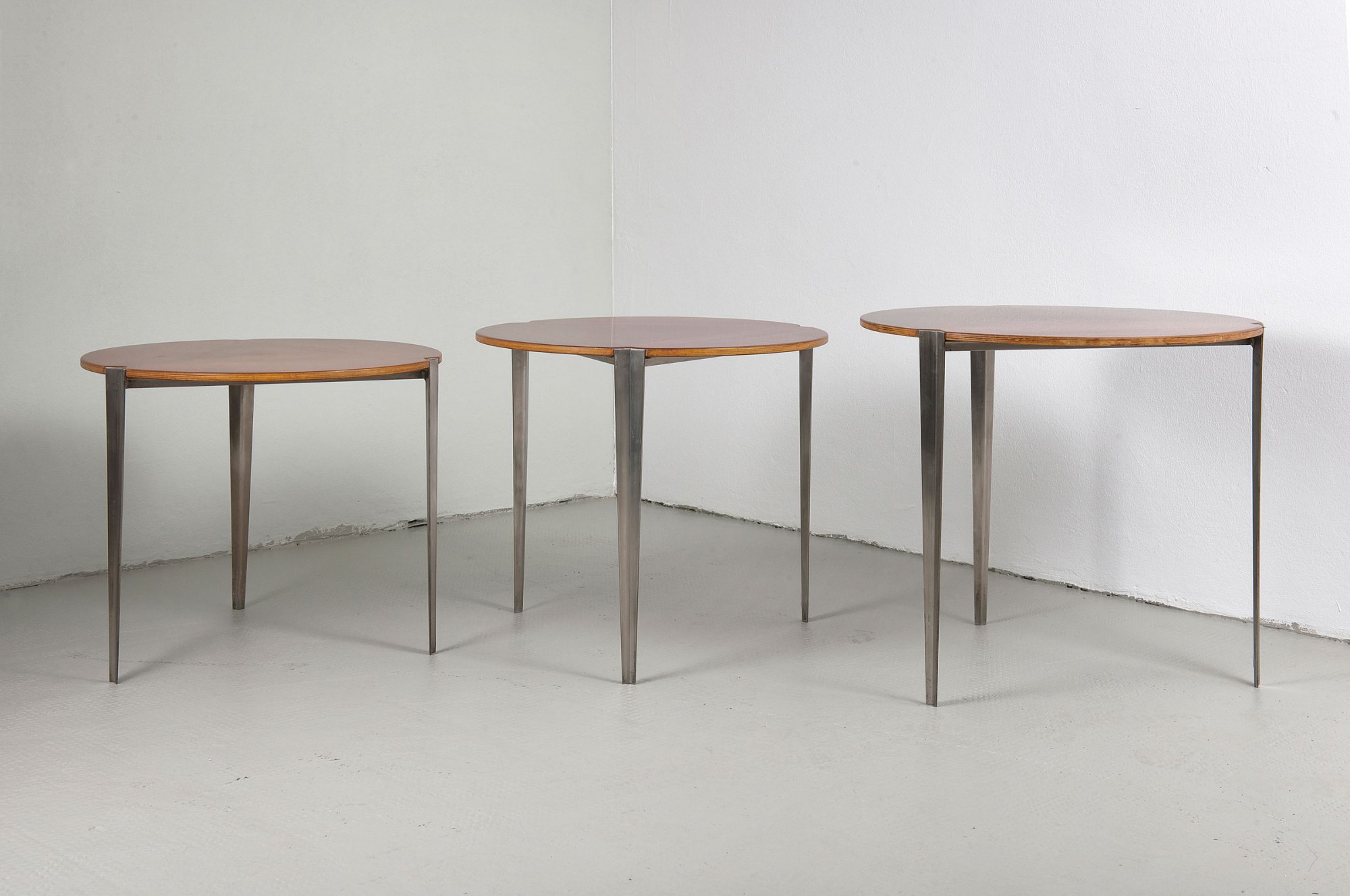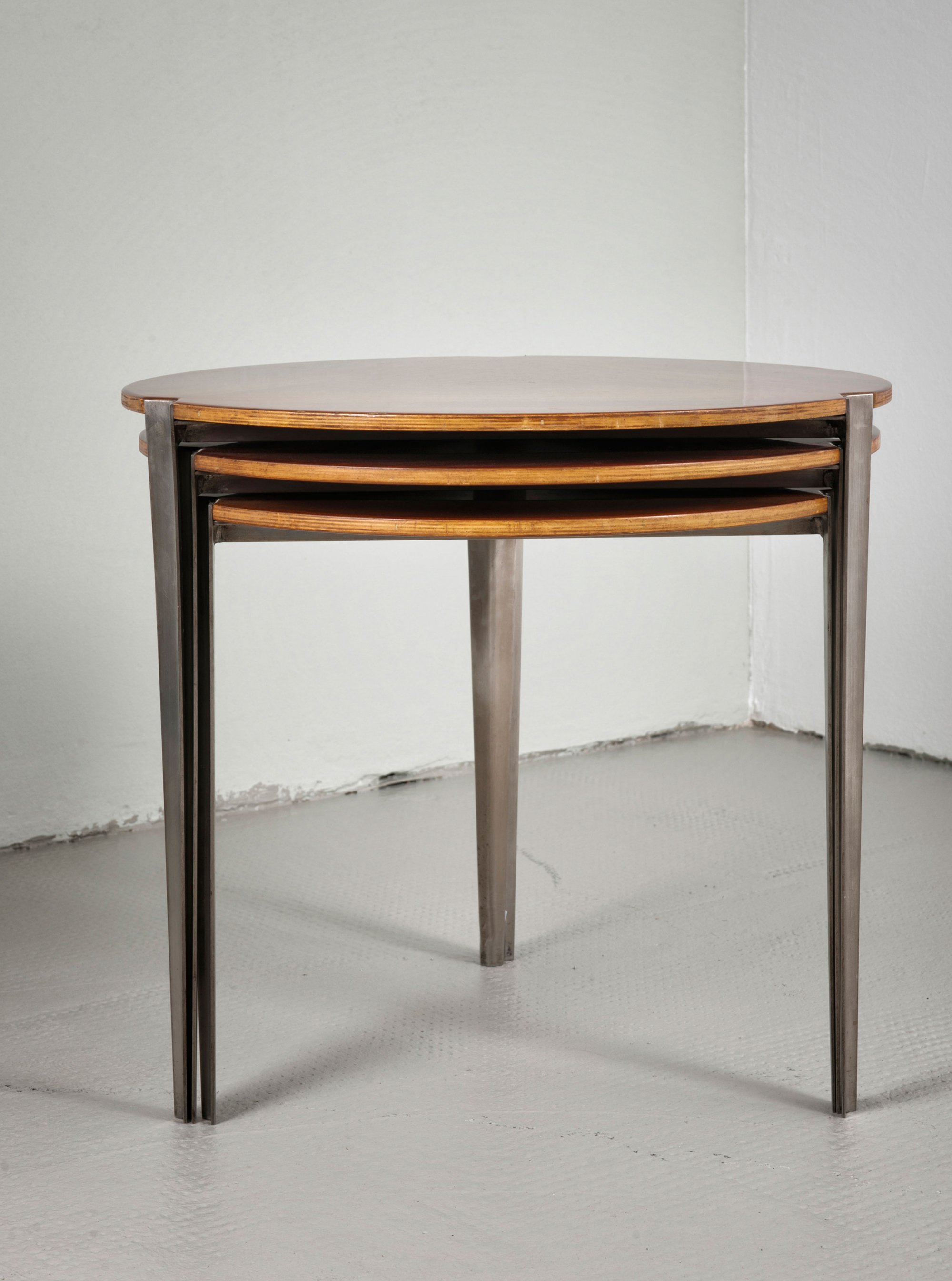 Osvaldo Borsani. Three nesting tables 'T 61', designed 1957. H. 39-45 cm; D. 46-49.5 cm. Made by Tecno, Milan. Matt chromed steel, chipboard with rosewood and mahogany veneer.